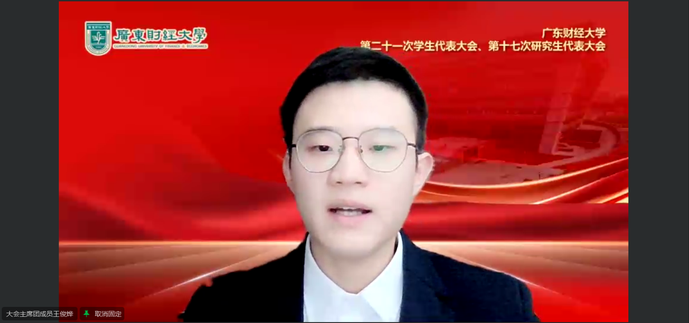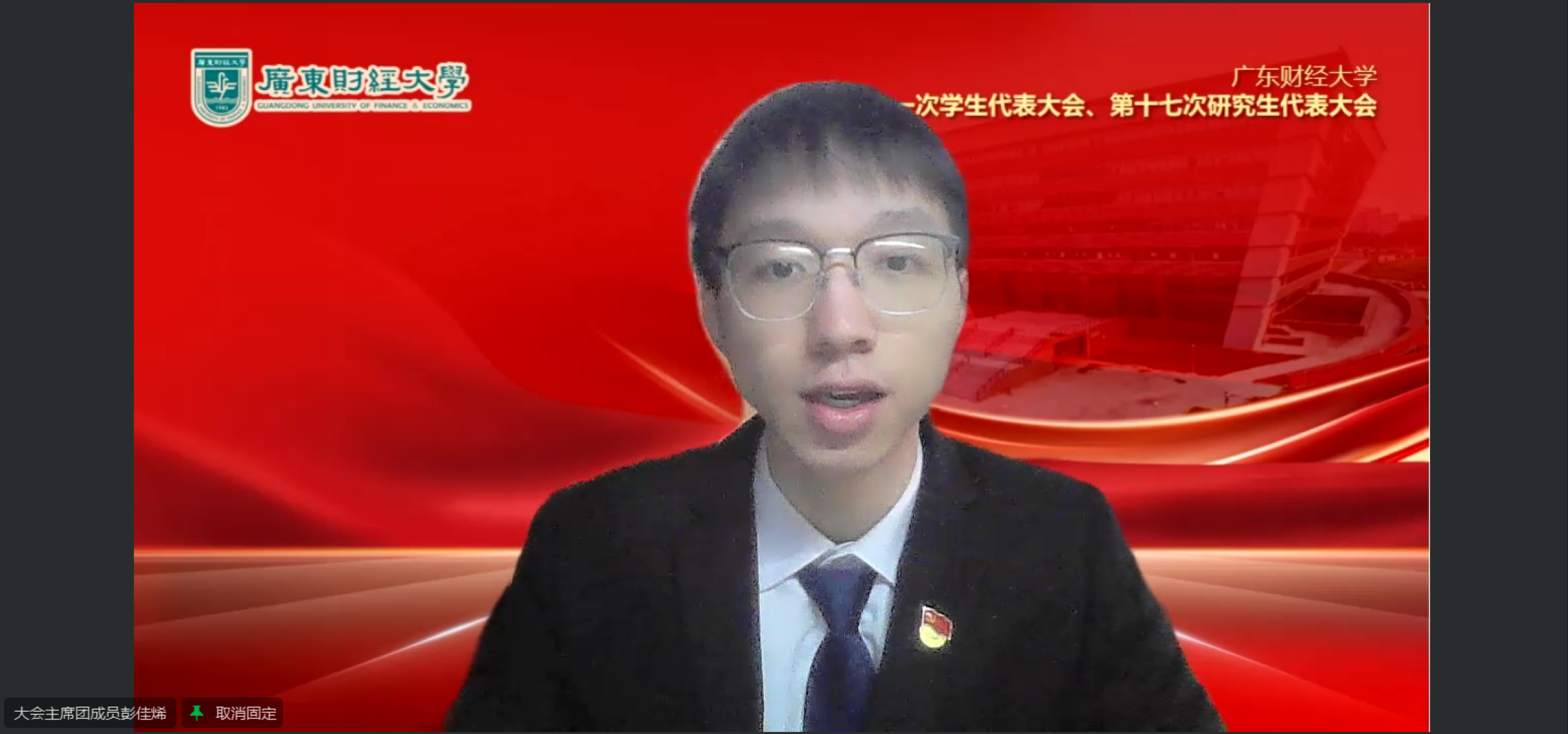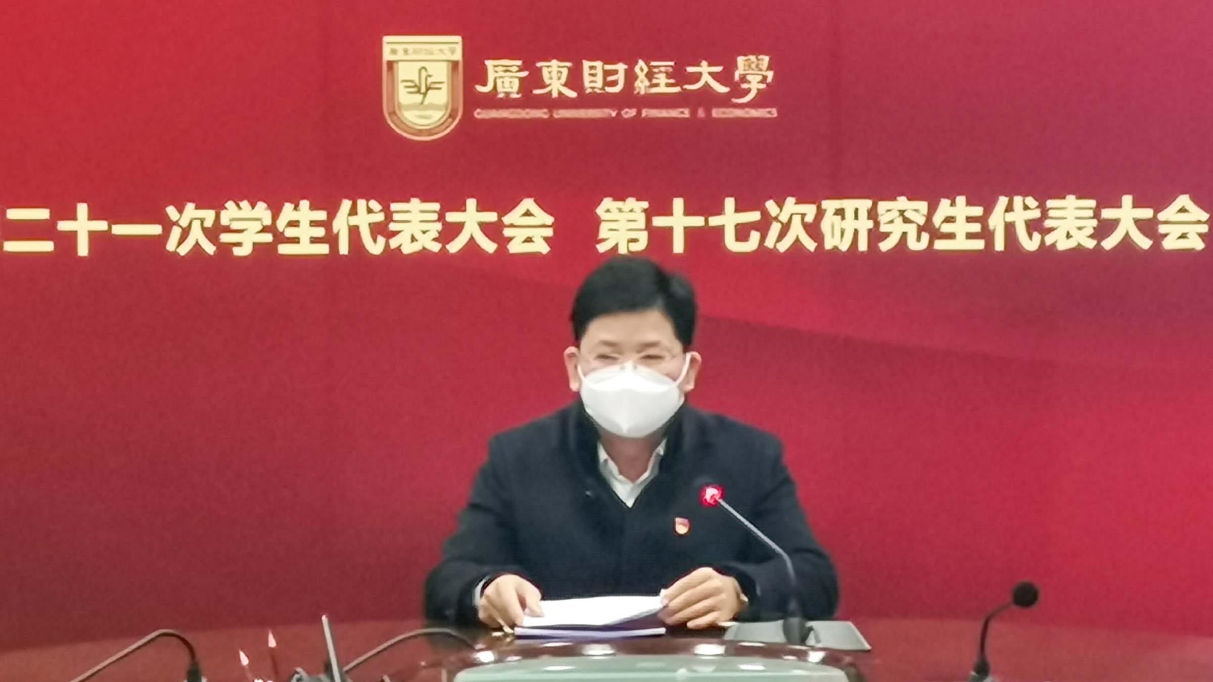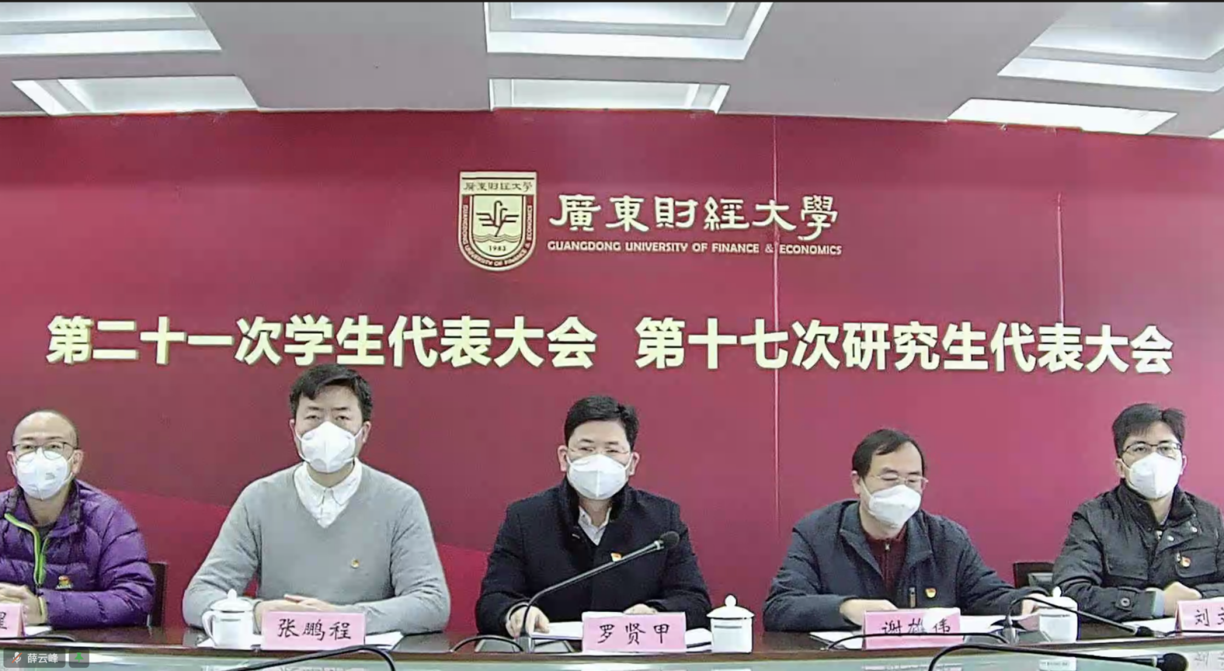 12月18日,广东财经大学第二十一次学生代表大会、第十七次研究生代表大会以线上线下相结合的形式顺利召开。303名本科生代表和45名研究生代表参加大会,共商发展、共谋未来。学校党委副书记罗贤甲、校党委研究生工作部部长谢雄伟、校团委书记张鹏程、校党委组织部副部长刘文基、校党委学生工作部副部长钟雄星出席会议。会议由大会主席团成员韦子兰主持。