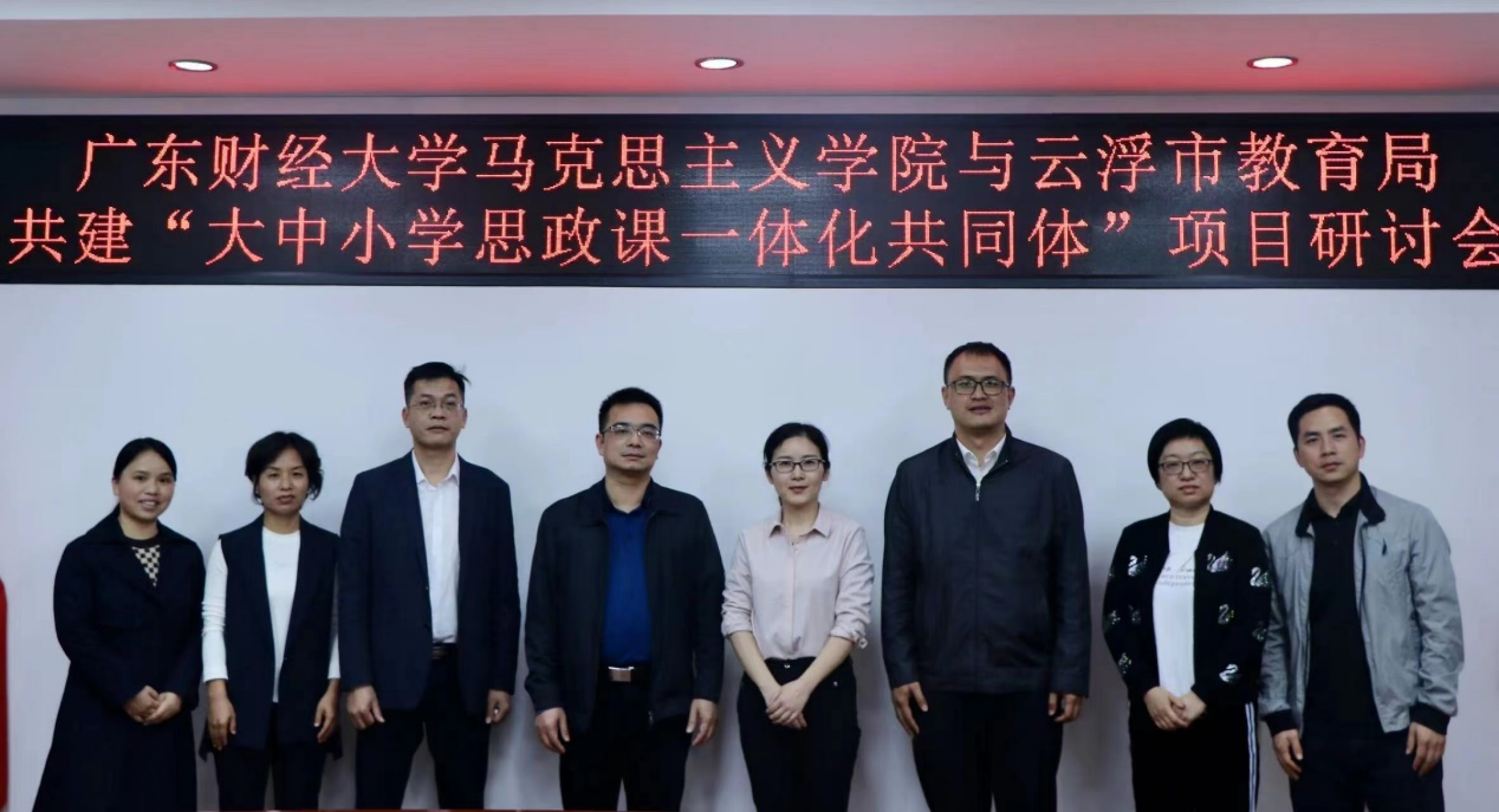 马克思主义学院一行与云浮市教育局召开了共建“大中小学思政课一体化共同体”项目研讨会,云浮市教育局副局长伍国强、政治教研员伍燕坤、陈蓉参加会议;与罗定市教育局召开了“大中小学思政课一体化共同体”共建研讨会,罗定市副市长梁祥源、罗定市教育局副局长练碧倩、教育局党组成员彭家福、罗定中学校长张创东、敏博实验学校董事肖梓明、泷州中学校长罗以森、罗定第一小学校长张汝辉以及四所学校的思政课一线教师进行了深入交流讨论。在两场研讨会上,与会人员紧紧围绕大中小学思政课一体化建设主题畅所欲言,从各学段课标、各学校实际出发,分享课题研究成果、改革创新思路、具体做法与成功经验,还就如何围绕中小学思政课内容设置、师资培训、课程体系等精准推动大中小学思政一体化建设落地见效,提出了意见和建议。