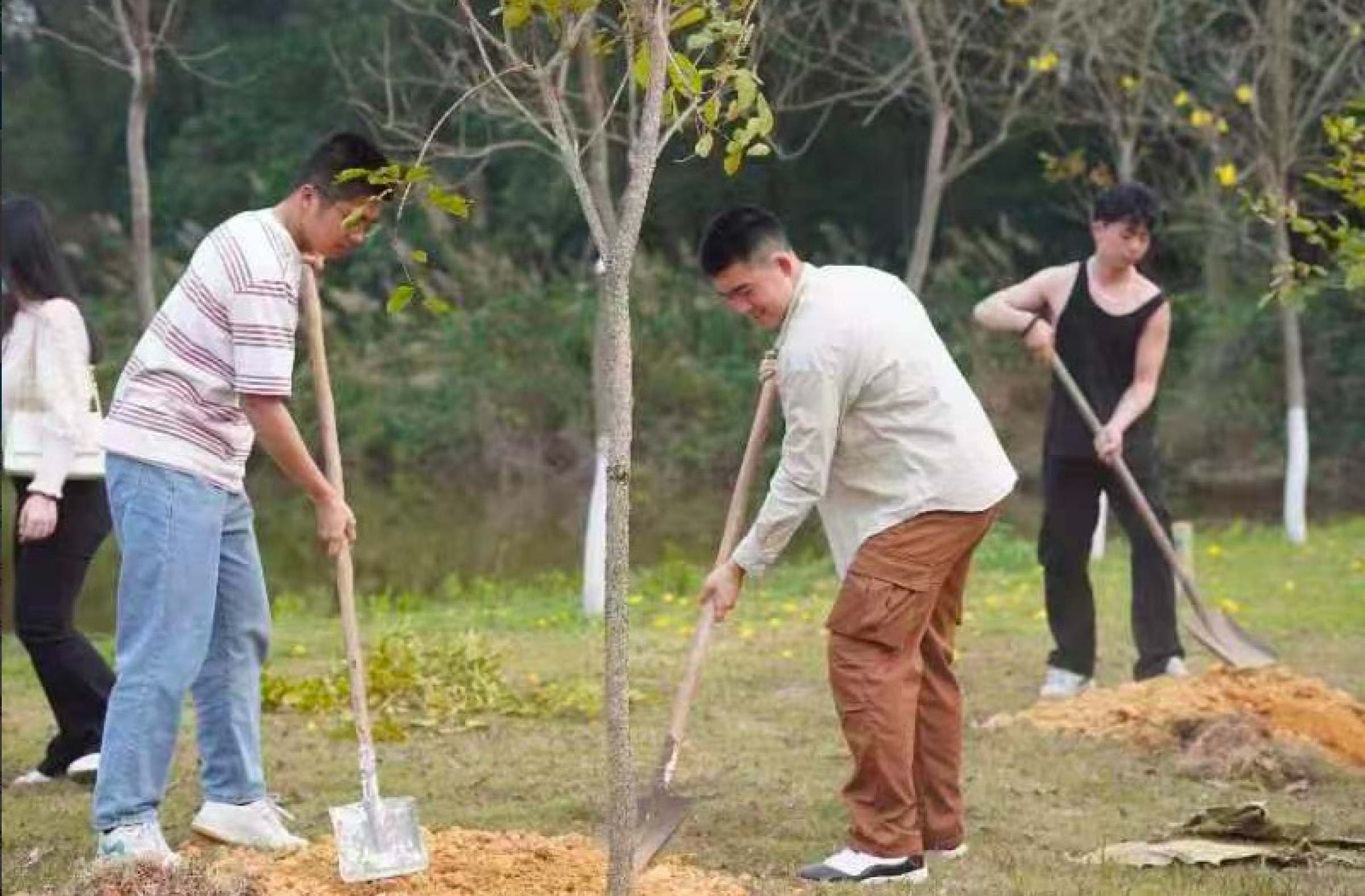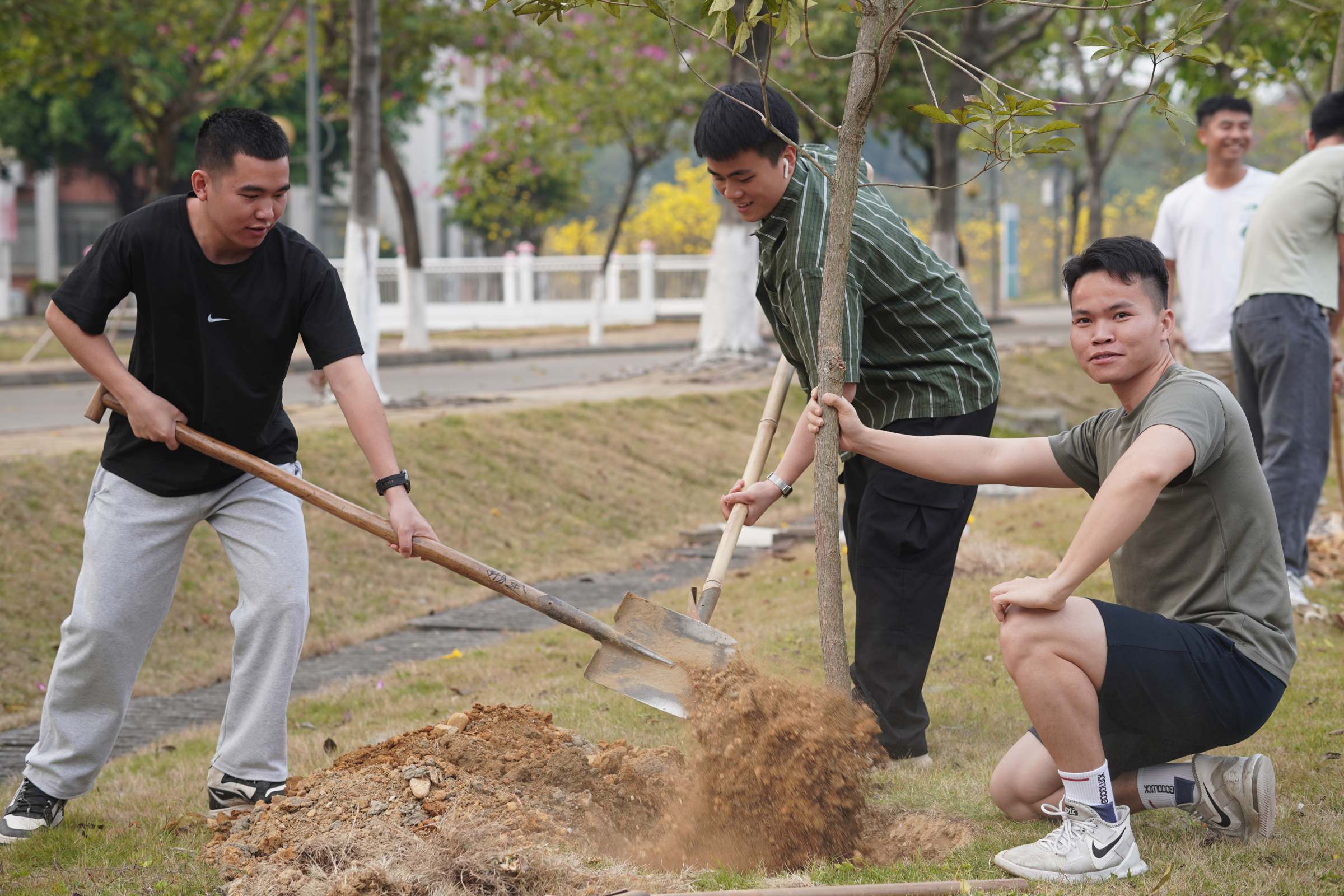 同学们分工明确,配合默契。他们先对植树区域进行了除草、松土、浇水,为后续种植做好充足准备,再将一棵棵树苗栽进肥沃的土壤里,为学校的春日增加了一抹抹新绿。参与植树的同学表示:”今年是广东财经大学建校四十周年,在这个春天我们亲手种下一颗小树苗,就是许下对母校的美好祝愿。相信在同学们的呵护下,小树苗一定能够茁壮成长、根深叶茂!”