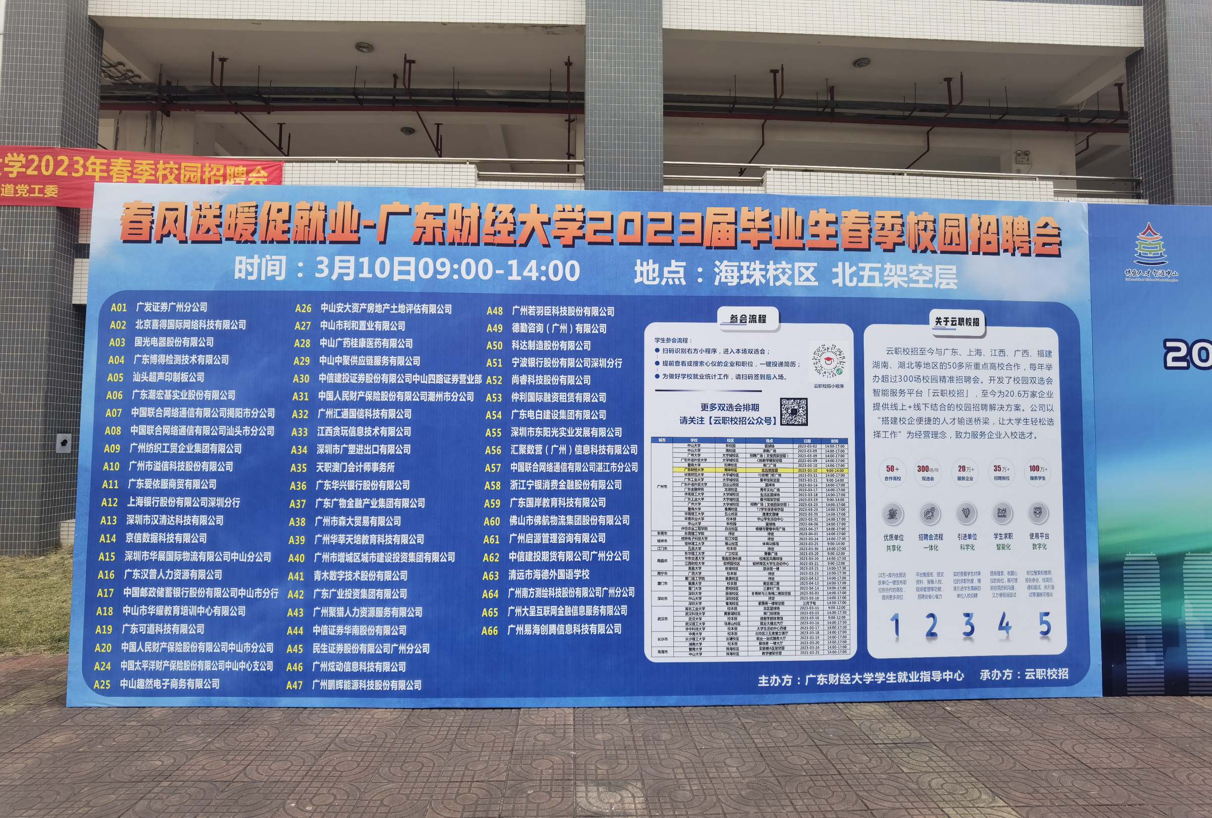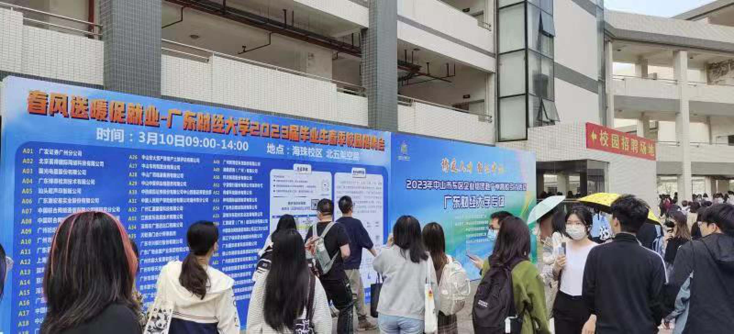 3月10日,我校在广州校区北五架空层举办“春风送暖促就业—广东财经大学2023届毕业生春季校园招聘会”招聘活动。本场招聘会共吸引了476多家单位线上报名参会,广发证券、中信证券、德勤咨询、广东广物金融产业集团、珠海水控集团、万力轮胎、卓望数码、广纸集团等66家单位参加了线下招聘活动,为毕业生们提供了3000余个岗位。