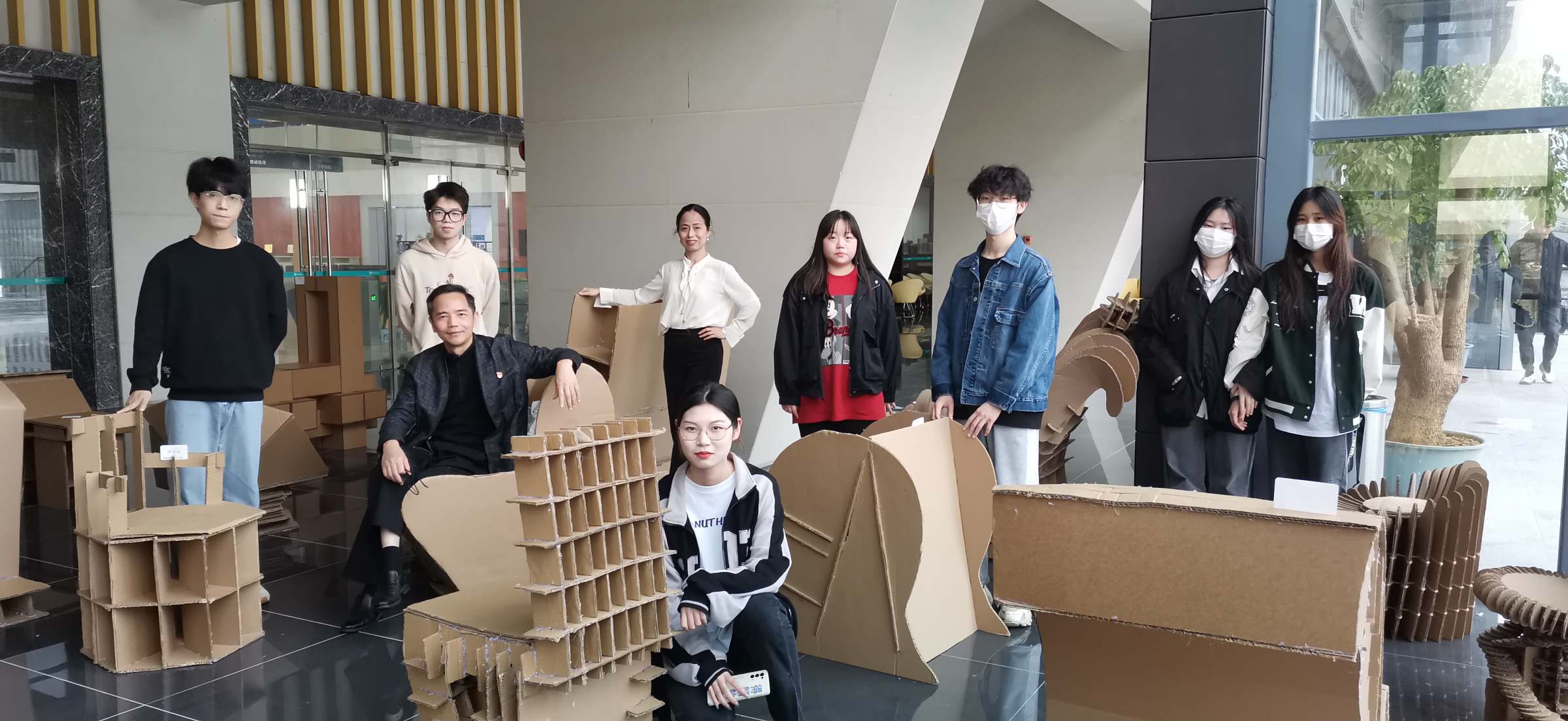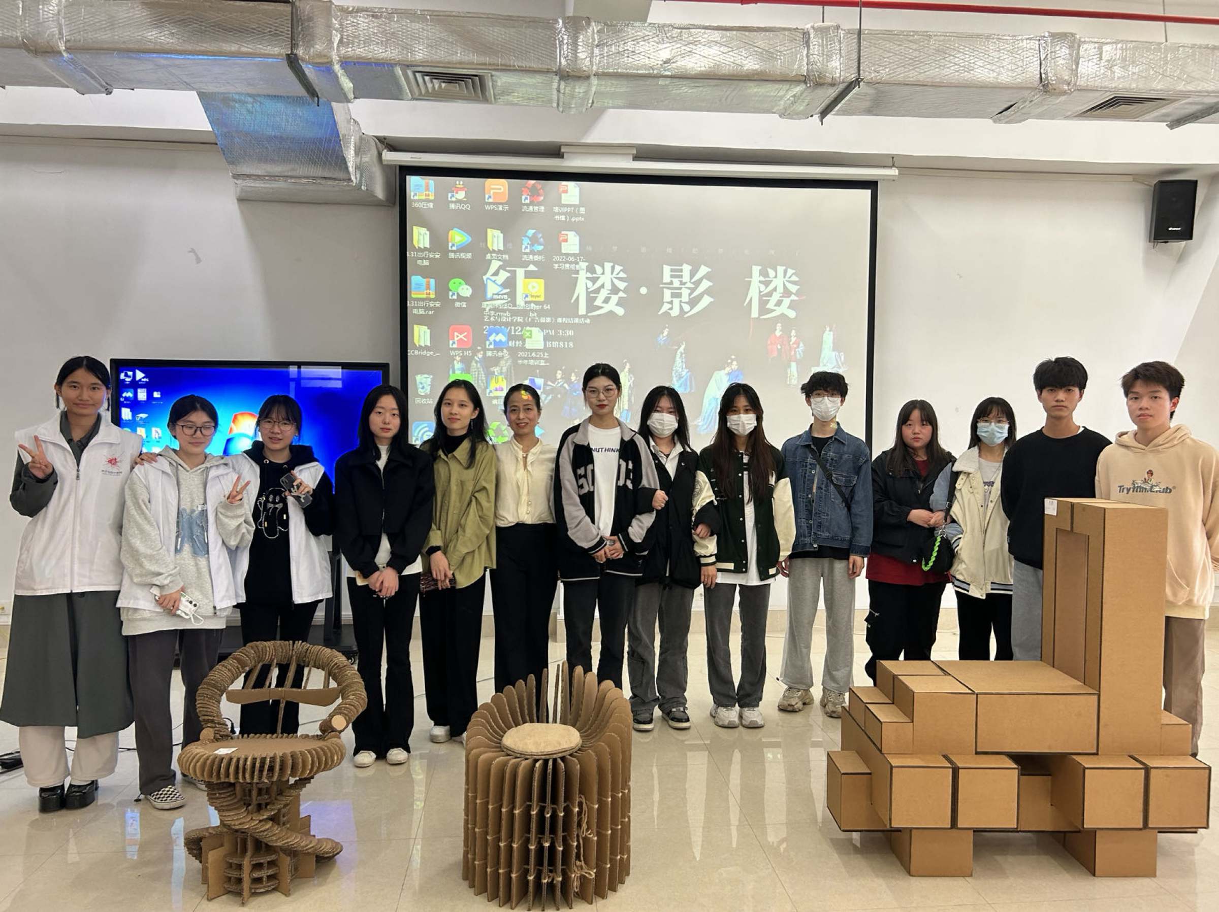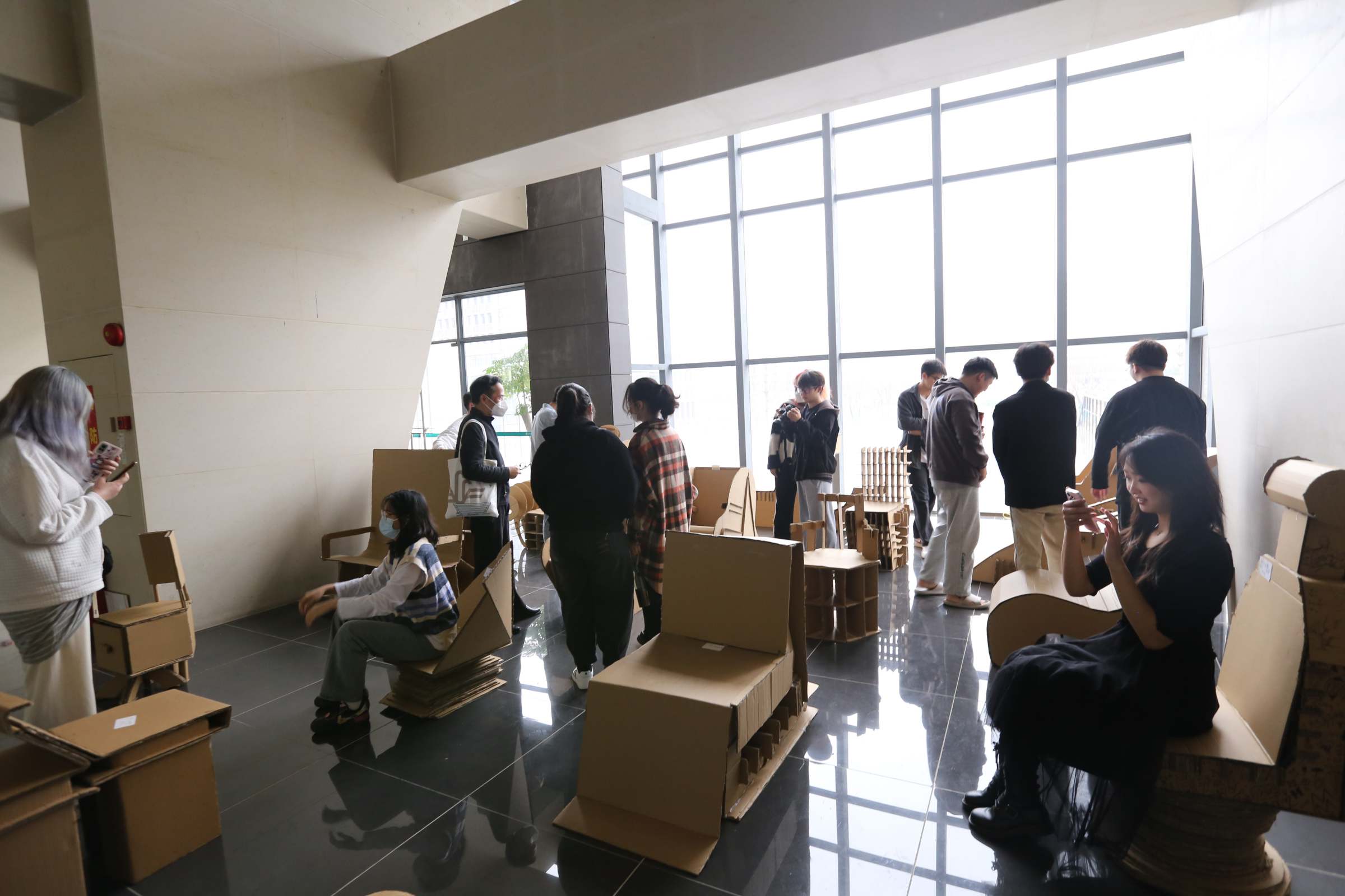 沙龙交流主会场,摆放着几张21级环境设计专业同学用瓦楞纸设计制作的“可以在春天里发呆的”休息坐椅,可灵活拼装、折叠携带的创意设计,激发了与会同学们极大兴趣。活动分为三个部分:椅子文化100发展嬗变学术讲座、椅子创意实践体悟分享交流、现场参观体验同学们设计制作的艺术椅子展。