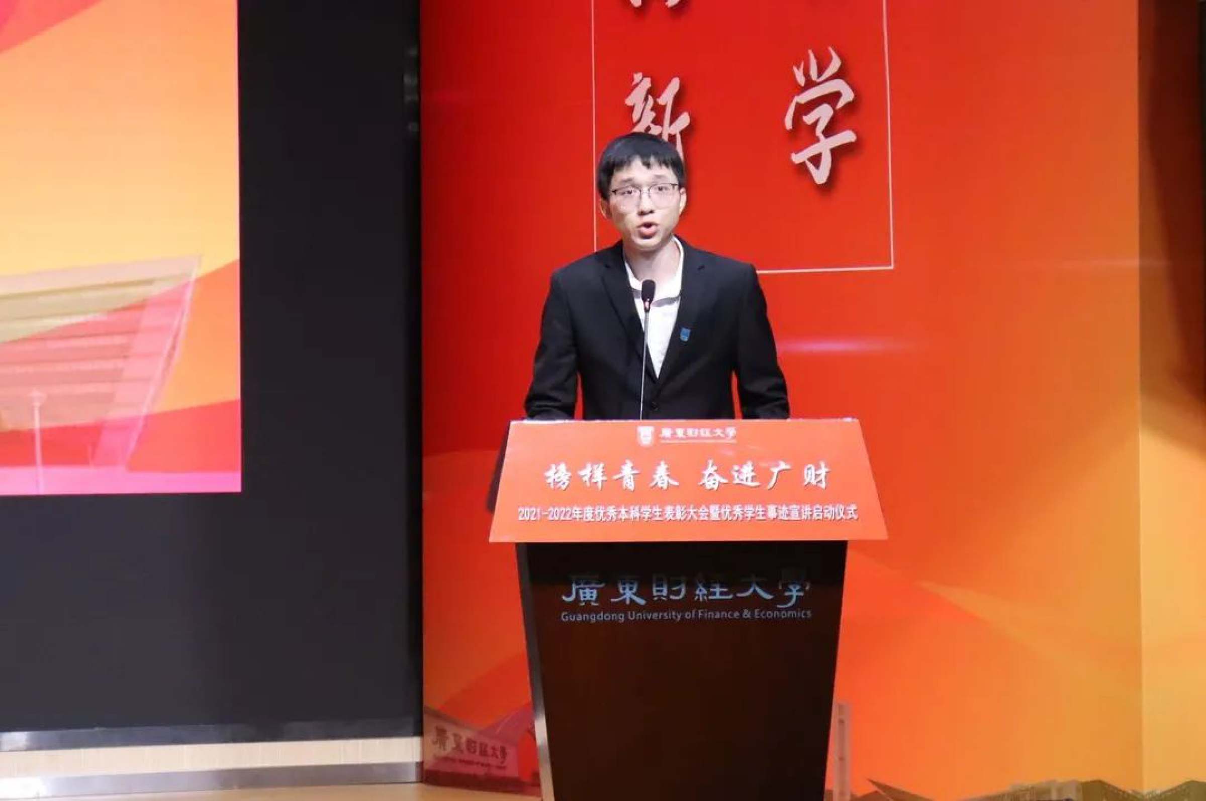 经济学院学院2019级学生彭佳烯作为受表彰学生代表发言。他对学校和老师的培养和教导,以及家人和同学的支持和鼓励表达了衷心的感谢。他谈到,一个优秀的广财人应当是心中有党的“明白人”、奋力奔跑的“追梦人”、帮扶同学的“贴心人”、主动奉献的“带头人”。奋进自律的广财学子应当既是思想上的“巨人”,也是行动上的“巨人”,在实践锻造中摒弃骄娇二气,不断增强作为新时代青年的志气、骨气、底气。他号召同学们争做有理想、敢担当、能吃苦、肯奋斗的时代好青年,共同为学校发展贡献青春力量。