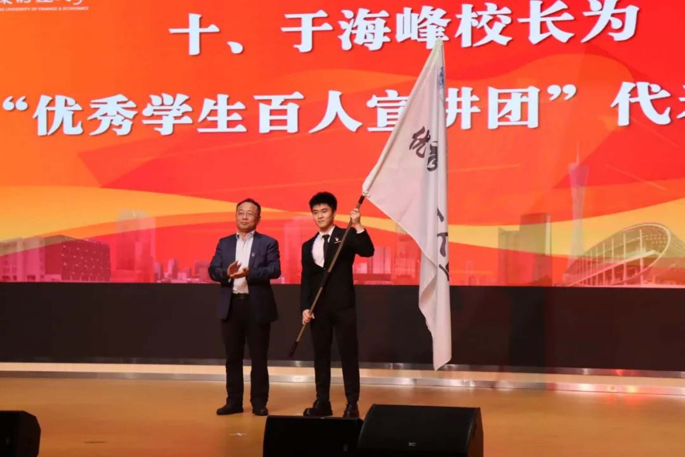 于海峰为“优秀学生百人宣讲团”代表授旗,我校优秀学生事迹宣讲活动正式开启。优秀学生百人宣讲团将从4月初开始进行宣讲,他们将持续深入学生群体,发挥模范带头作用,积极引导我校广大学生争做自律奋进广财人,做向党、向真、向善、向美、向上的“五向青年”,展现青春风采,彰显新时代广财学子爱国爱校、团结奋进的精神风貌。