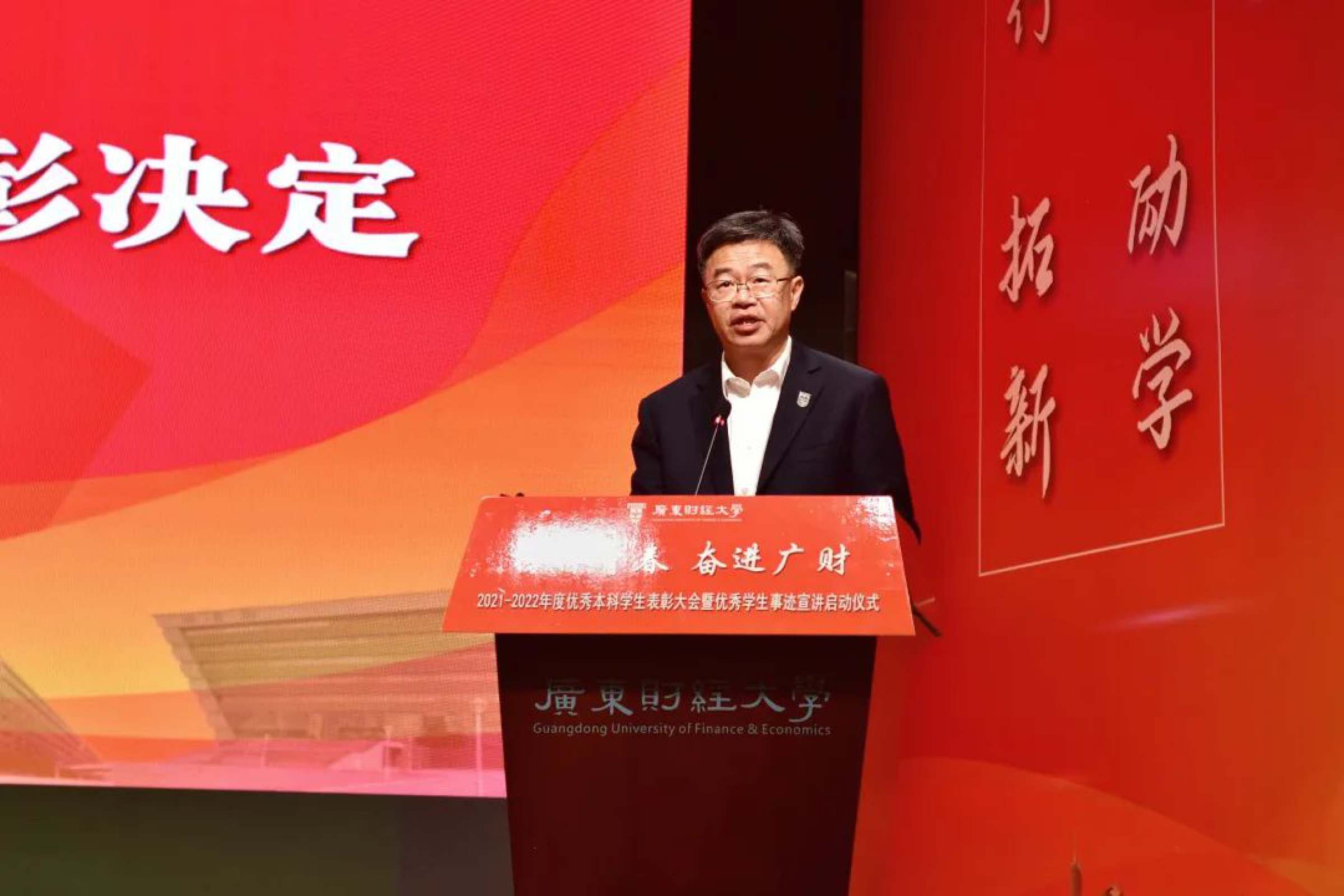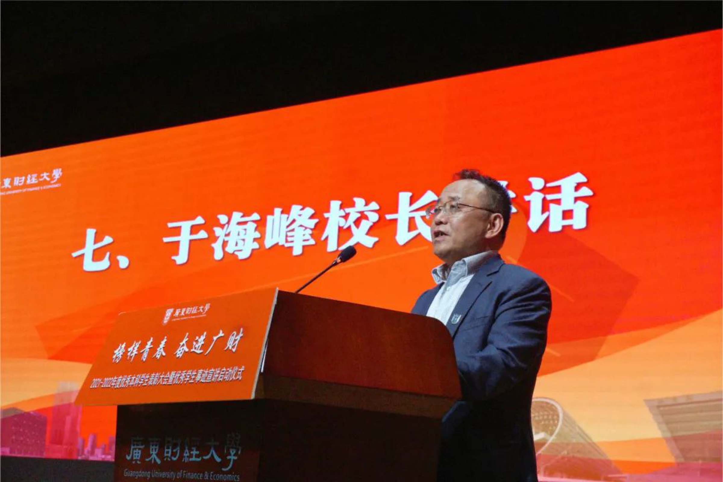 于海峰讲话。他指出,2023是付出与回报并存的一年。在党的领导下,全校师生精诚团结,凝心聚力、迎难而上、与时俱进、开拓创新,全面深化教育供给侧结构性改革,推动学校高质量发展,加快建设大湾区一流财经大学,他向同学们提出四点希望:
