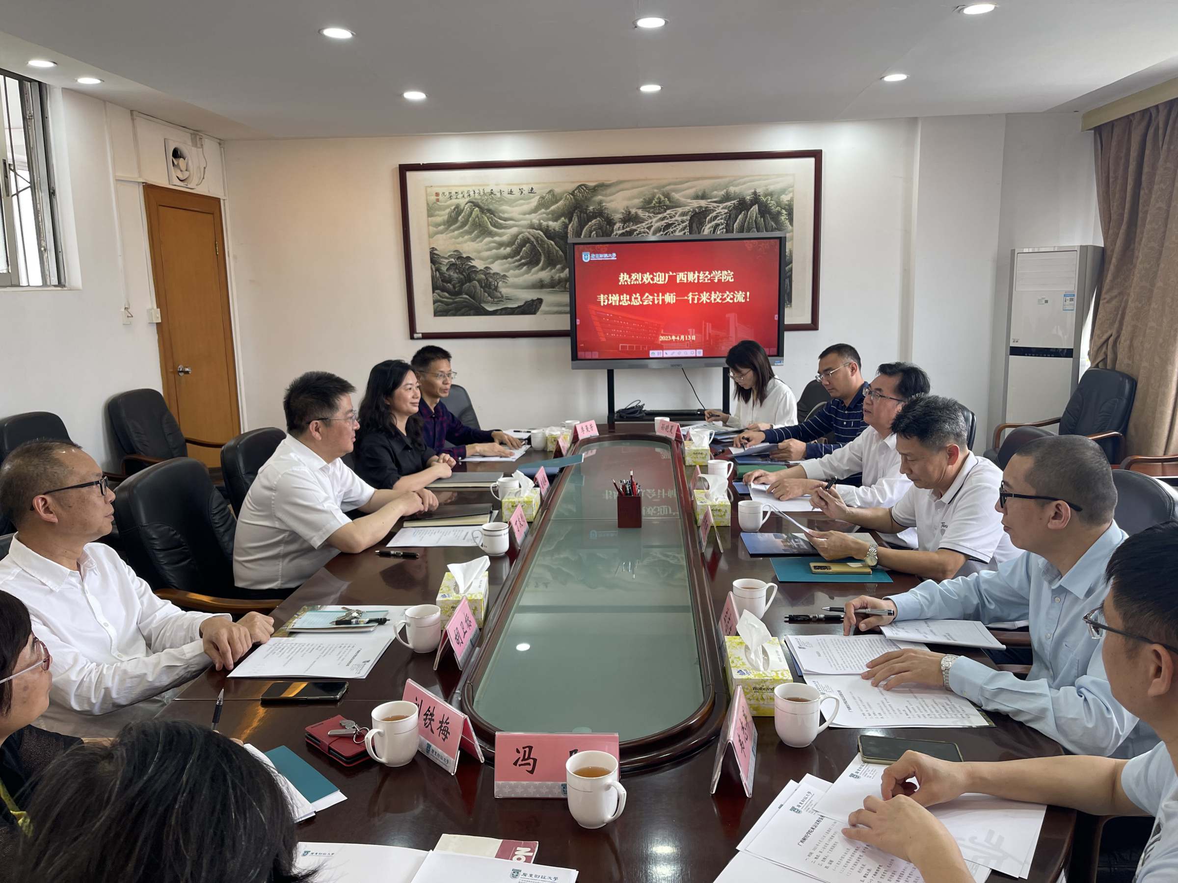 韦增忠简要介绍了广西财经学院的发展现状,并表示此次交流旨在学习广财财务管理、后勤管理及图书馆建设等方面的宝贵经验,提升广西财经学院内部治理水平。随后,双方就财务管理、后勤管理、图书馆建设情况进行深入沟通与经验分享。