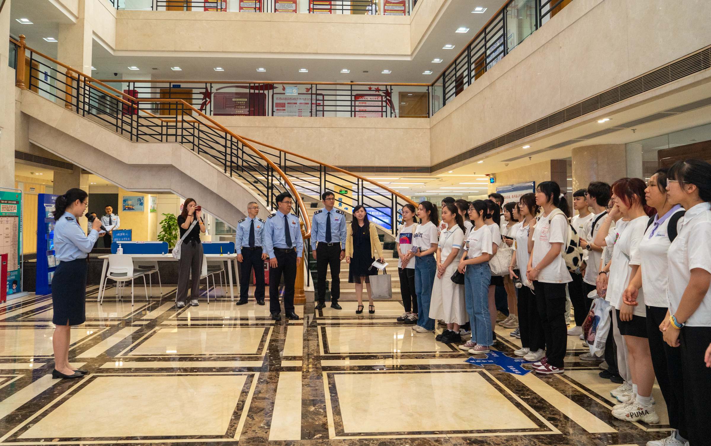 为了不断丰富税校合作模式,拓展合作内涵,4月18日,财政税务学院联合国家税务总局佛山市三水区税务局举办“税务开放日”活动,30余名学生代表走进税务局,亲身体验智慧办税的全过程。财政税务学院党委副书记崔晓莹、三水区税务局副局长易剑明等出席本次活动。
