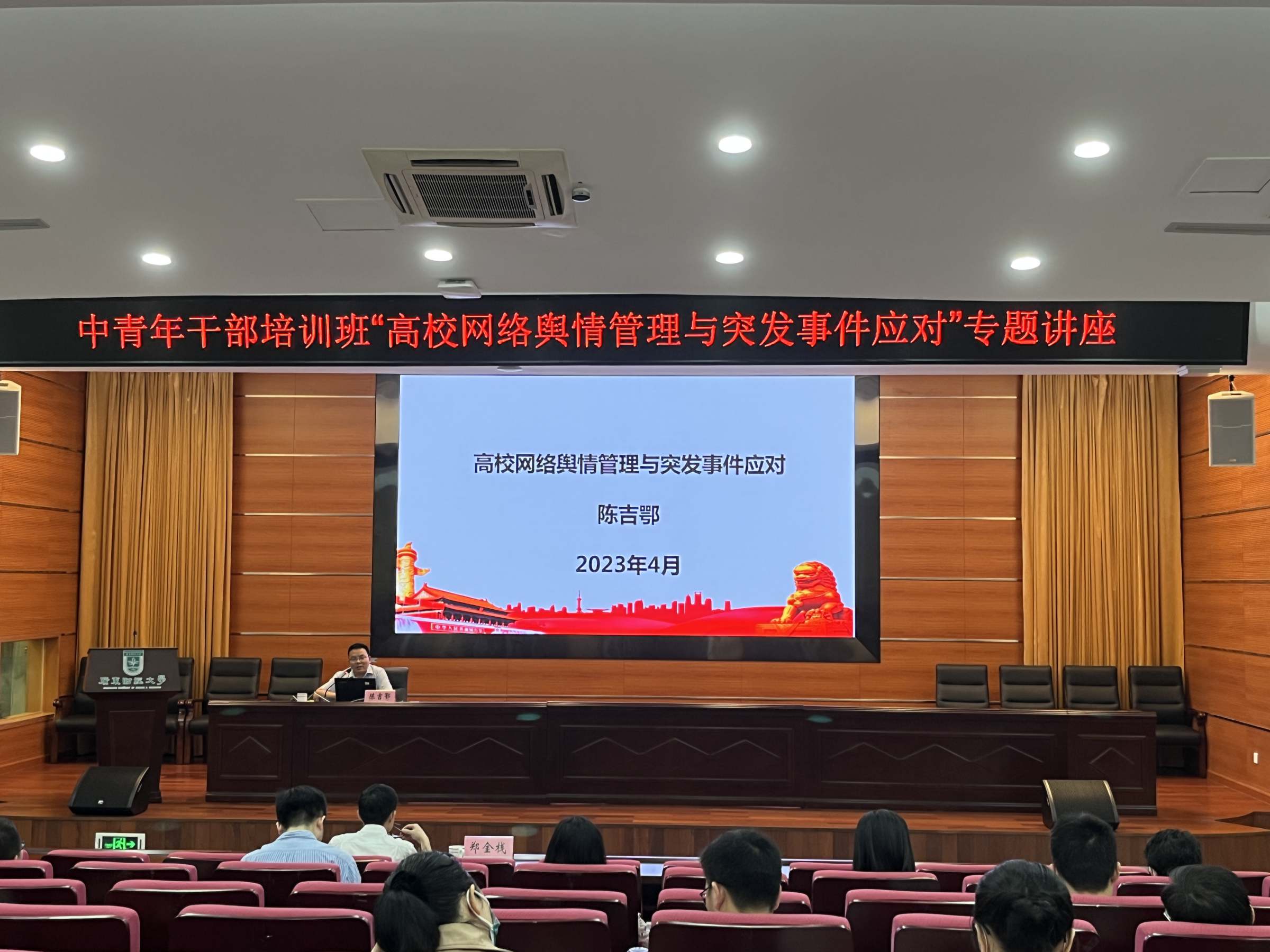 为深入开展学习贯彻习近平新时代中国特色社会主义思想主题教育,抓好青年党员干部学习,进一步提升青年党员干部能力素质,4月20日,学校中青年干部培训班在综合楼408举办了“高校网络舆情管理与突发事件应对”专题讲座,邀请广东省中职德育中心培训部主任陈吉鄂老师主讲。讲座由党委常委,党委组织部部长郑金栈主持,中青一班、二班学员现场聆听讲座。