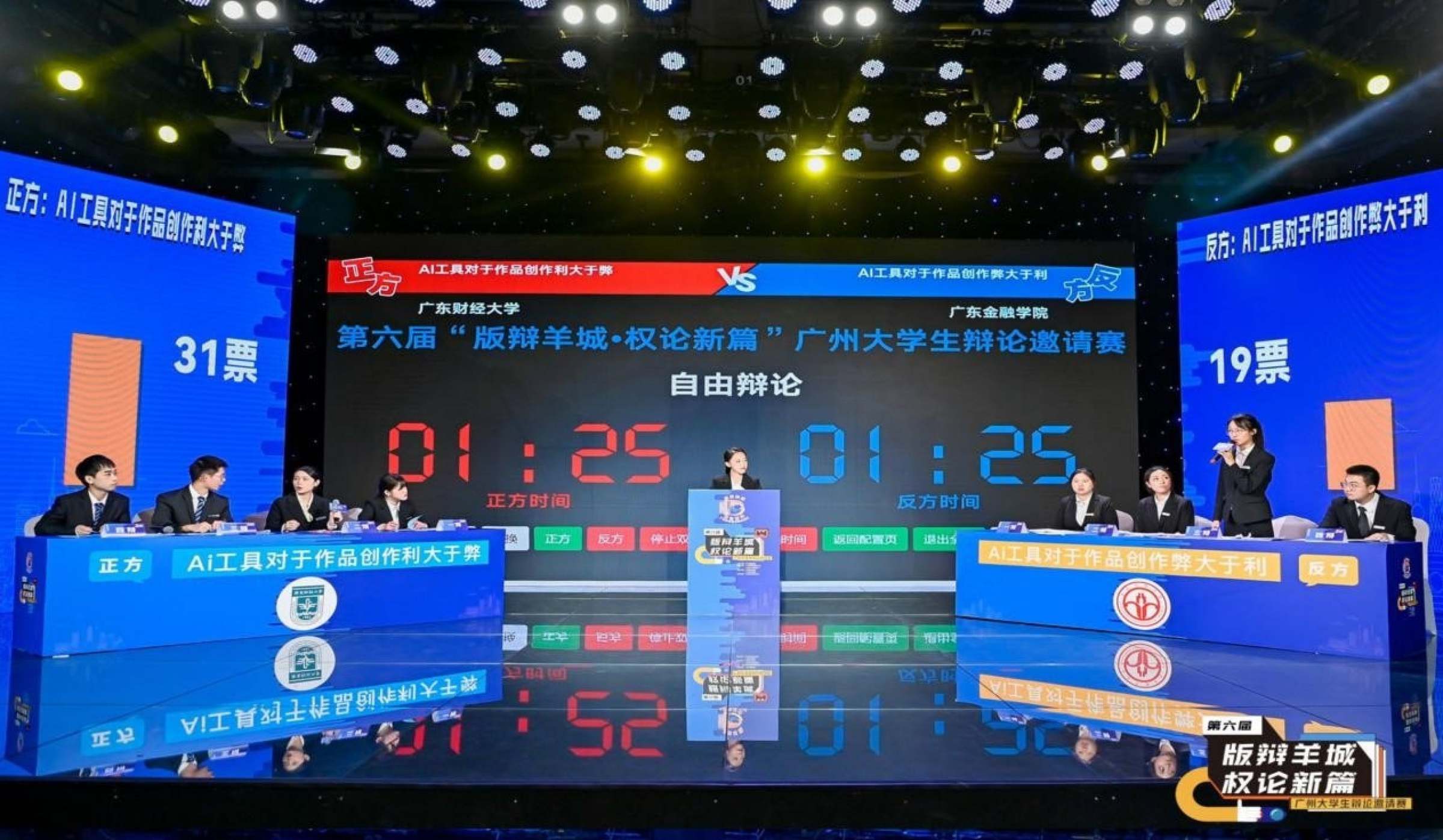 决赛在我校和广东金融学院两支辩论队之间展开,针对“AI工具对于作品创作利大于弊还是弊大于利”这一辩题展开辩论。决赛场上双方辩手流畅清晰、掷地有声地输出自己的观点,双方唇枪舌战,妙语连珠,将本就弥漫着紧张气氛的决赛一次次推向高潮。
