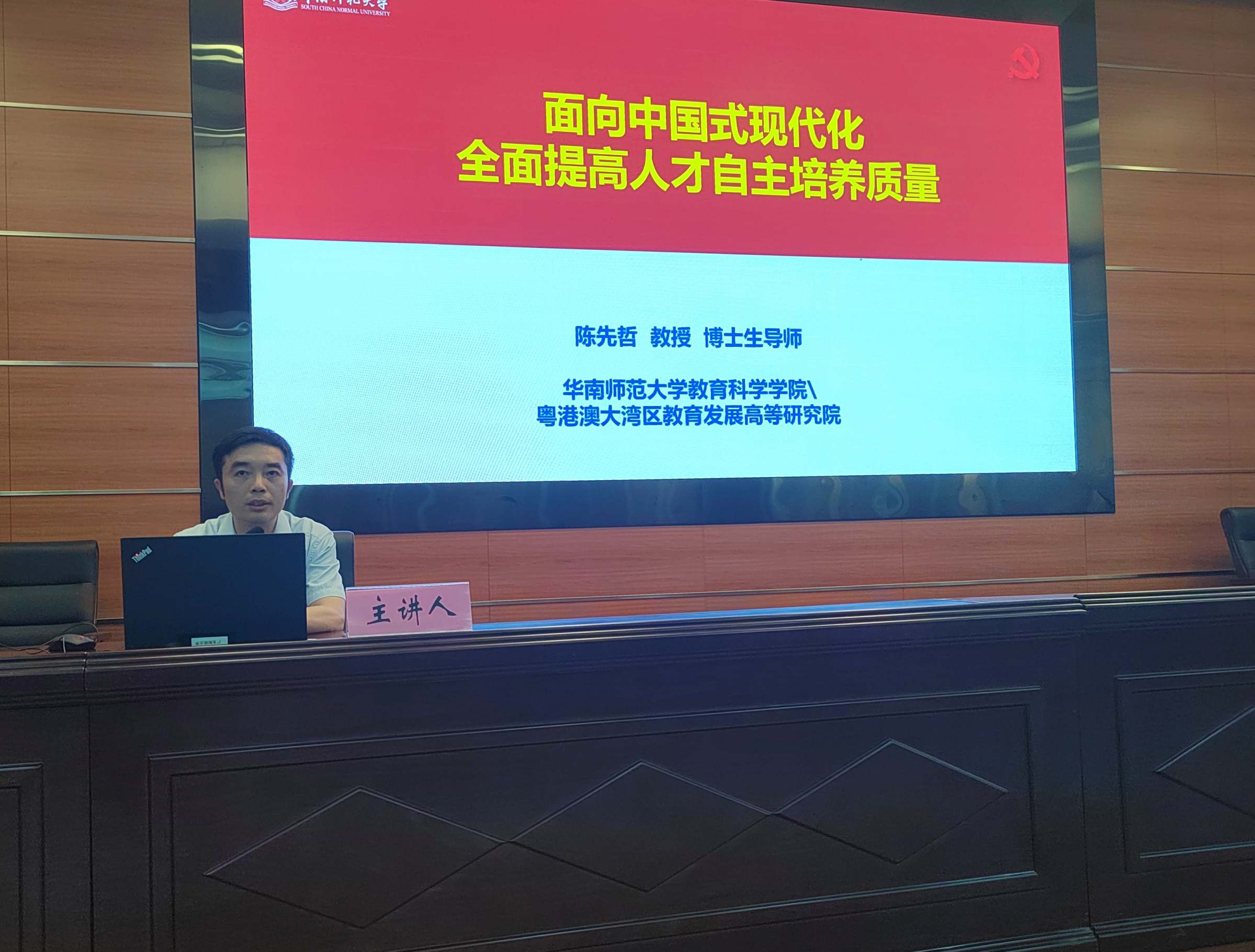 华南师范大学教授、博士生导师陈先哲作学习党的二十大精神专题辅导报告。他以“面向中国式现代化全面提高人才自主培养质量”为主题,从重视“战略科技人才”、探索“在地国际化”、走向“开放式创新”三个维度,对高校如何提高人才自主培养质量进行了深入系统的解读和剖析。专题辅导有机结合了学习党的二十大精神、学习贯彻习近平新时代中国特色社会主义思想、学习习近平总书记关于教育的重要论述以及对广东系列重要讲话和重要指示精神。