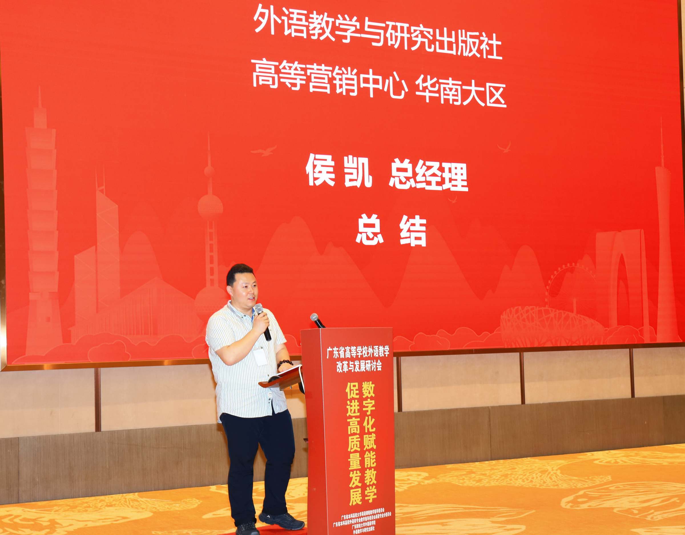 最后,外研社高等营销中心华南大区总经理侯凯作会议总结,希望通过本次会议,从教、学、测、评、研、赛等多角度,专家报告与院校教学实践分享相结合的方式,助力教师提升数字素养,充分利用数字化资源与教学平台,切实提升外语课程教学育人成效。