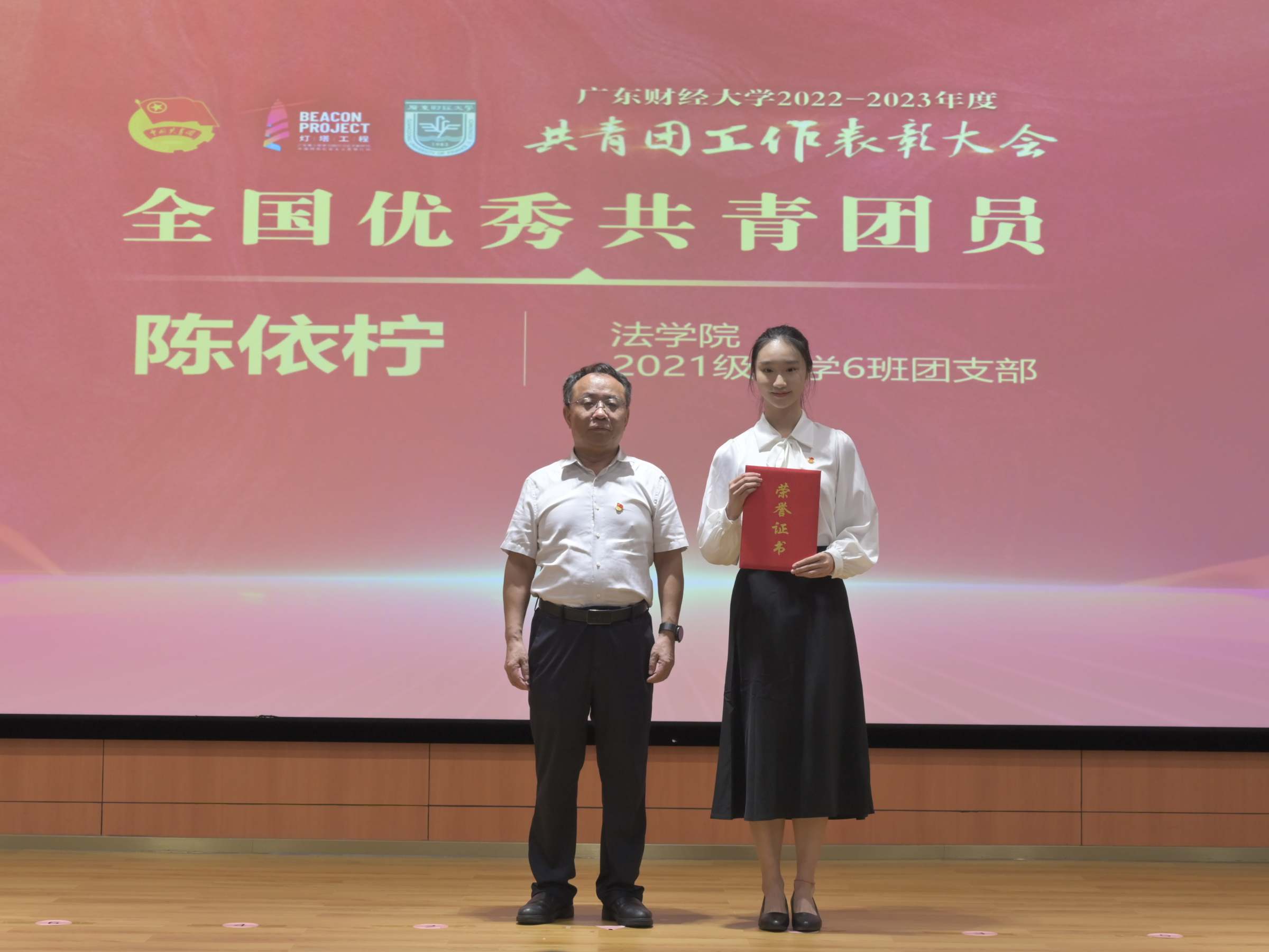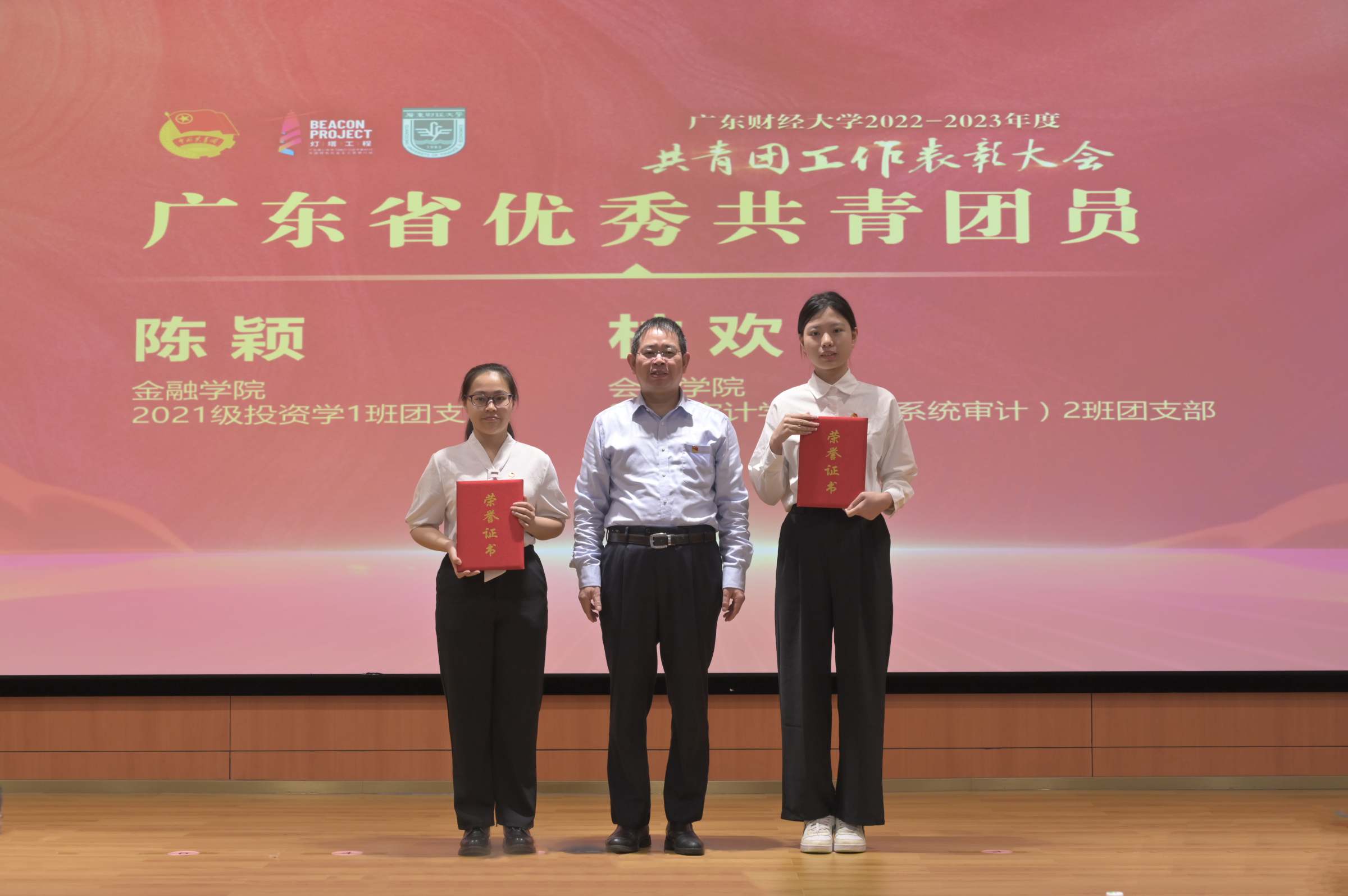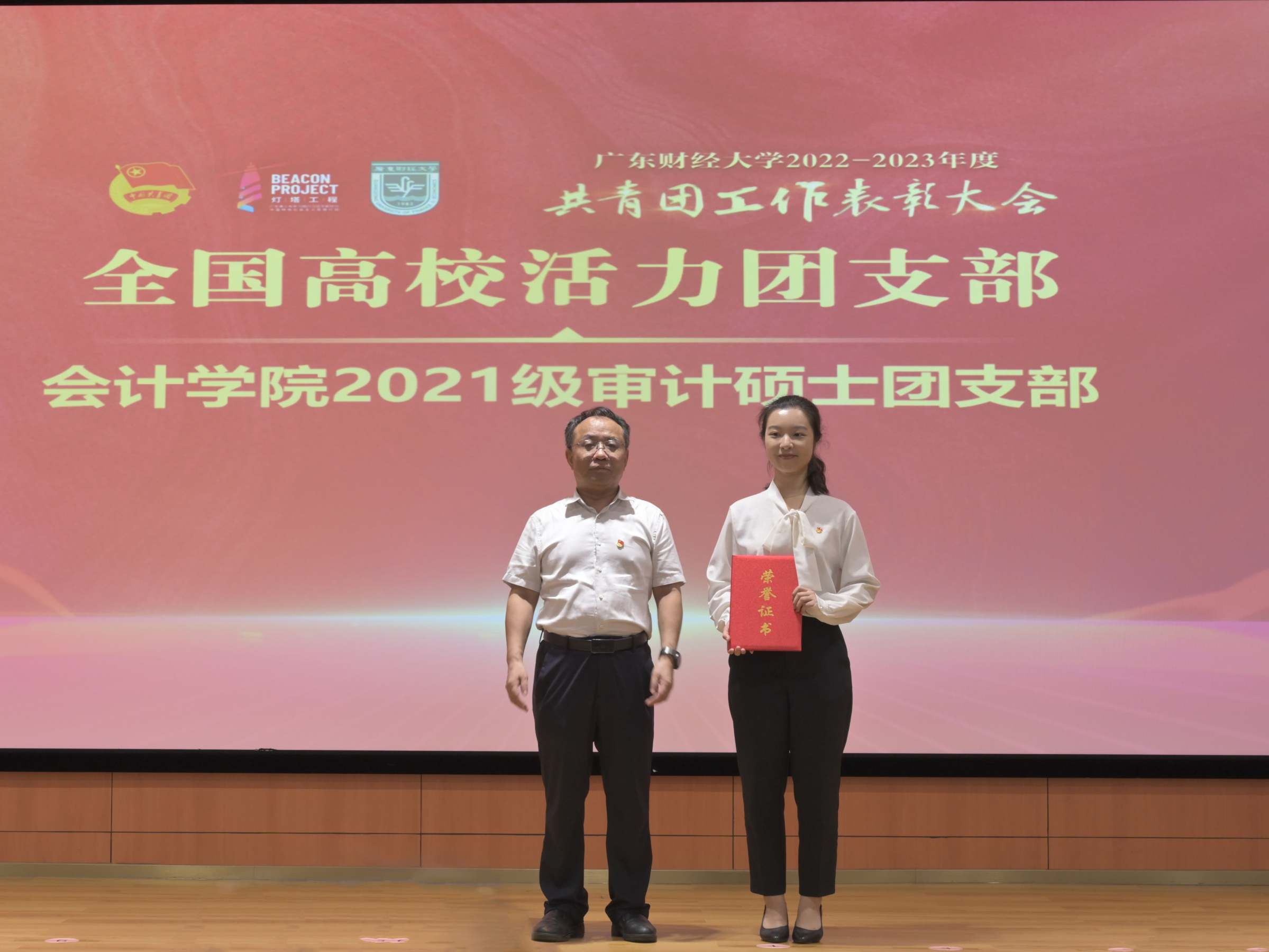 会上,与会领导为受表彰集体和个人颁奖。全国优秀共青团员陈依柠,全国高校活力团支部会计学院2021级审计硕士团支部书记郑彤,“五四青春榜样”(创业榜样)“冠军助农”团队代表余张洁,公共管理学院团委书记甘子明作分享发言。