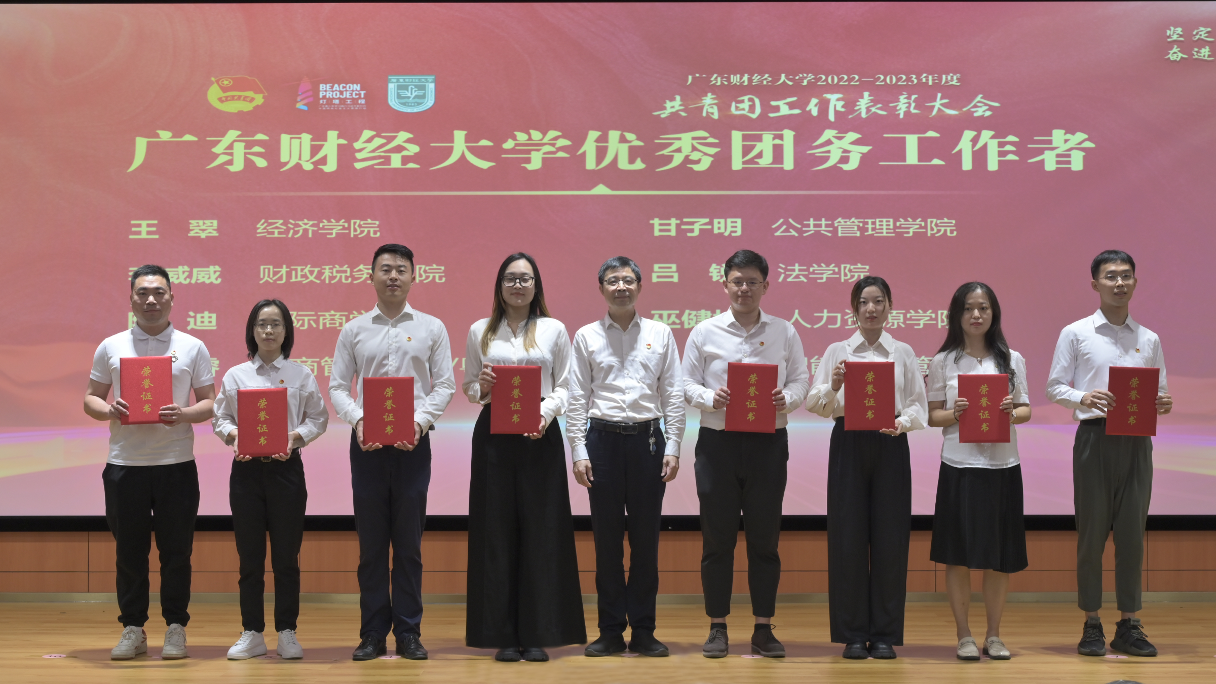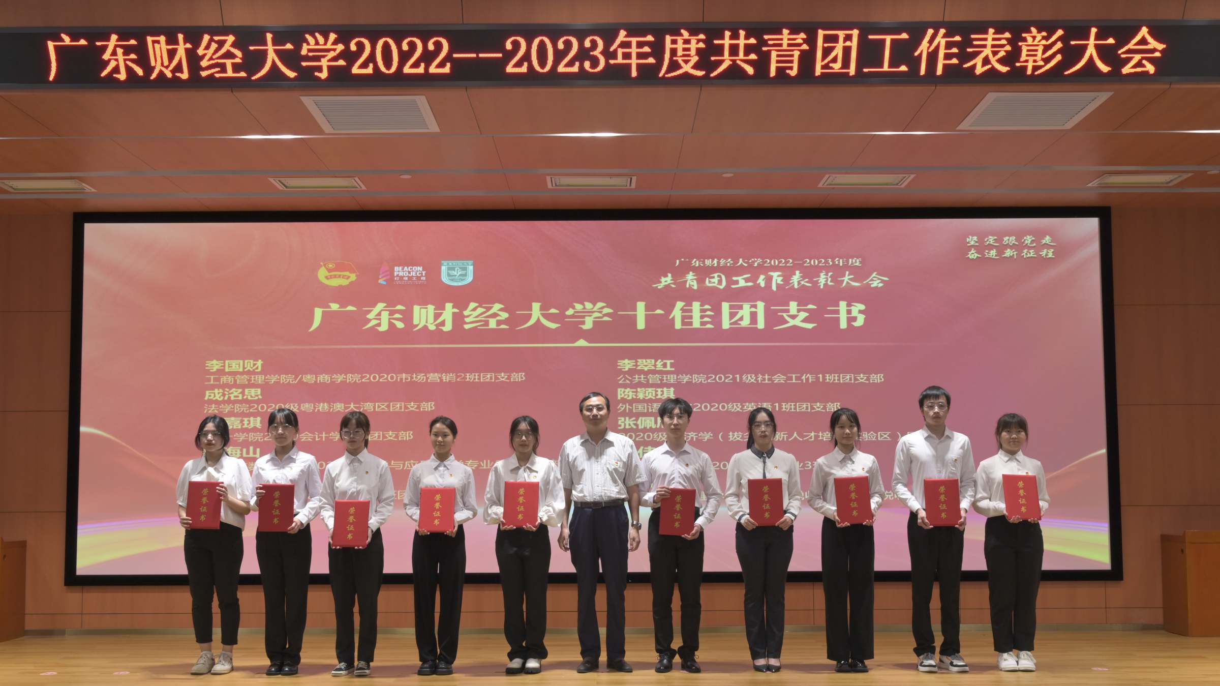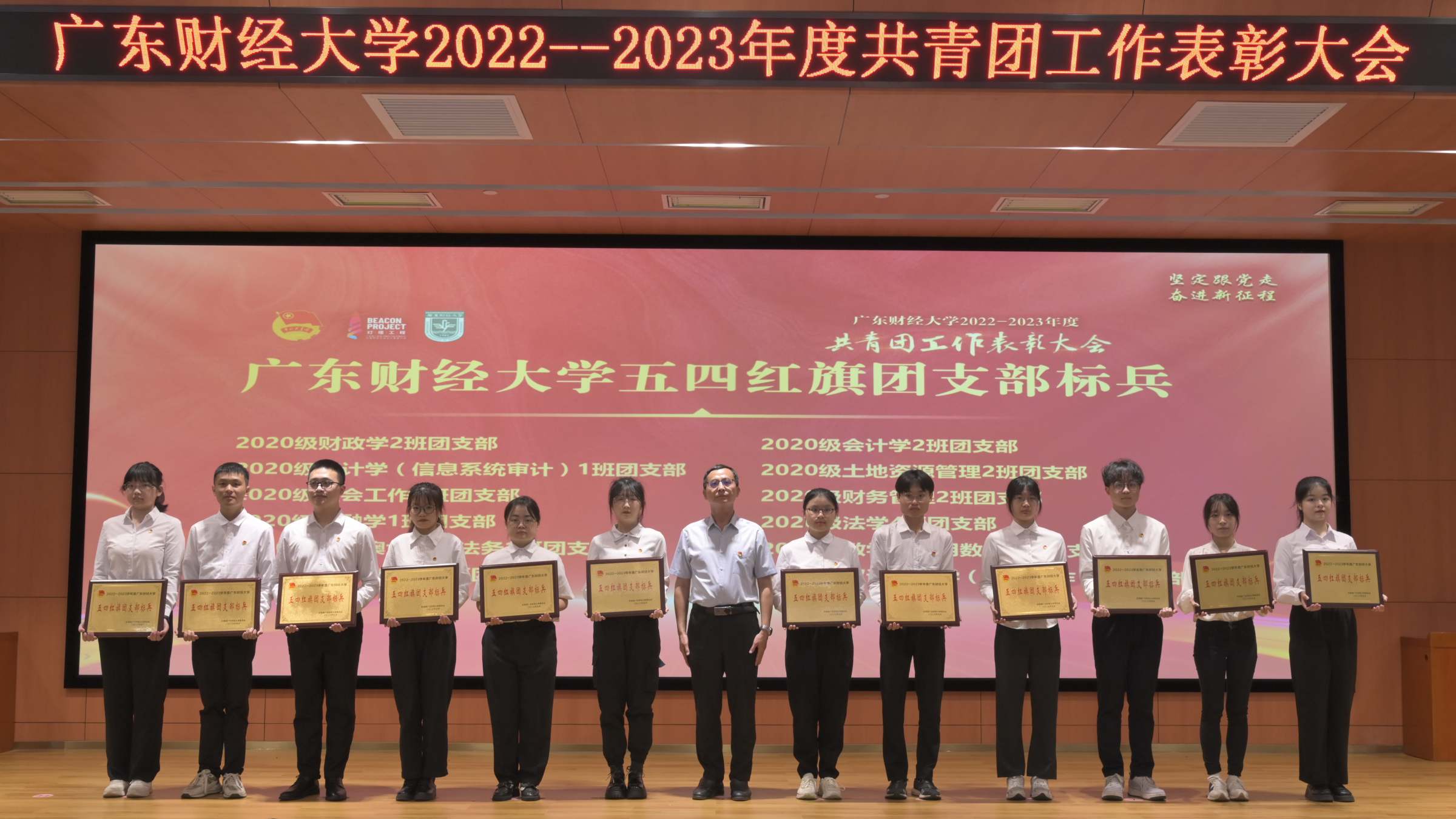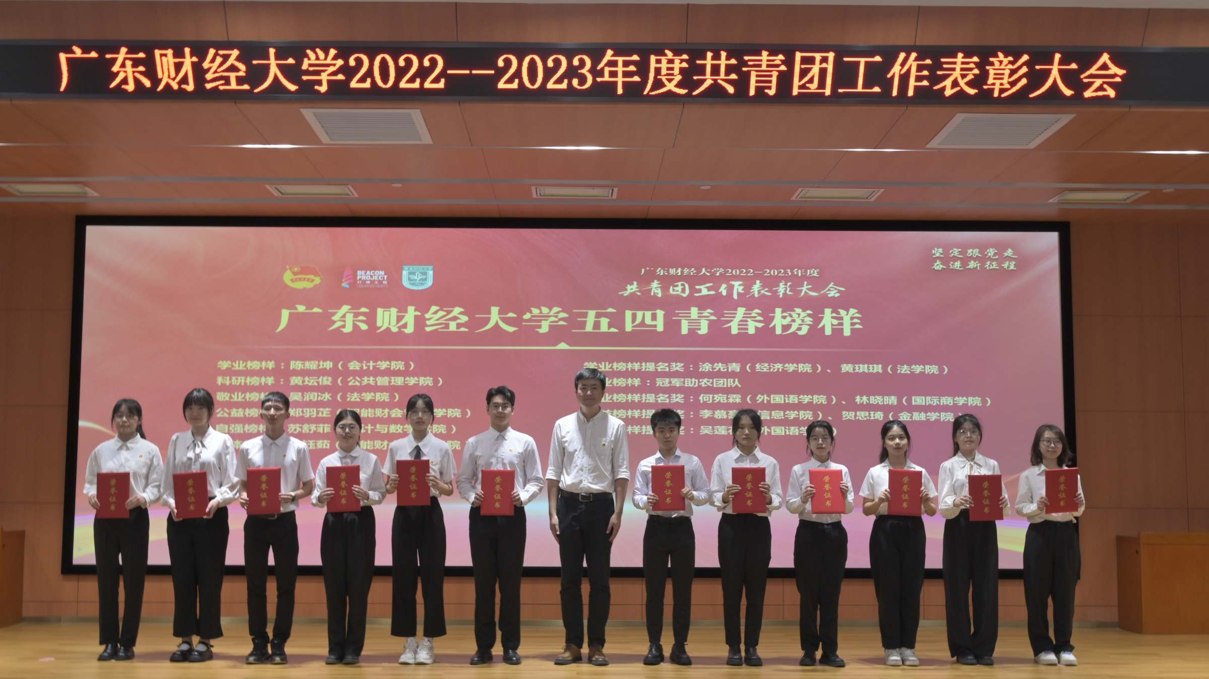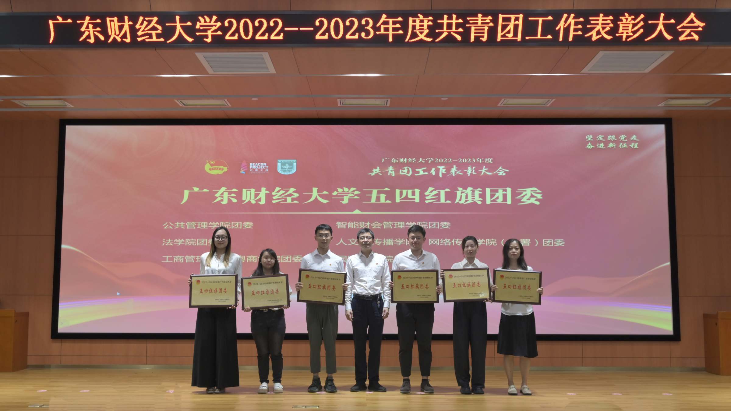 5月4日上午,我校2022-2023年度共青团工作表彰大会在广州校区正心堂举行。校长于海峰,校党委副书记罗贤甲,副校长陈国栋、邹新月,党委组织部、学工部、研工部主要负责人,各学院党委书记和分管学生工作的党委副书记,受表彰集体,先进个人代表,校团委全体人员、各学院团委书记、学院佛山校区团委书记,校青马学员代表等参加大会。