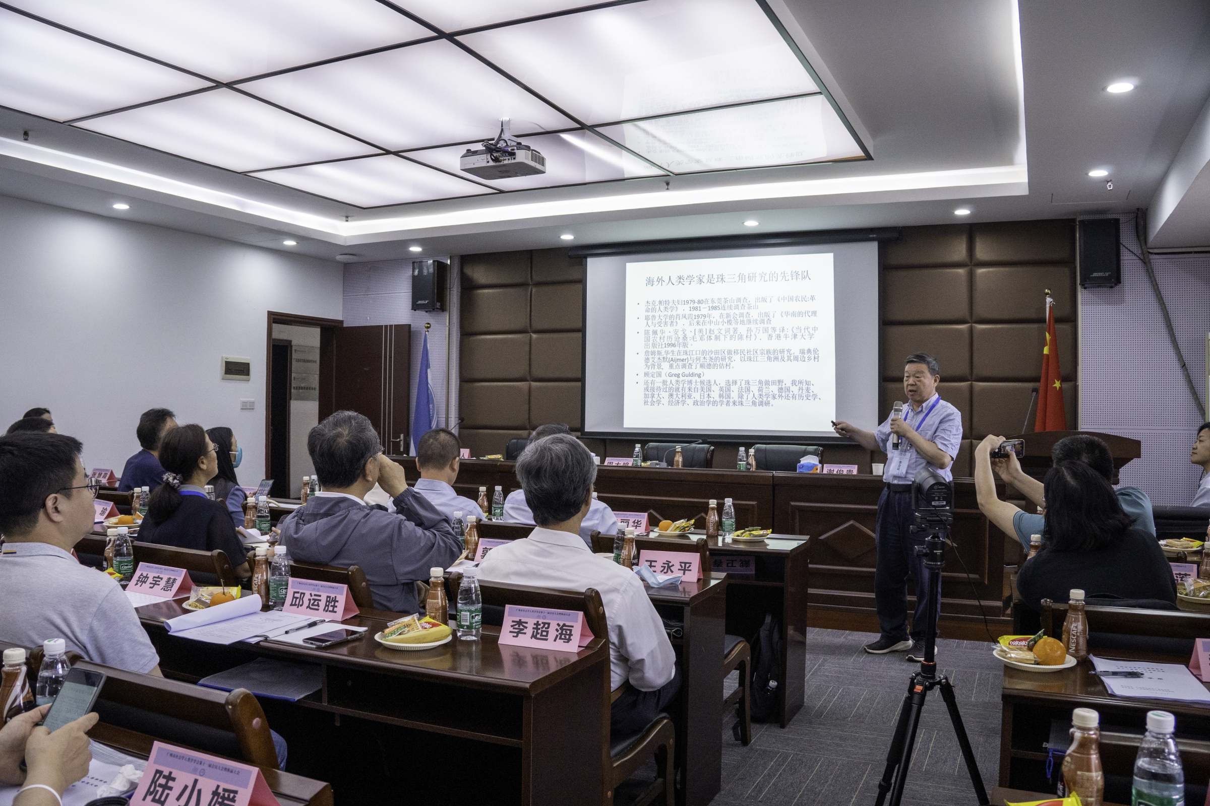 随后,周大鸣带来了主题为《身边的田野:我的珠江三角洲研究之缘》的学术演讲。讲座中,周大鸣教授结合自己在珠江三角洲的田野经验,阐述了实地调查对于学术研究的意义,并介绍了国内外学者正在探索和理解隐藏在珠三角背后的逻辑和意义。同时周大鸣提出珠江三角洲研究主要涉及广州文化、珠三角发展与文化、侨乡文化、乡村都市化再研究、珠三角农民工研究等方向,并据此提出关于珠三角研究的四个新的探索方向,即文化转型与城市转型、农民工转型研究、移民与城市化探讨和国际移民研究。在讲座尾声,周大鸣分享了四点体会:一是将随时的想法,化作实践;二是充分发挥学生的主观能动作用;三是要增强自身实力;四是要有合作精神。