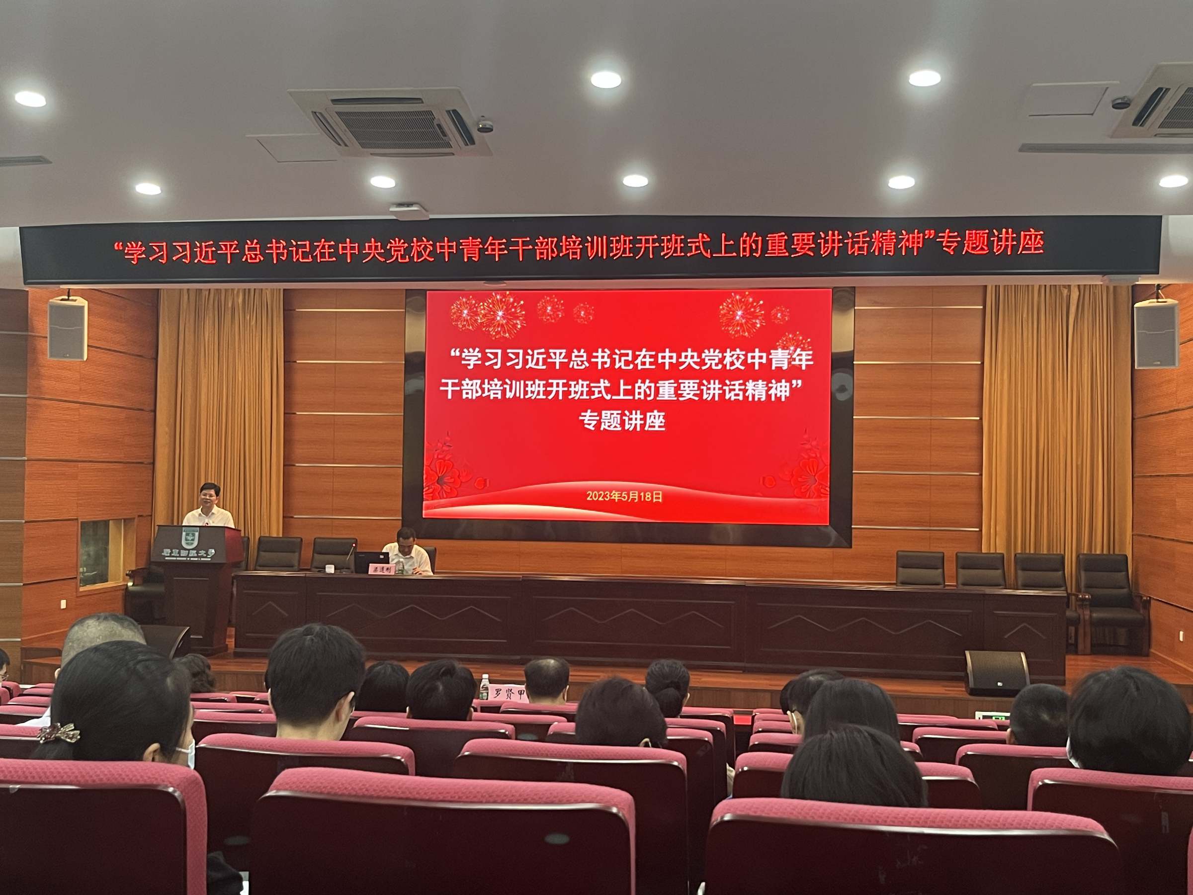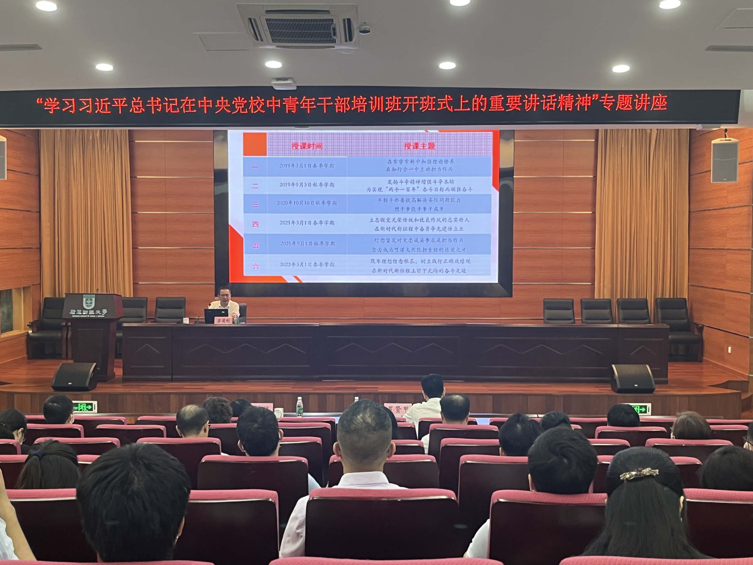为深入开展学习贯彻习近平新时代中国特色社会主义思想主题教育,进一步深入学习领会习近平总书记系列重要讲话精神,5月18日上午,学校邀请广东省委党校党史党建部主任梁道刚教授为机关党委中层干部和中青一班、二班学员作题为“学习习近平总书记在中央党校中青年干部培训班开班式上的重要讲话精神”专题讲座。讲座由校党委副书记罗贤甲主持,校党委组织部部长、机关党委书记郑金栈参加讲座。