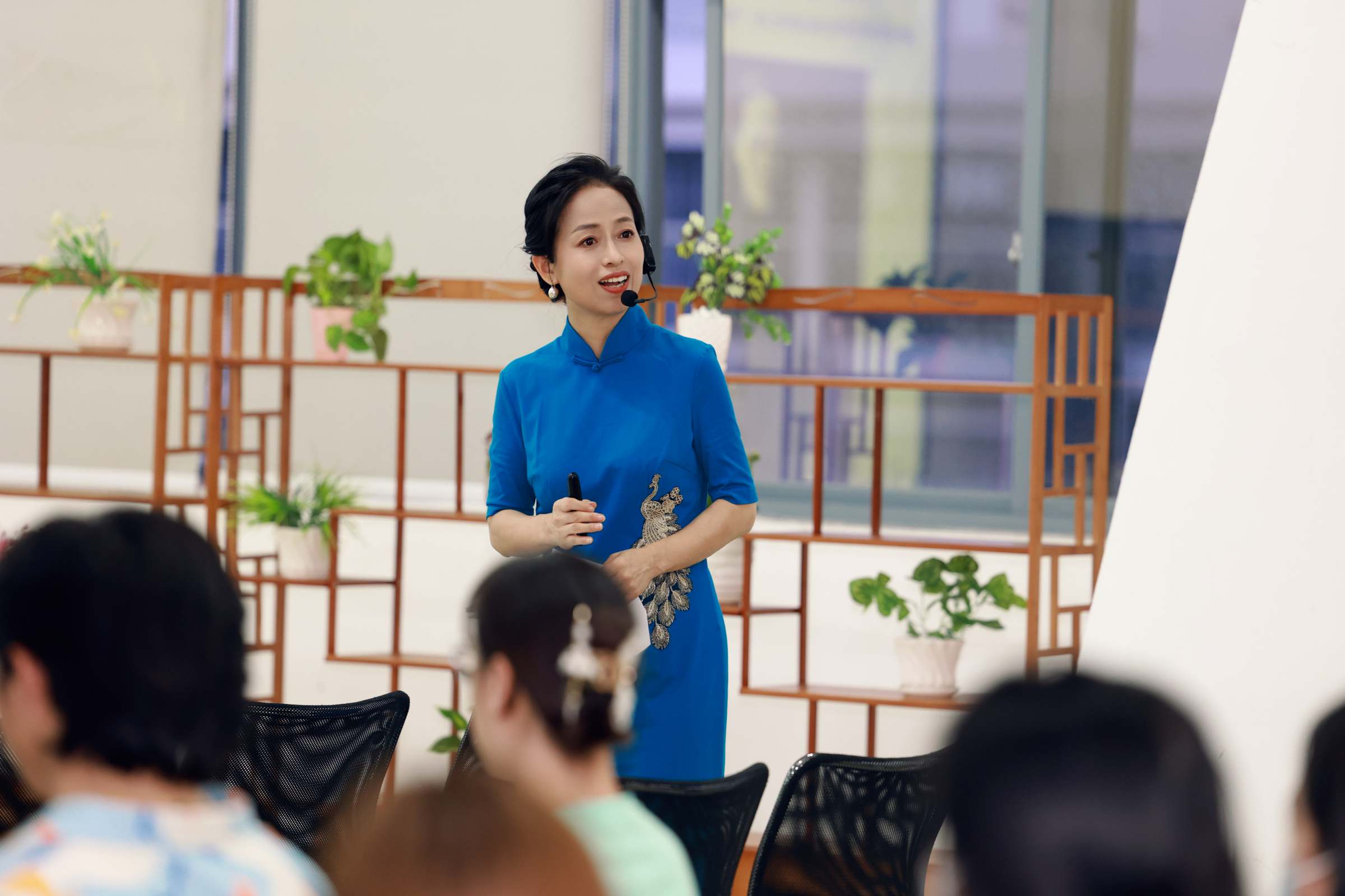 5月23日晚,图书馆801多功能培训室里,博古架、油纸伞,团扇、绿植,莲花、月季,还有旗袍盛装的刘琼琳老师和学生礼仪队,各种中华传统文化元素,让前来参加活动的同学们充满了好奇之心,这个名为“清扬婉兮,旗袍之美,仪态重塑”的旗袍仪态分享会,究竟能带给大家怎样的传统文化的分享?