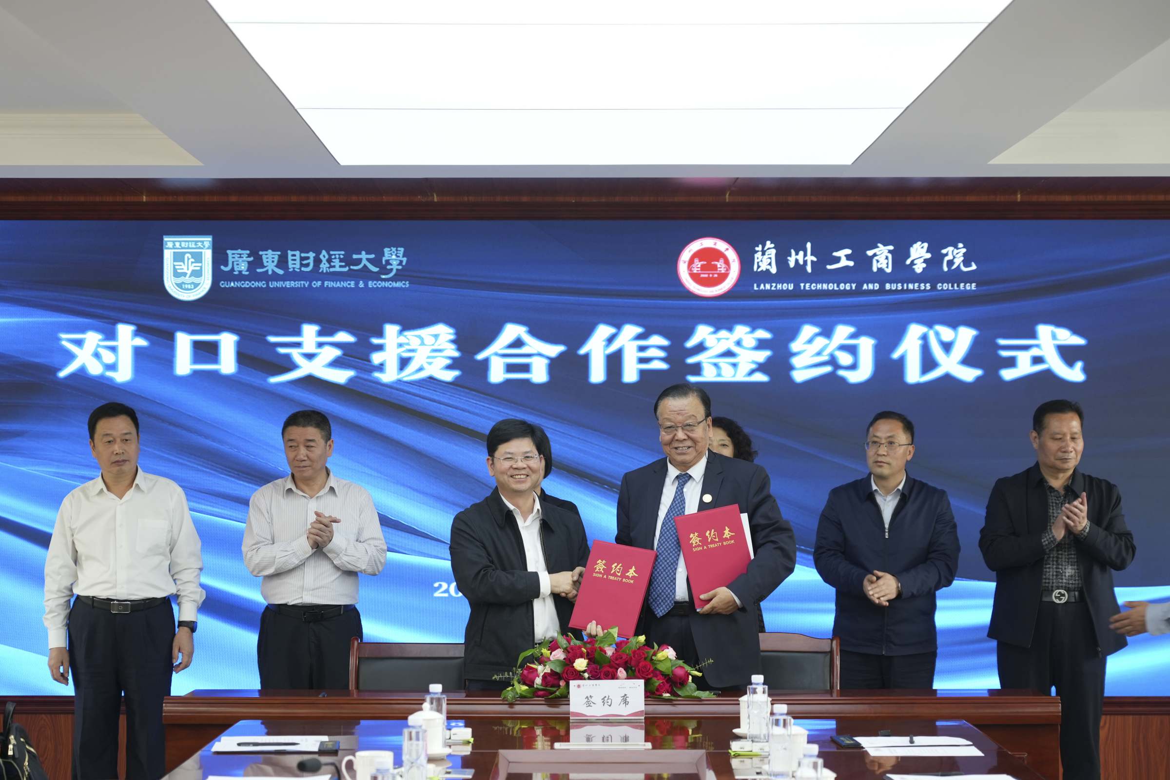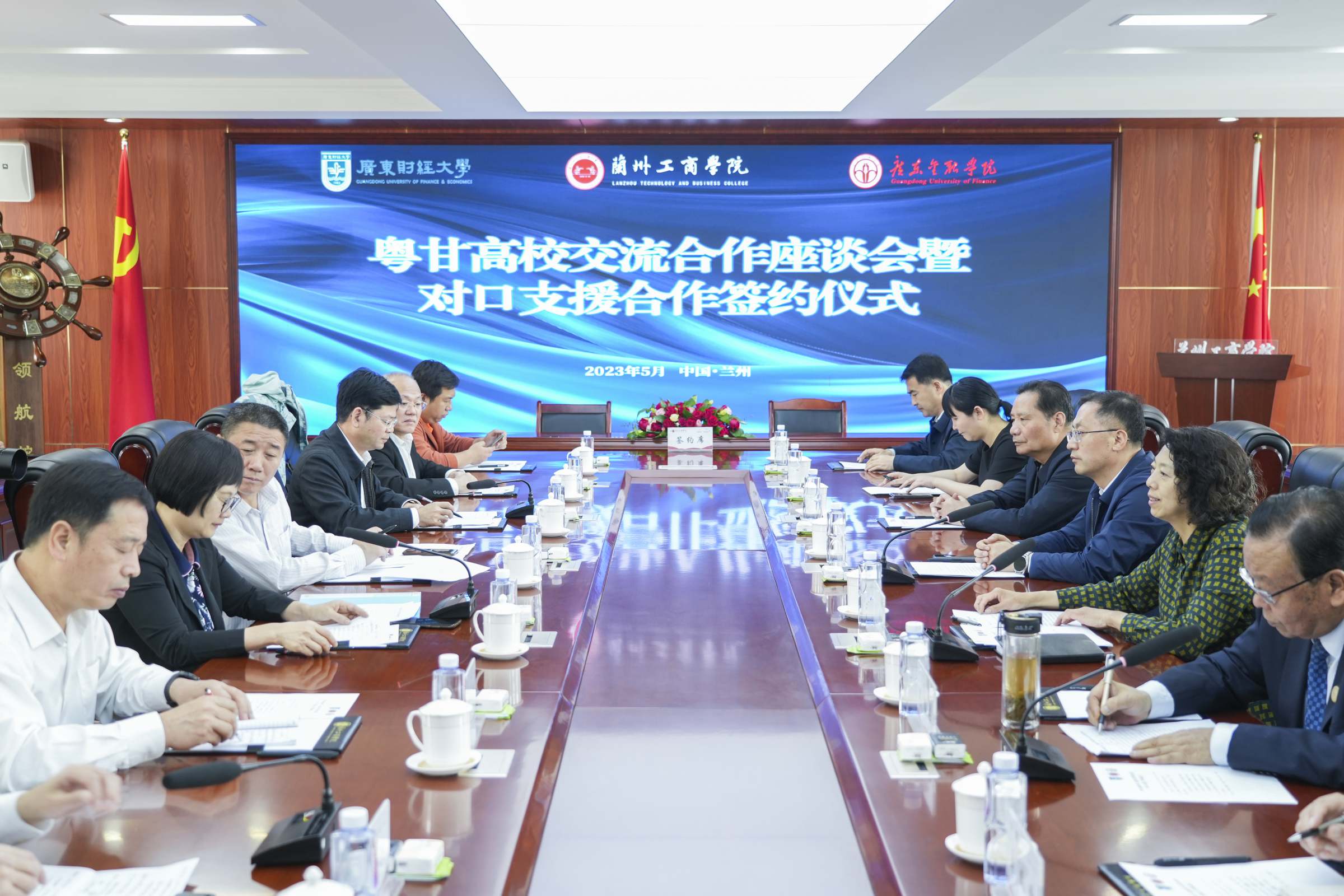 为深入贯彻习近平总书记关于深化东西部协作、推动区域协调发展的重要讲话和重要指示精神,贯彻落实教育部对口支援西部地区高等学校相关工作要求,5月26日下午,粤甘高校交流合作座谈会暨广东财经大学、广东金融学院对口支援合作签约仪式在兰州工商学院举行。甘肃省教育厅二级巡视员苏锋,广省教育厅二级巡视员吴艳玲,甘肃省教育厅高等教育处处长张发旺、三级调研员王怡,广东省教育厅事务中心党支部书记梅毅,广东省发展改革委对口支援合作二处三级调研员马世斌,兰州工商学院校长完颜弟,我校党委副书记罗贤甲、社会合作处长黎友焕等出席座谈会。座谈会和仪式由张发旺主持。