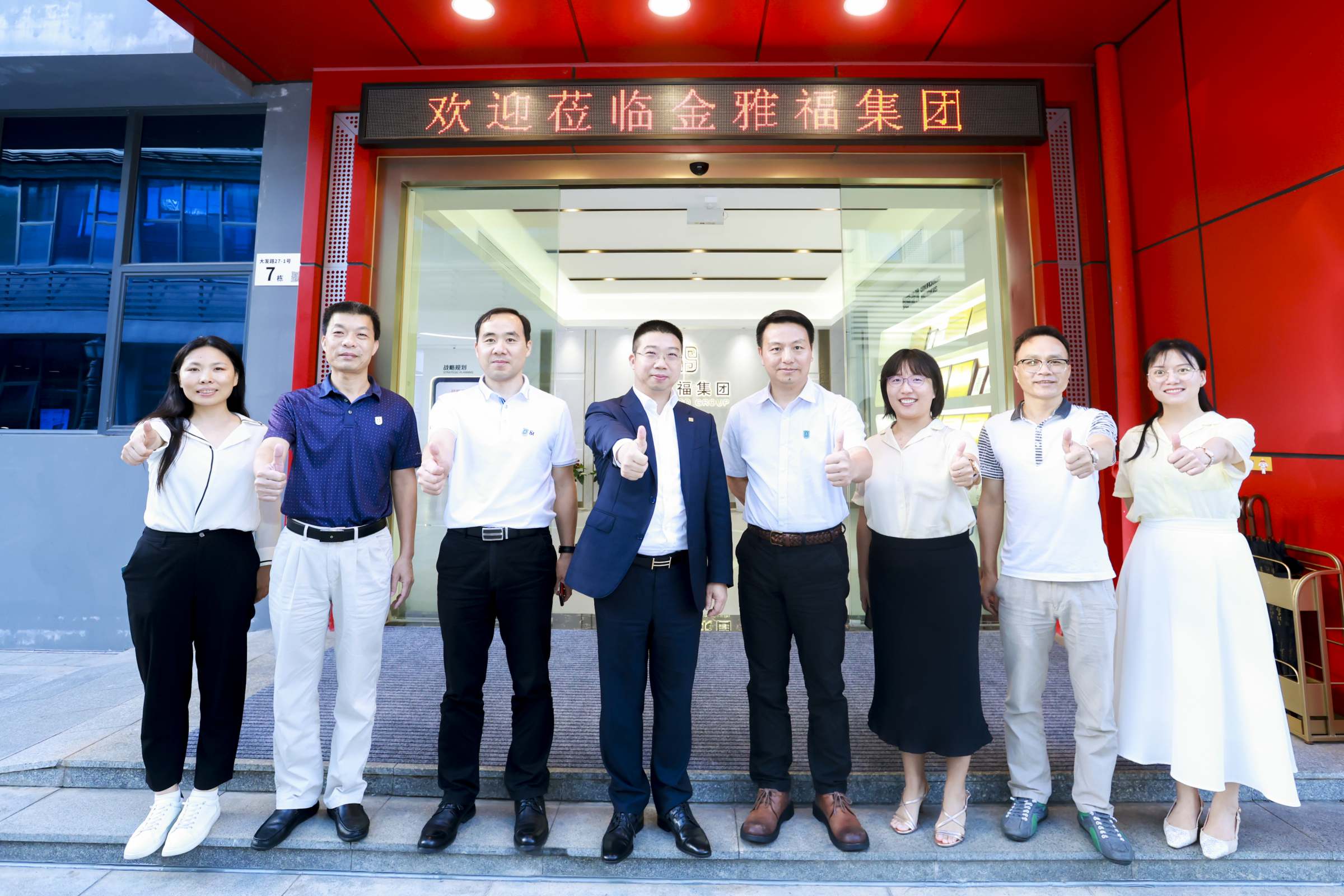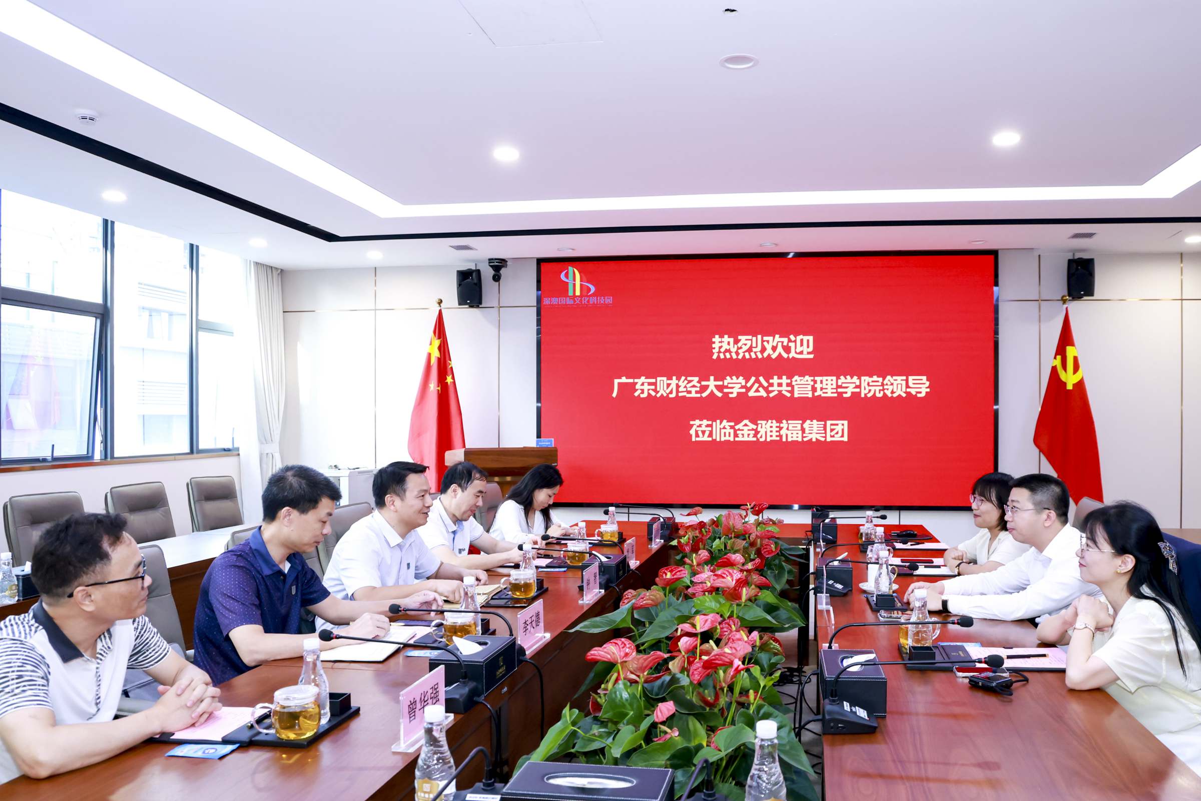 2023年5月26日, 公共管理学院党委书记钟智、副院长姚军(主持工作)、院党委副书记李天德、院党委委员曾华强、院党委委员王妙妙(系主任)一行赴深圳分别走访乐有家控股集团、金雅福集团,开展访企拓岗促就业专项行动。乐有家控股集团校园招聘总监杨敏、招聘经理麦钰陶、广州分公司招聘经理吴梦娜参加了会谈。金雅福集团董事长黄仕坤,人力资源总经理王琦、人力资源副总经理黄洁参加了会谈。