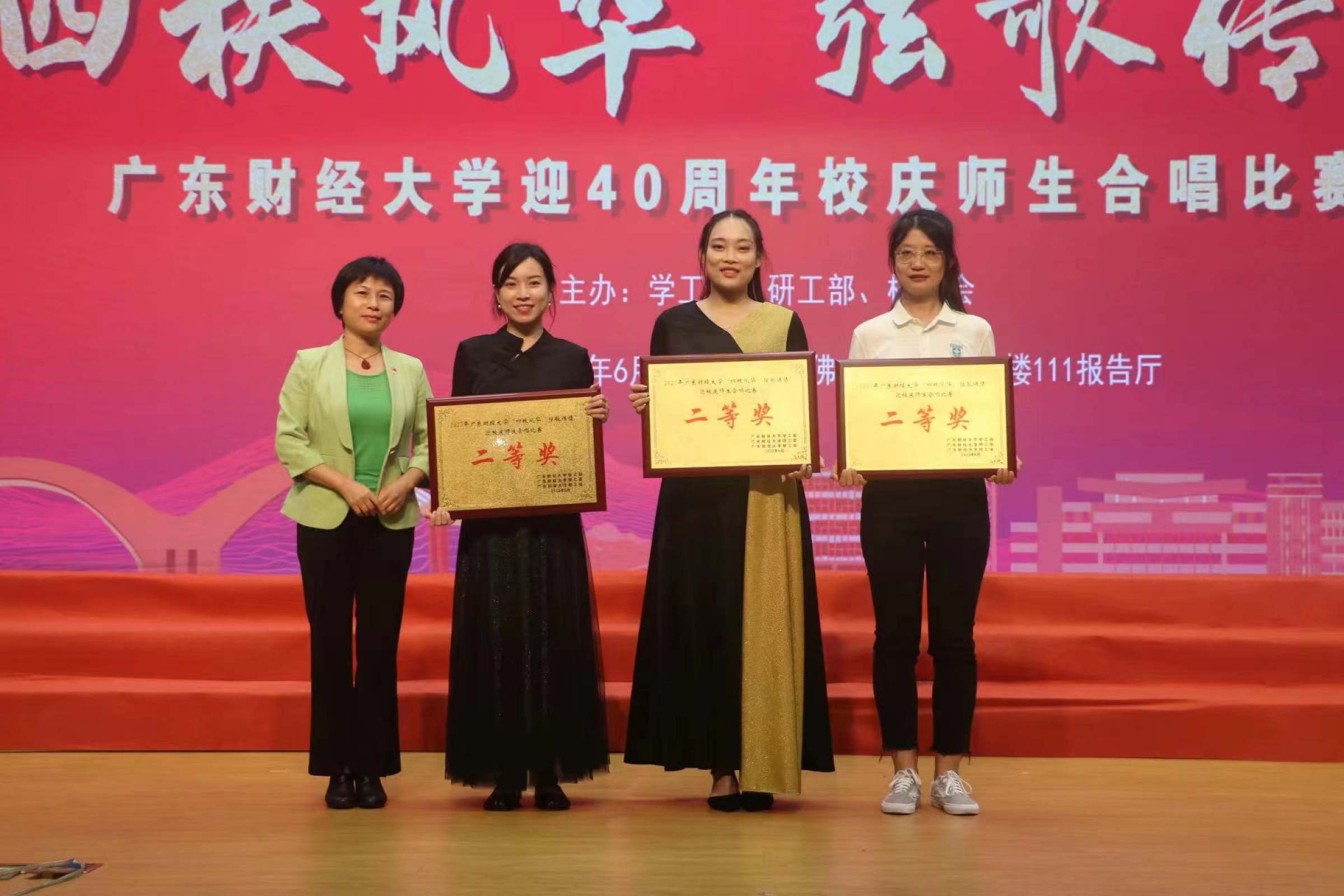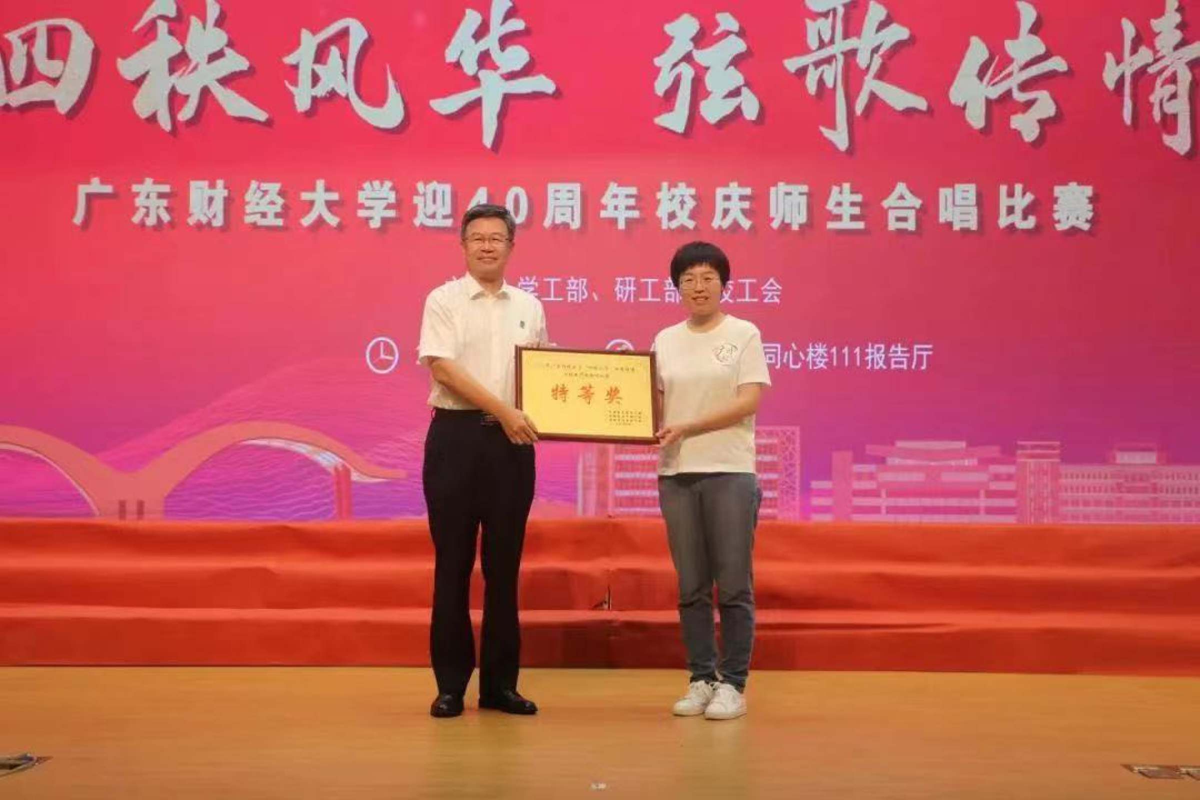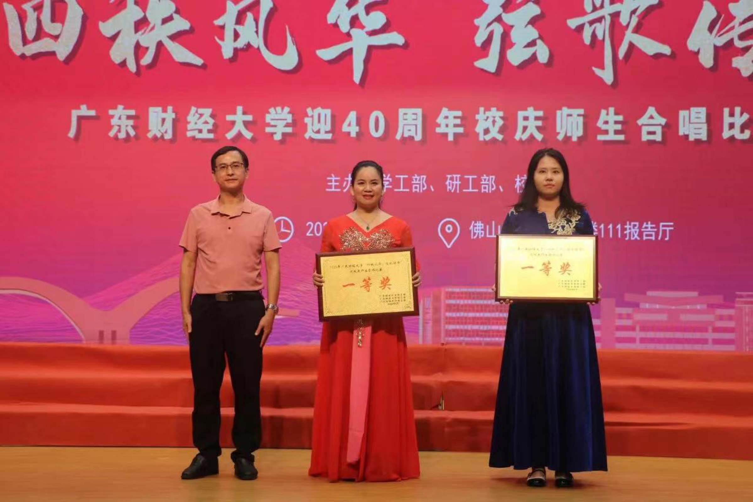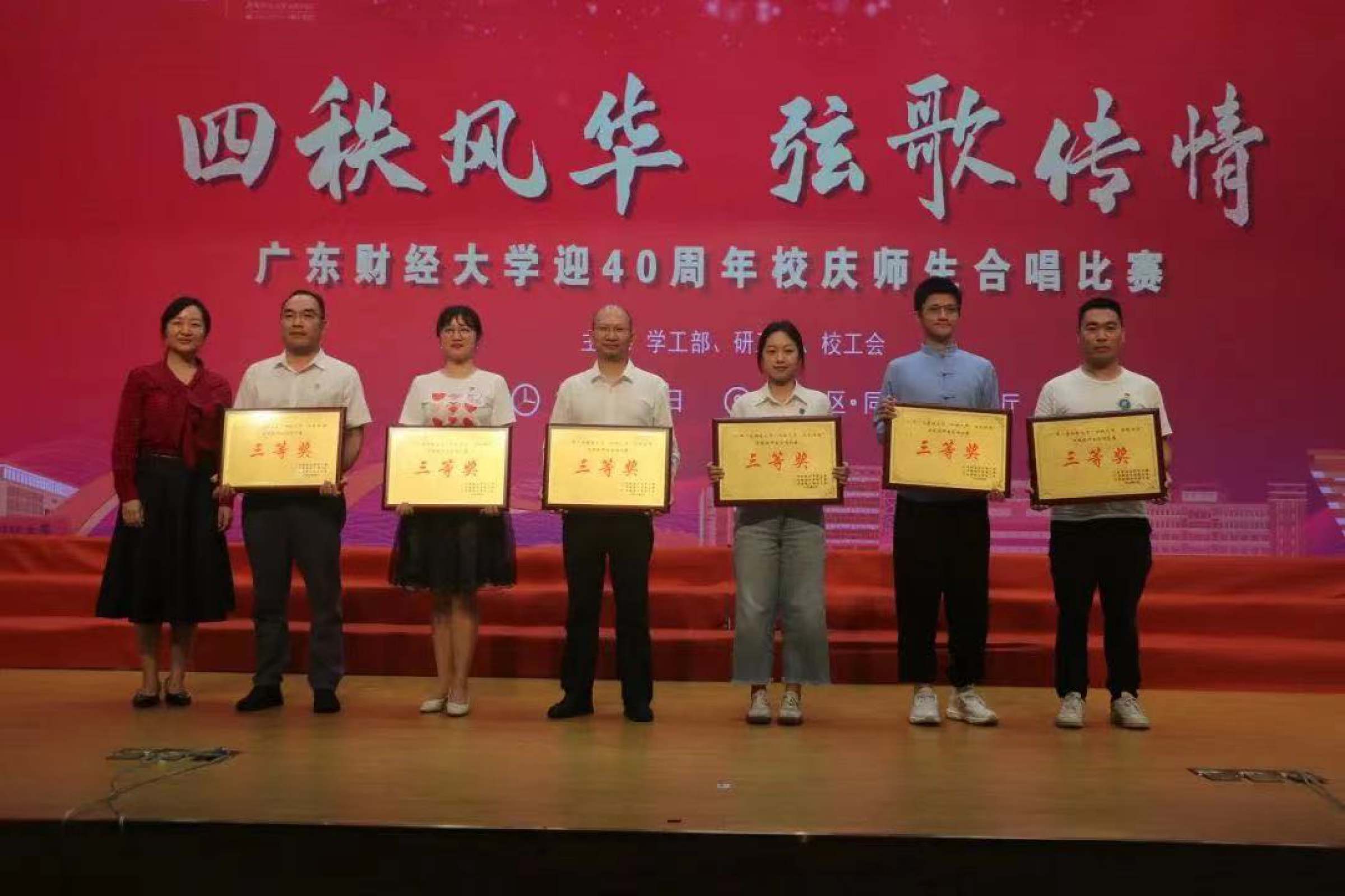副校长陈国栋为外国语学院合唱队颁发特等奖,学工部部长苏明华、校工会常务副主席陈红丽、校区管委会副主任郑田、学工部副部长钟雄星分别为其他获奖代表队颁奖。