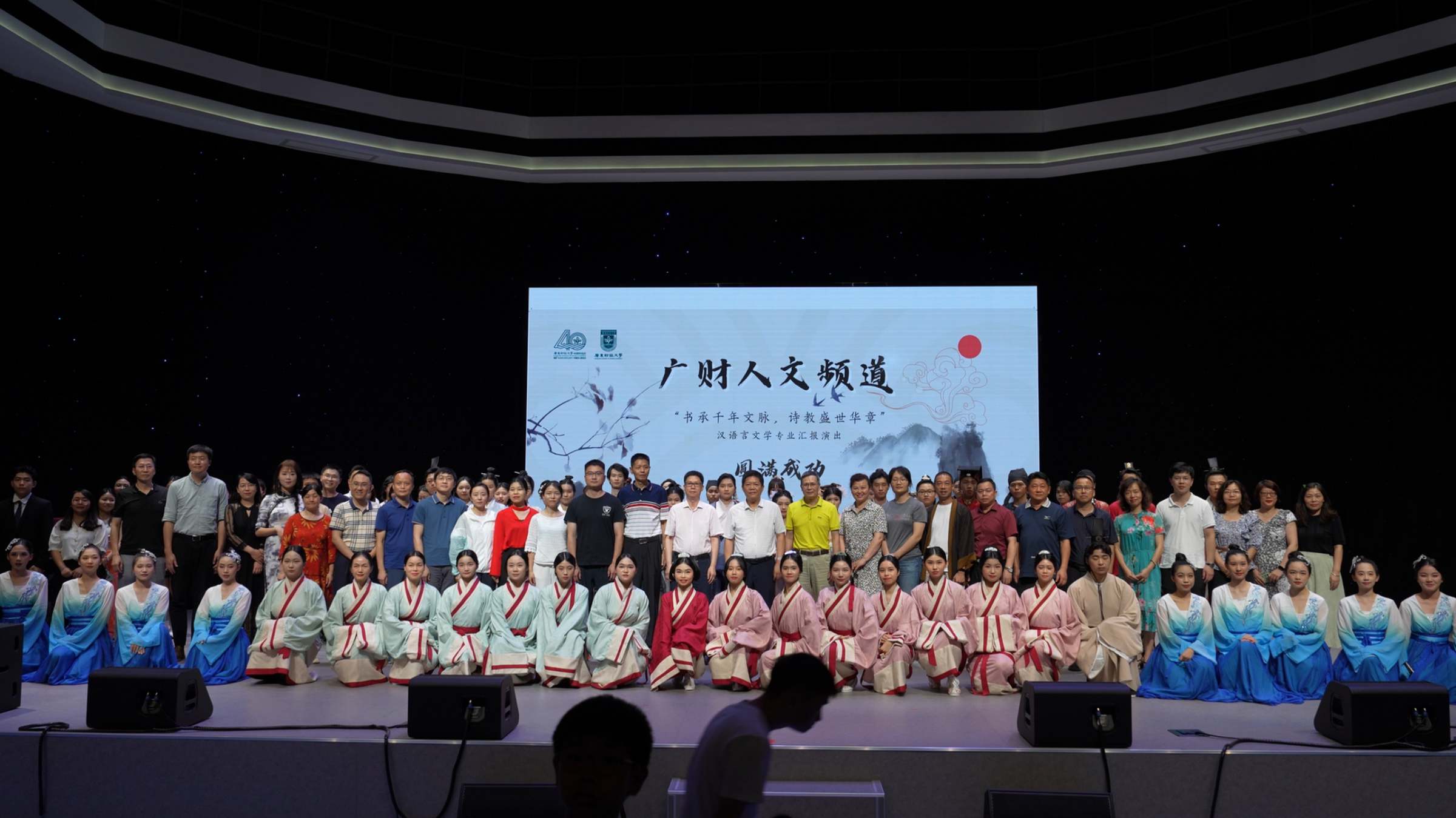 为落实立德树人根本任务,迎接学校四十周年校庆,6月18日下午,由人文与传播学院、网络传播学院(合署)主办,中国语言文学系承办、我校普通话培训测试站协办的广财人文频道暨“书承千年文脉,诗教盛世华章”汉语言文学专业汇演开篇——“历代风华卷”举办。出席本次汇演的校外嘉宾有广东省秘书学会会长黄庆勇等人, 校党委副书记刘祖华、相关职能部门负责人观看了整台演出。