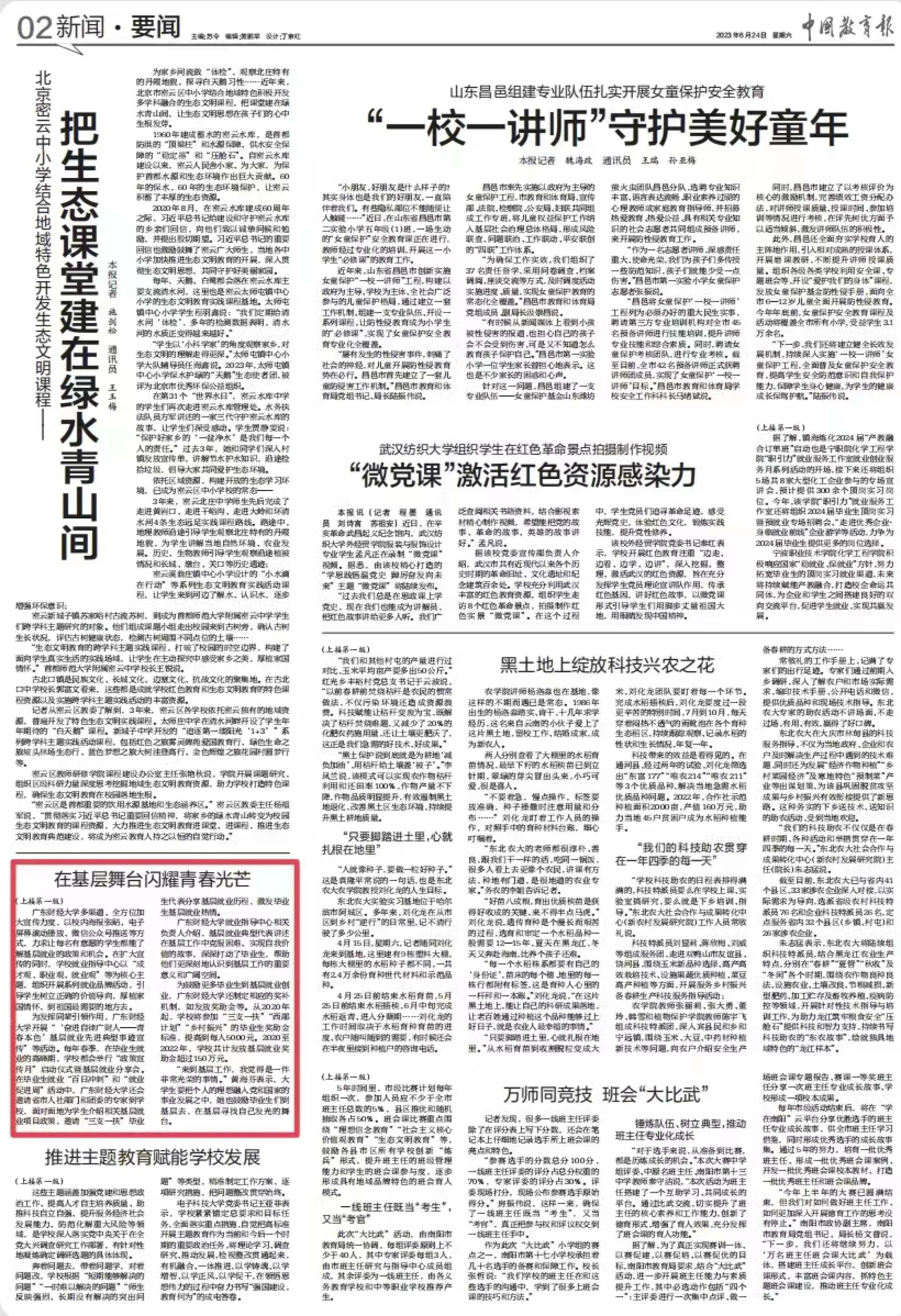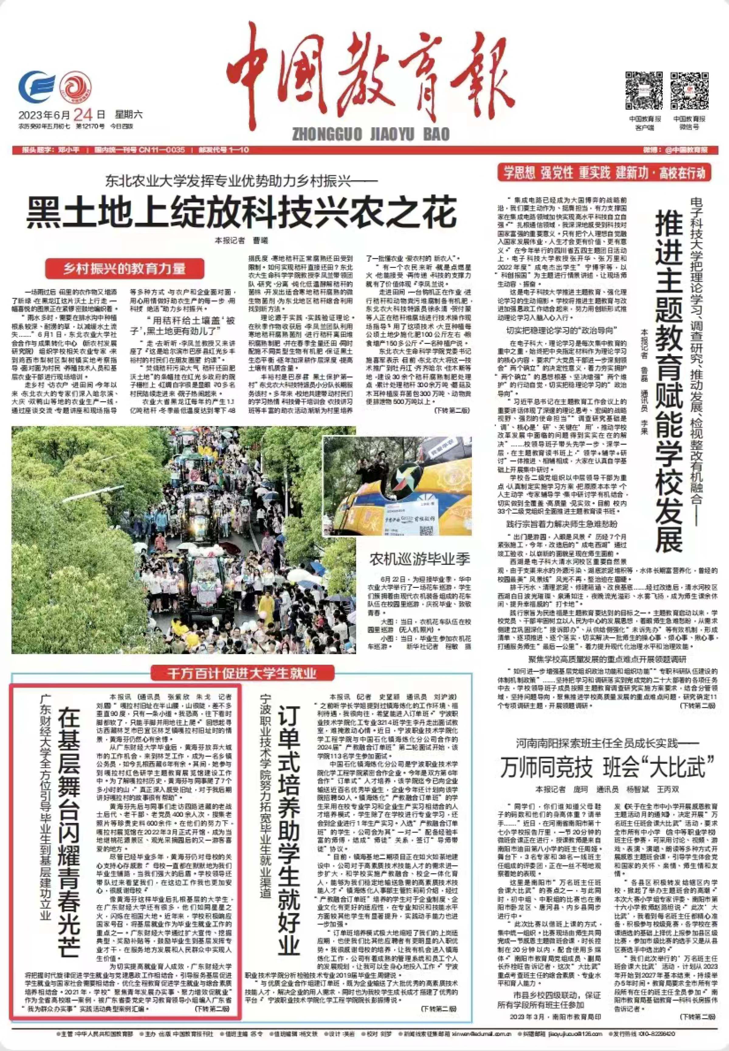 6月24日,中国教育报头版要闻以《广东财经大学全方位引导毕业生到基层建功立业》为题,对我校毕业生就业工作进行报道。报道介绍了我校为提高就业育人实效,将把握时代旋律促进学生就业与党建思想政治工作相结合,学校通过开展大型主题活动,树立正确的价值导向,以“成才观、职业观、就业观”为核心主题性系列就业指导品牌,先后开展了“‘奋进自律广财人——青春本色’基层就业先进典型事迹宣传”“政策宣传月”暨基层就业分享会等活动,引导和支持毕业生服务国家需求“大舞台”,引导毕业生到基层、到祖国需要的地方去就业。