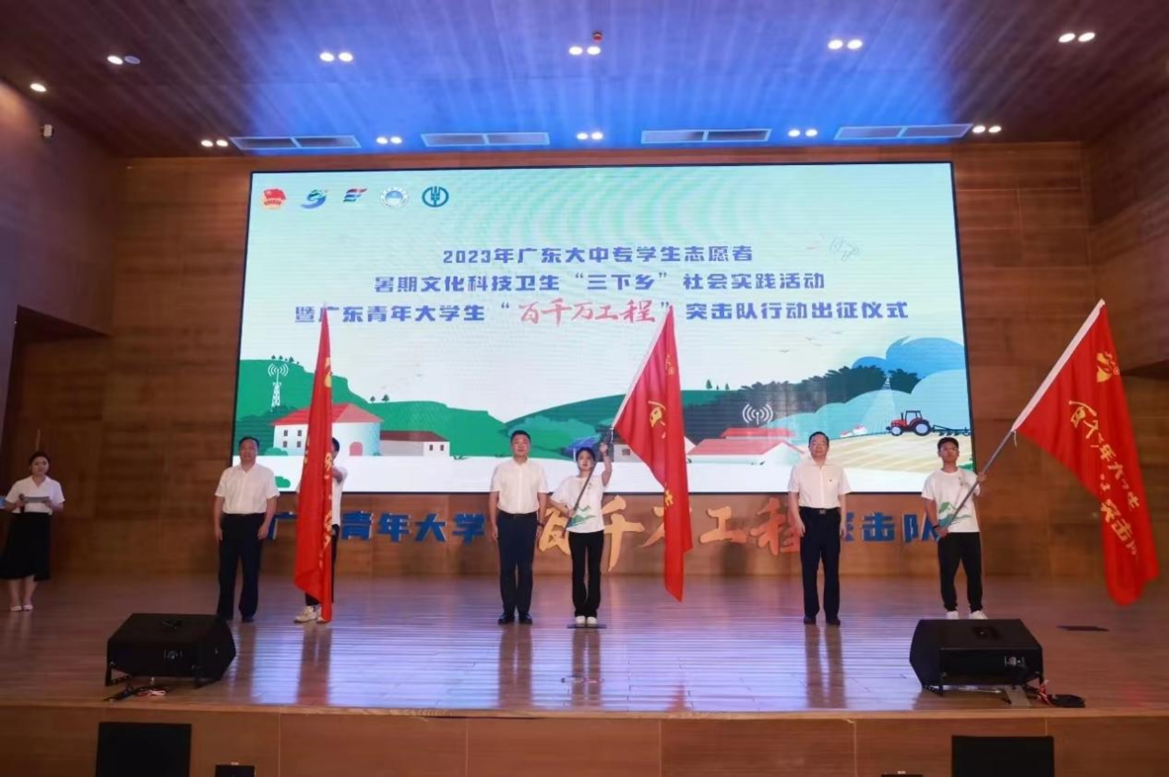 7月7日,2023年广东大中专学生志愿者暑期文化科技卫生“三下乡”社会实践活动暨广东青年大学生“百千万工程”突击队行动出征仪式在华南理工大学举行。