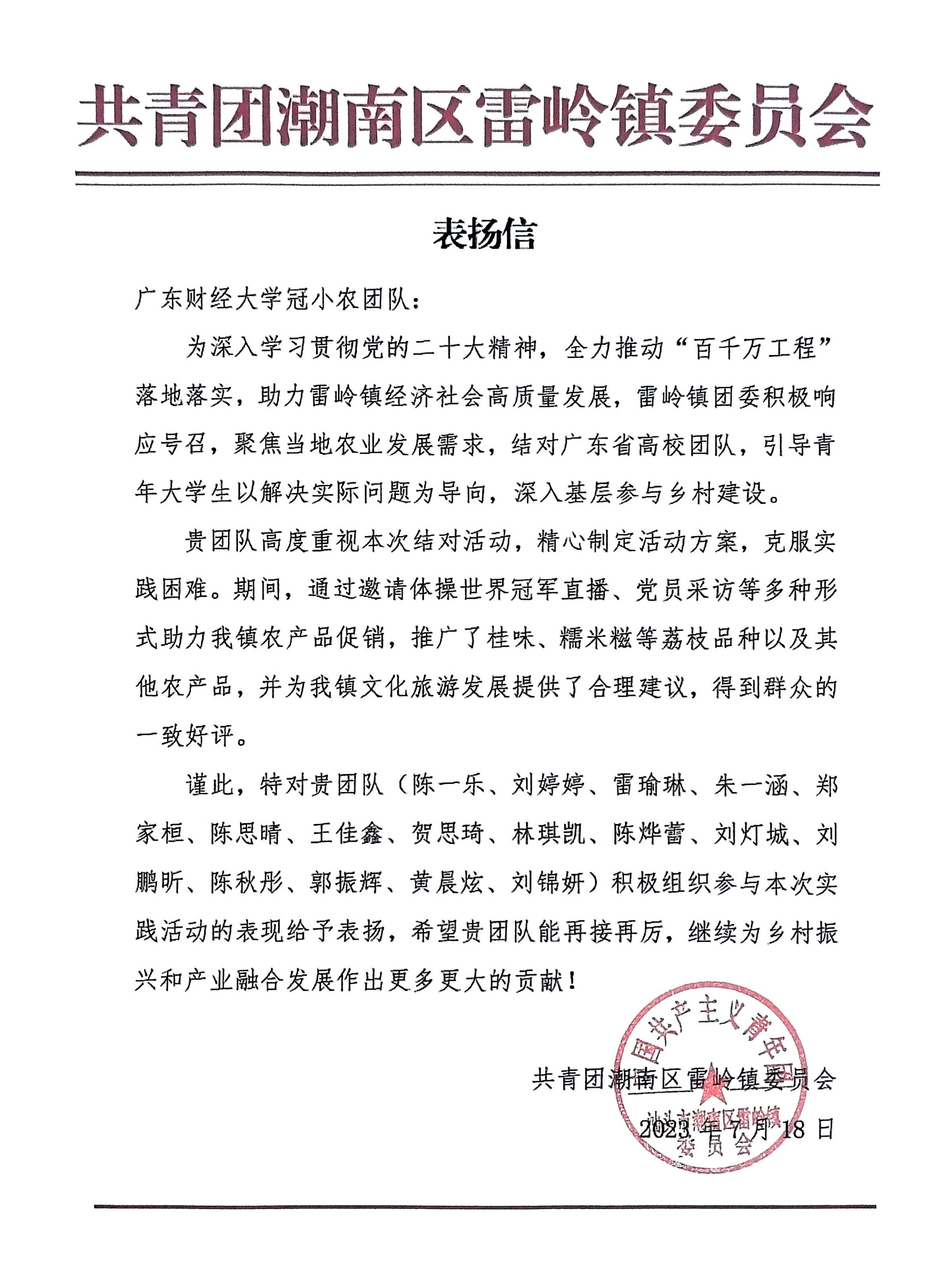 “广东财经大学的冠军助农实践团队在直播过程中的表现非常优异,能够巧妙地将冠军精神与雷岭的荔枝推广相结合,充分展现了的求实创新的团队风貌与精益求精的实践精神,为雷岭的乡村振兴事业开创了一条新思路。”汕头市茶荔友农企科技有限公司负责人张炳洪赞扬道。