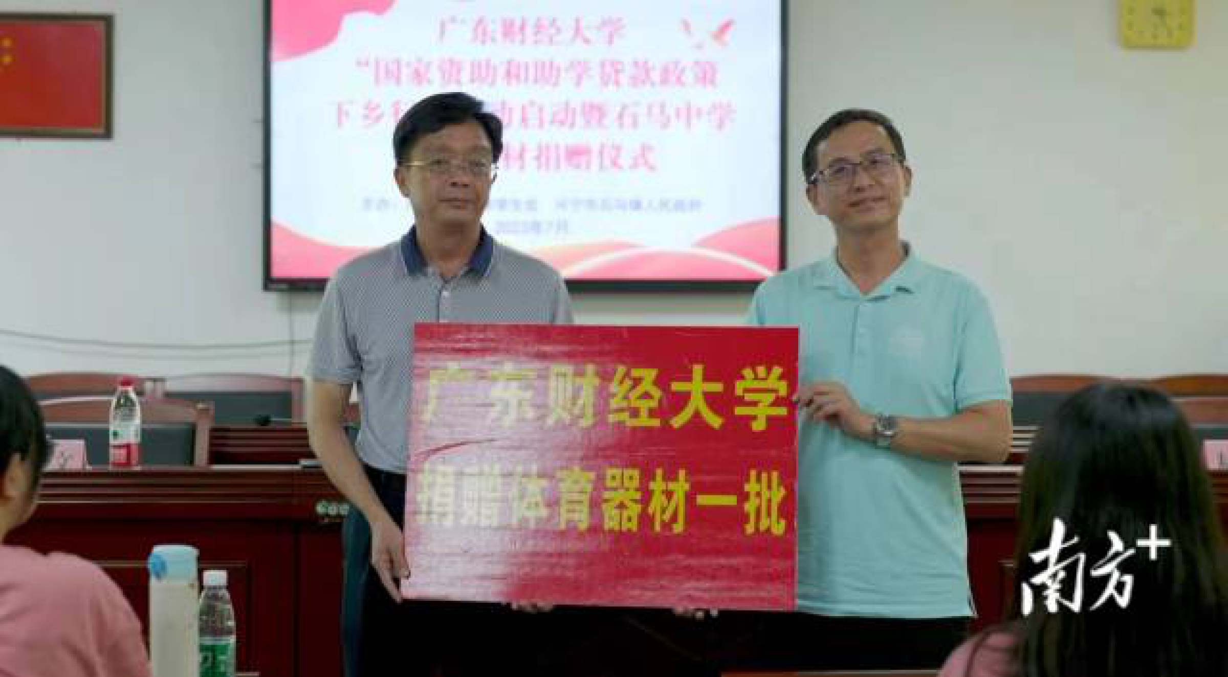高考录取结束后,为全面贯彻党的二十大提出的“完善覆盖全学段学生资助体系”要求,加大广东省学生资助及助学贷款政策宣传力度,帮助家庭经济困难学生坚定求学向上信心,广东财经大学“满天星筑梦实践队”和驻镇工作队首先在石马中学举行2023年“国家资助与助学贷款政策下乡行”活动启动暨体育器材捐赠仪式。