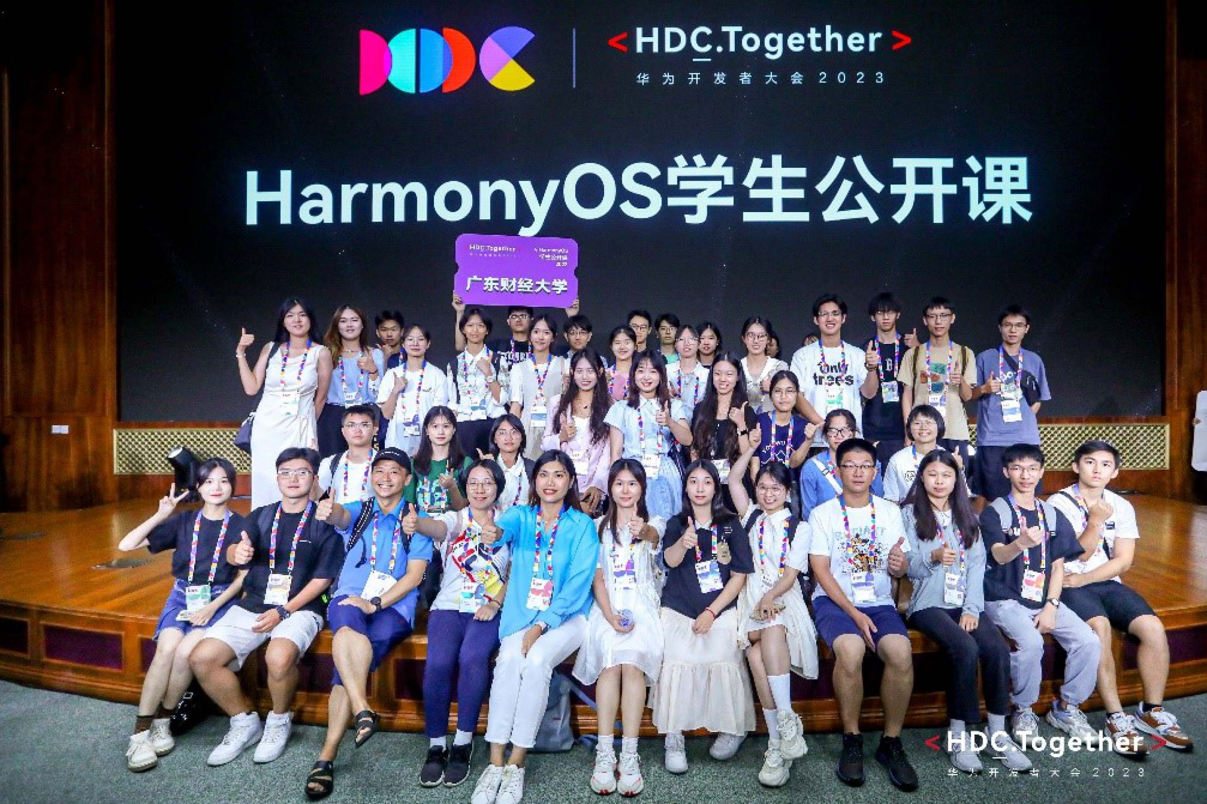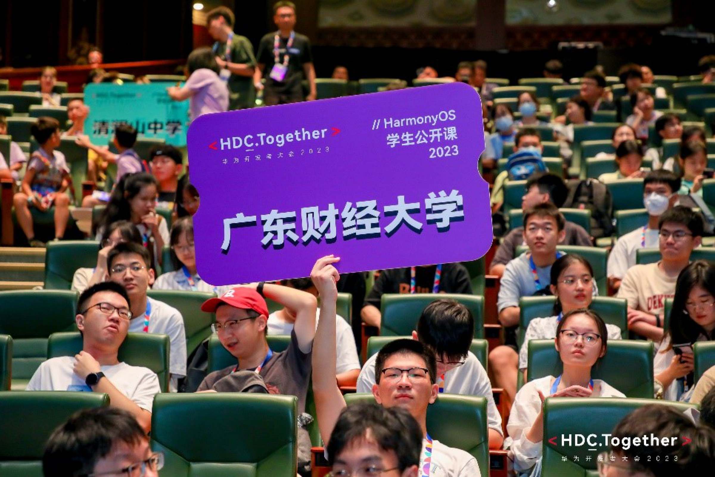一年一度的华为开发者大会是华为面向全球合作伙伴及开发者分享自身生态战略,展示最新技术和支持计划的活动。而华为开发者大会的HarmonyOS学生公开课,定位于为校园开发者带来鸿蒙最新的技术动态和优秀实践。广东财经大学是华为HarmonyOS学生公开课现场正式邀请的唯一财经大学,42名广财学子与清华大学、北京大学、哈尔滨工业大学等高校学生齐聚会场,和华为高级技术专业专家、生态伙伴资深专家畅谈HarmonyOS鸿蒙未来,共话HarmonyOS鸿蒙力量。