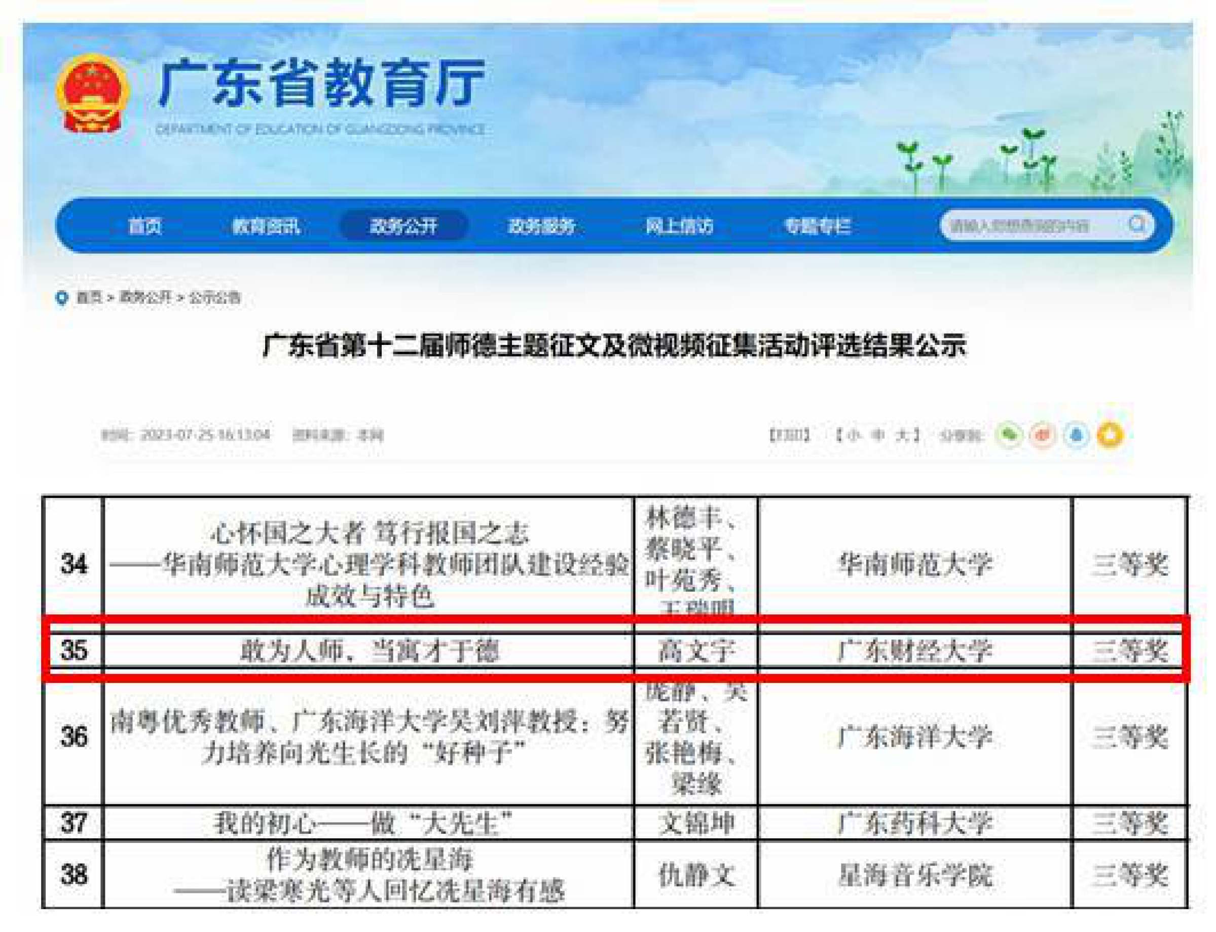 近日,广东省教育厅公布了《广东省第十二届师德主题征文及微视频征集活动评选结果》。其中,我校数字经济学院高文宇老师征文作品《敢为人师,当寓才于德》获评征文高校(本科)组三等奖。