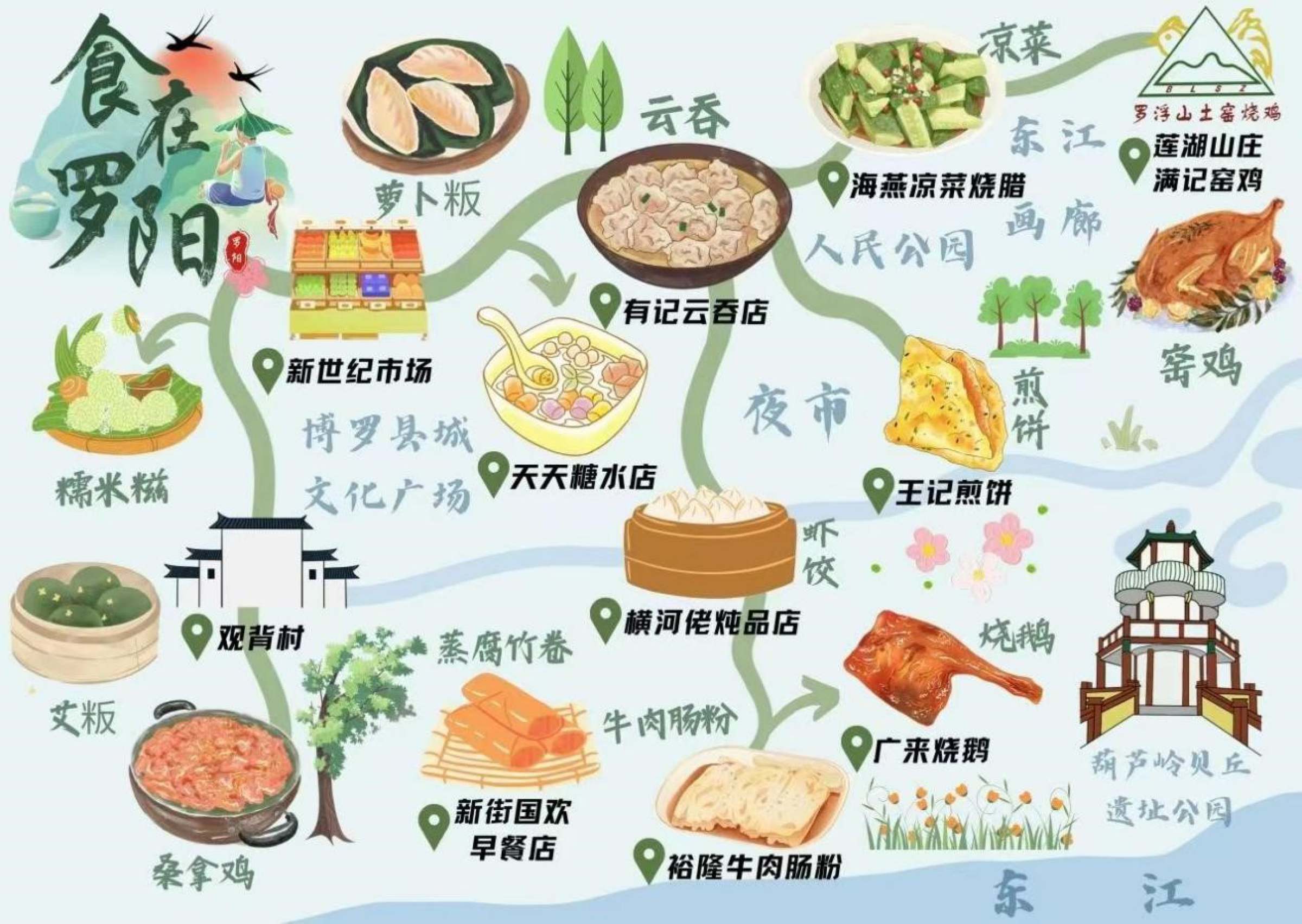 通过实地调研,团队发现,罗阳美食和老字号餐饮店众多,老城早茶极具特色。但店铺对外知名度低,品牌竞争力弱。当地美食文旅发展中还存在缺乏美食IP形象、文创产品不足、宣传模式单一等问题。针对上述问题,团队认为,罗阳本地可将“老城+美食”作为文旅发展的核心定位,积极利用社交媒体对老城建筑、老城美食进行宣传,如采用直播形式让外界看到罗阳的特色建筑和美食,破除外界对老城落后陈旧的刻板印象。同时积极举办主题活动、开发系列文创产品等。目前,团队已为罗阳设计出美食宣传海报、品牌logo、“美食+景点”的卡通攻略地图、美食探店推文、宣传视频等。