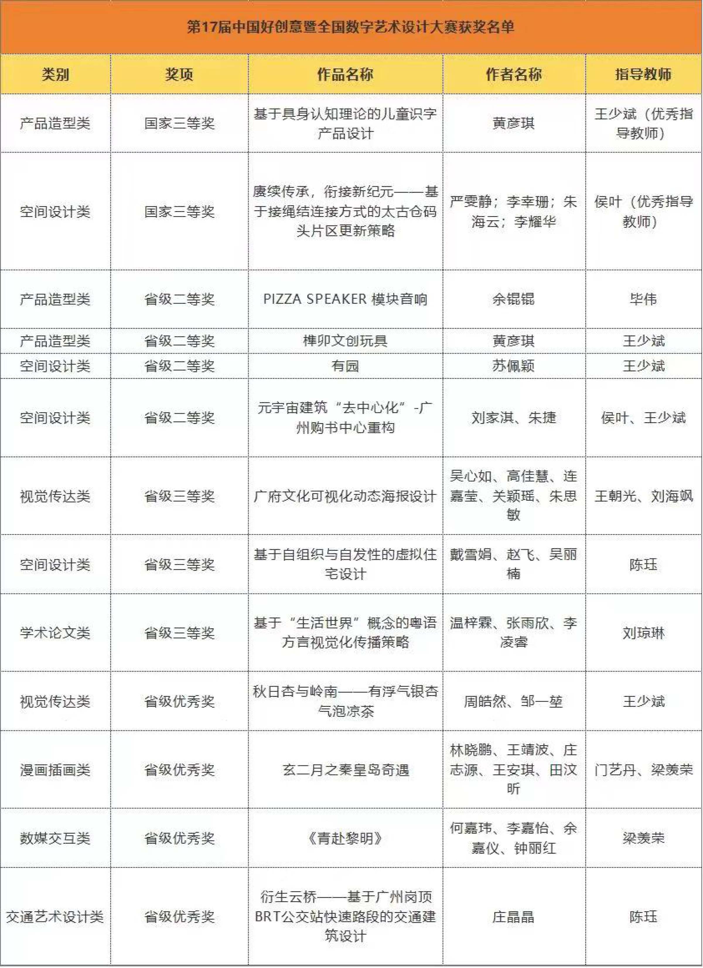 我校艺术与设计学院积极组织师生参赛,共投稿作品56份,最终获得国家级三等奖2项;获广东省级奖项11项,其中二等奖4项,三等奖3项,优秀奖4项;获优秀指导教师2人。