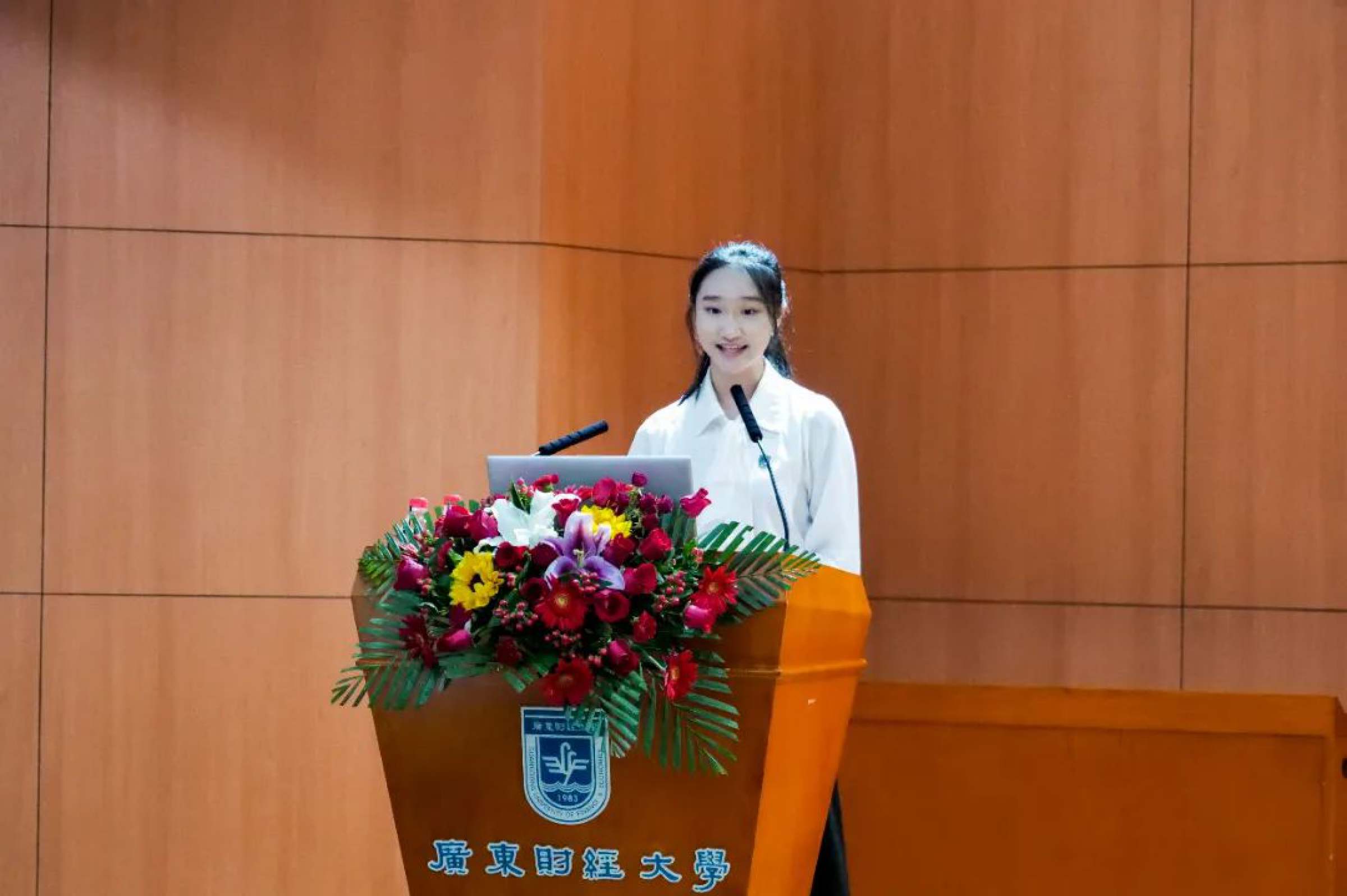 法学院学生陈依柠作为学生代表发言,她对教师们从专业知识到生活智慧的无私授业和耐心教导表示感谢,她代表全体广财学子向躬耕教育、无私奉献老师们致以最真挚的敬意和祝福!