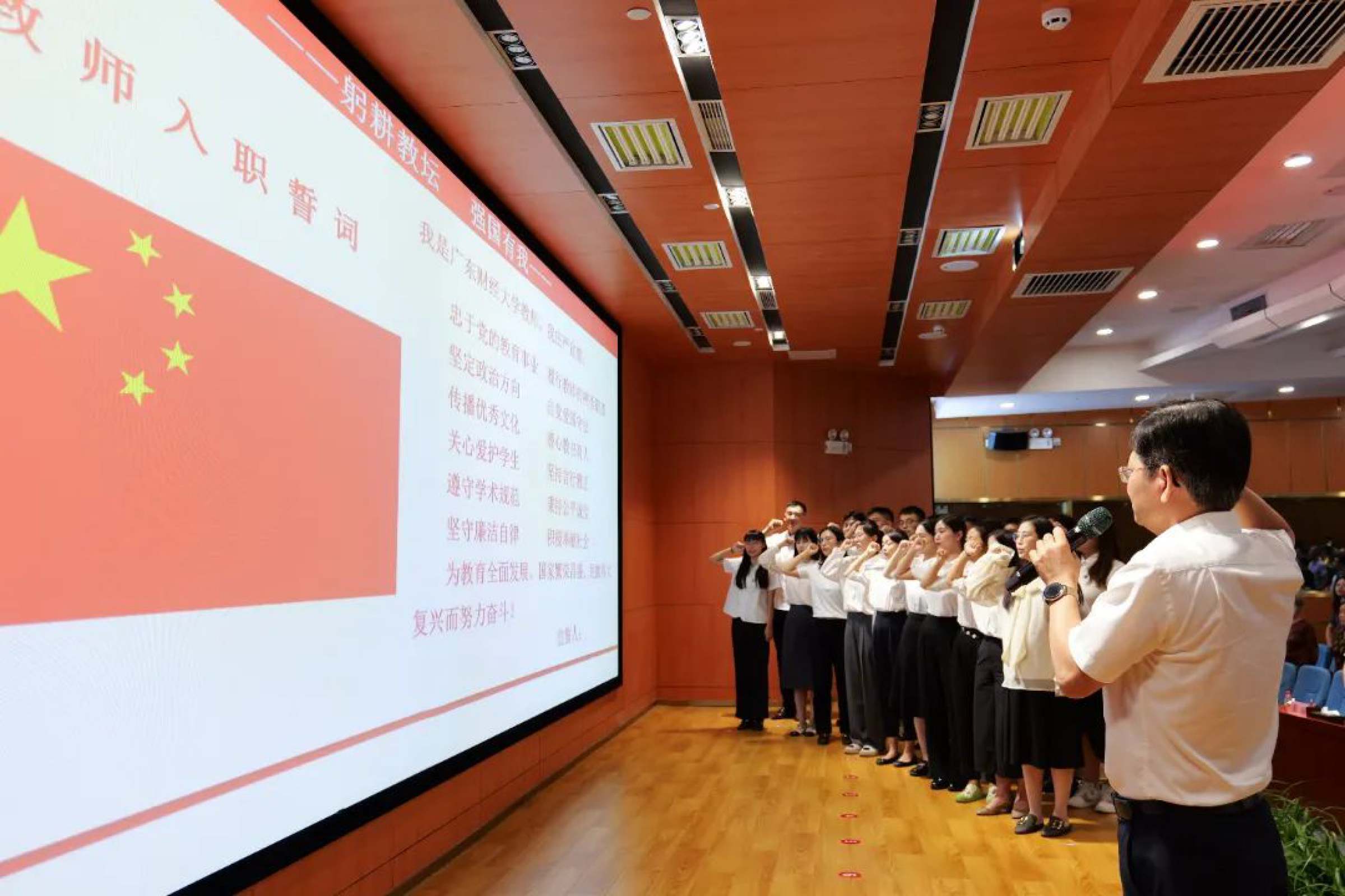 于海峰为新入职教师代表颁发校徽。罗贤甲带领全体新入职教师郑重宣誓,铿锵有力的誓词响彻整个会场。
