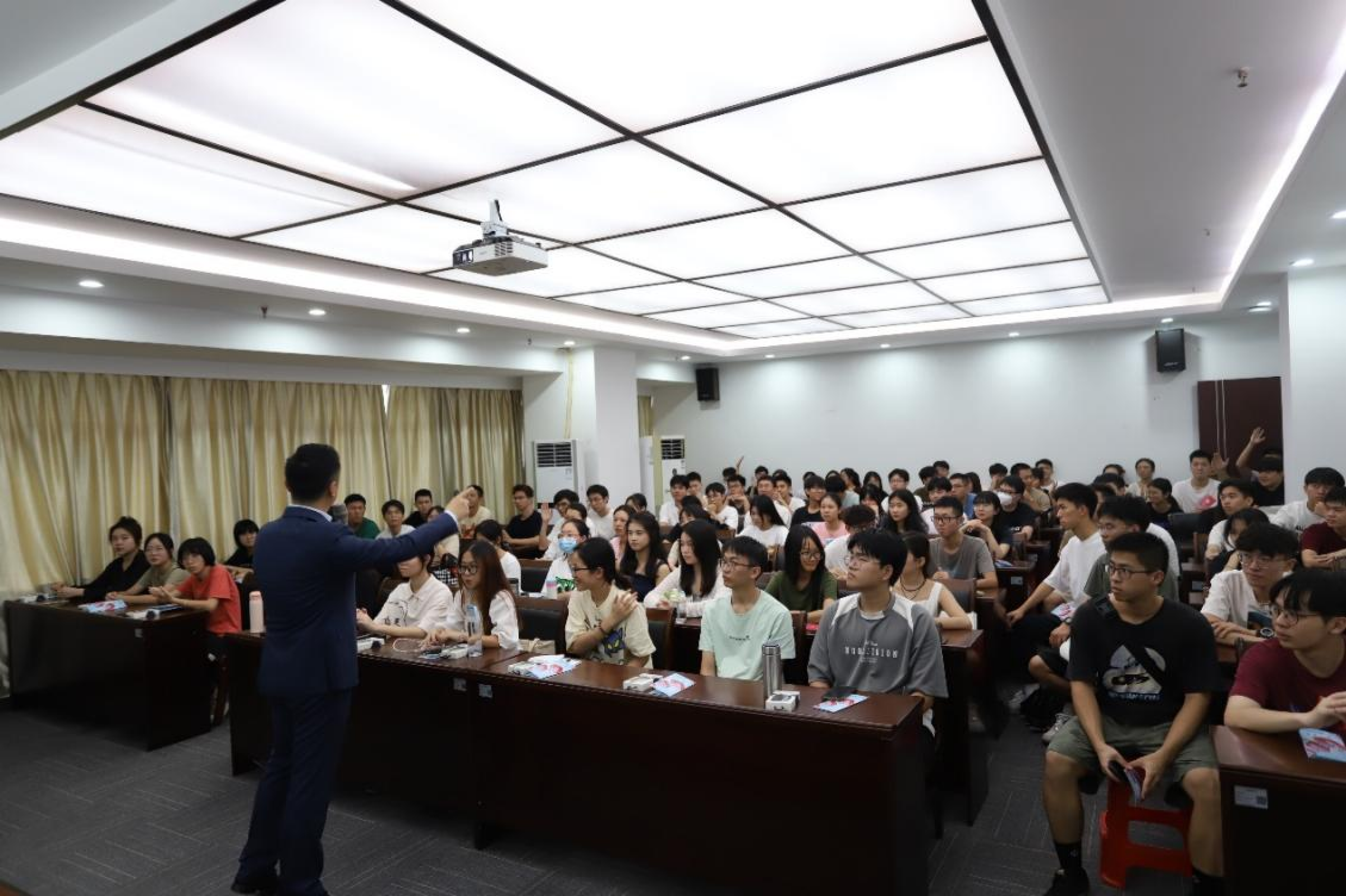 宣讲会开始,合富辉煌集团人力资源部招聘副总监司疆为大家介绍了集团概况和企业文化,合富辉煌集团人力资源部培训副总监刘欣则着重为同学们介绍了2024年合富星青年管培生培养计划的细则以及历届管培生的成长路径,最后2019届校友苏昭彬用自己的亲身经历跟大家分享了在合富辉煌工作的体验。随后进入提问环节,到场的两位老师也跟大家零距离沟通,为同学们答疑解惑、指点迷津。