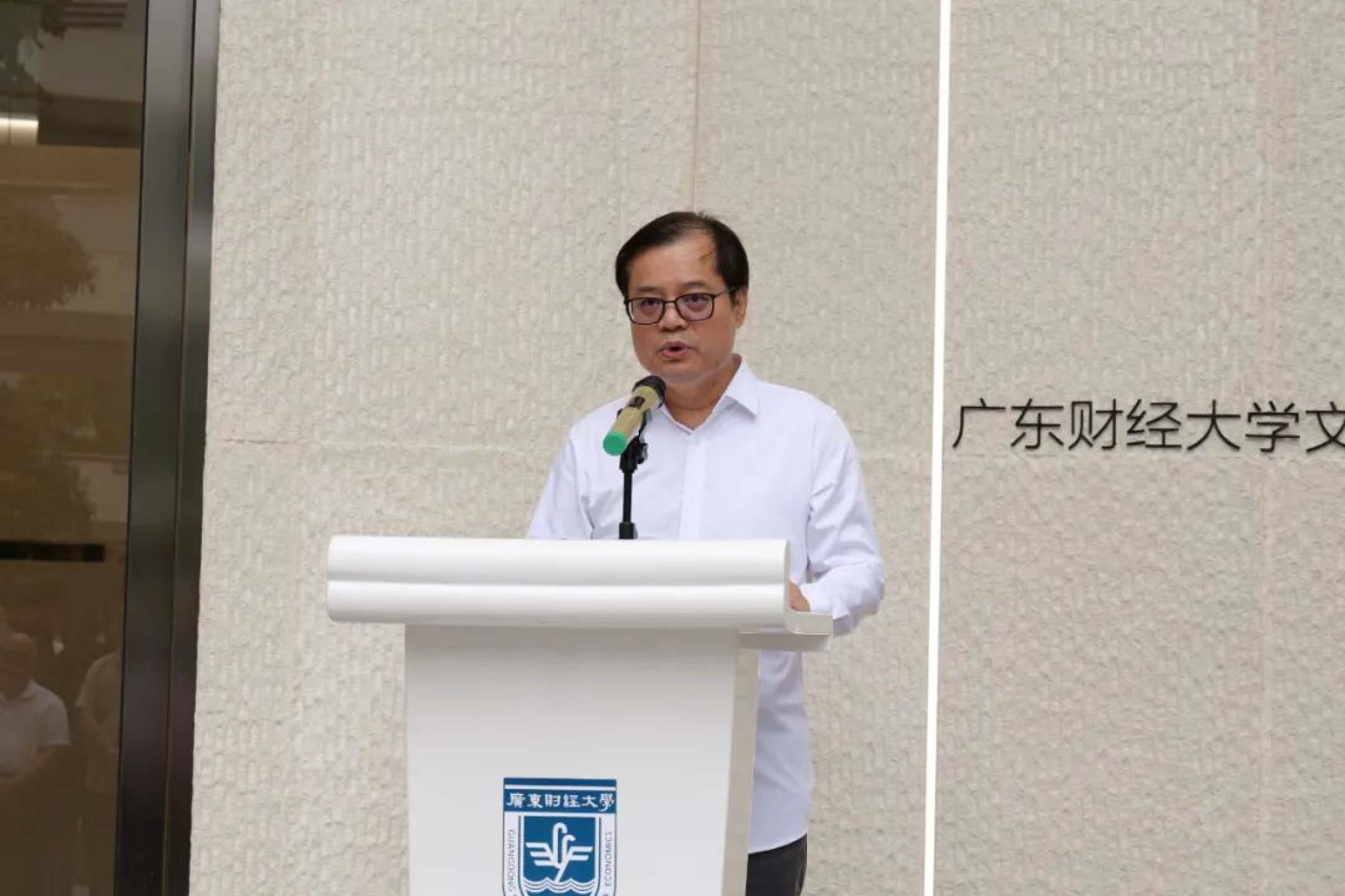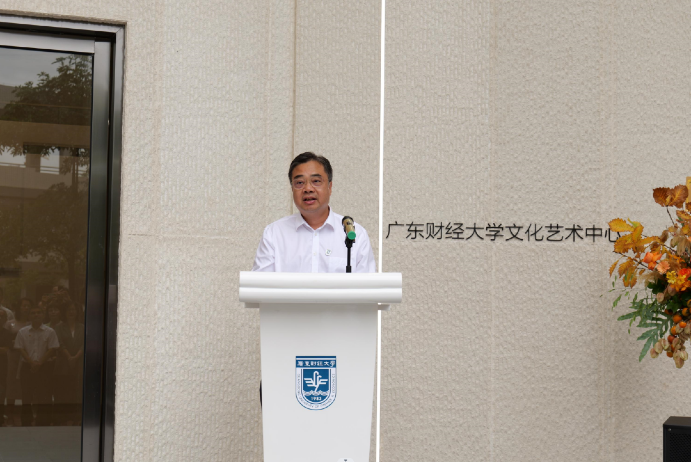 郑贤操讲话。他向参与文化艺术中心筹建、施工、建设的广东崇正拍卖有限公司和关心支持学校事业发展的各界人士、广大师生校友表示衷心感谢!他高度评价了文化艺术中心的建设和落成,表示文化艺术中心是学校美育和文化建设的一张靓丽名片,是师生文化艺术浸润的重要教学实践载体,也是中华优秀传统文化研究、岭南粤商文化与艺术研究、美育水平与成果展示的重要平台,承担着科产教融合实践教学和研究生产学研协同育人及联合培养等重要职能,同时也是产学研一体化人才培养的重要孵化器,是校企合作共建共赢的实践典范。郑贤操号召广大师生立足新时代新征程,以文化艺术中心创建为契机,深刻把握学校美育的功能属性,以美育人、以美化人、以美培元,遵循美育特点,弘扬中华美育精神,传承和弘扬中华优秀传统文化,推动中华优秀传统文化的创造性转化和创新性发展。