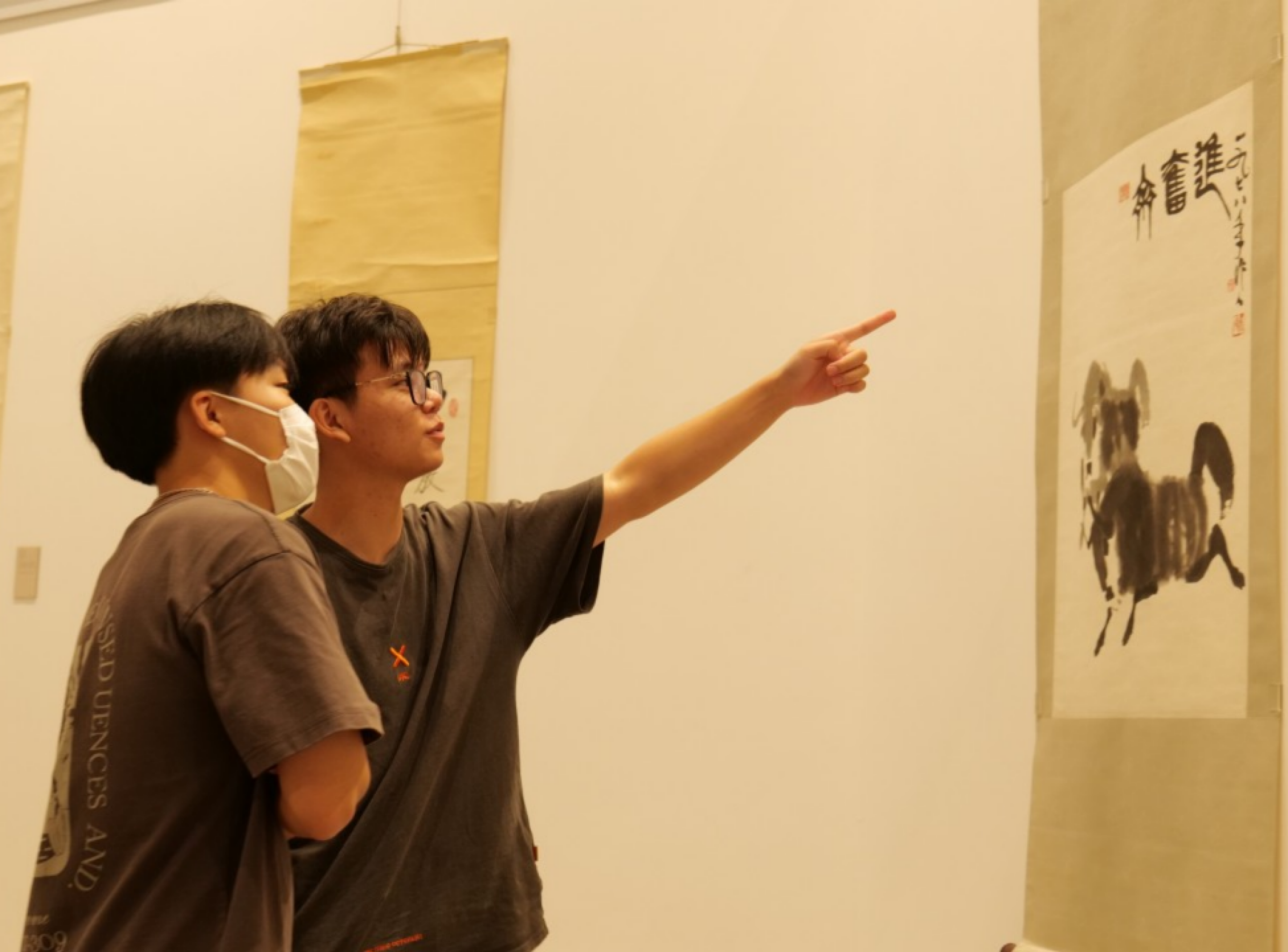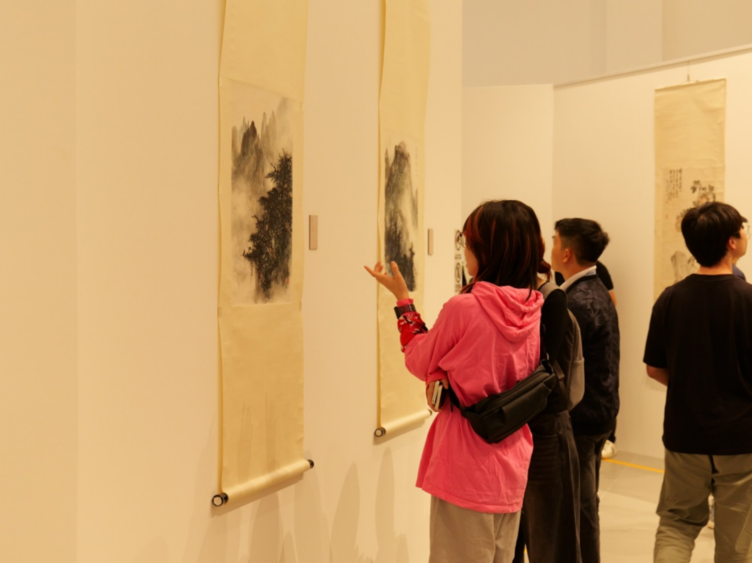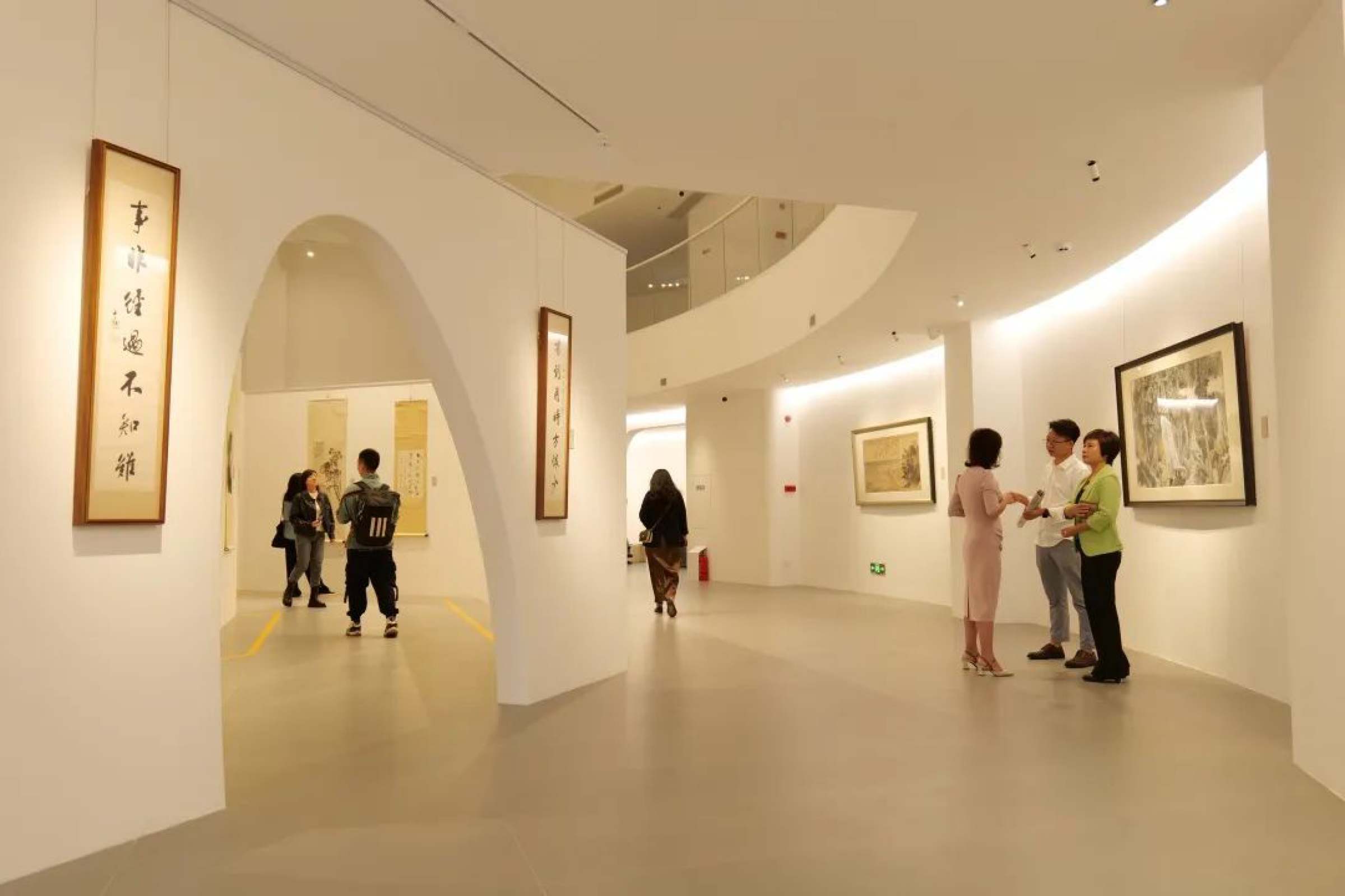 仪式结束后,师生自行进入展馆参观。一入展馆,整体素净的白色背景映入眼帘,曲直线配合的设计,给人以通透空灵之感。清爽的空间内错落有致地陈列着笔墨丹青,大师们的作品笔酣墨饱、行云流水。在场师生停驻在一幅幅作品前,或小声讨论,或沉浸欣赏。