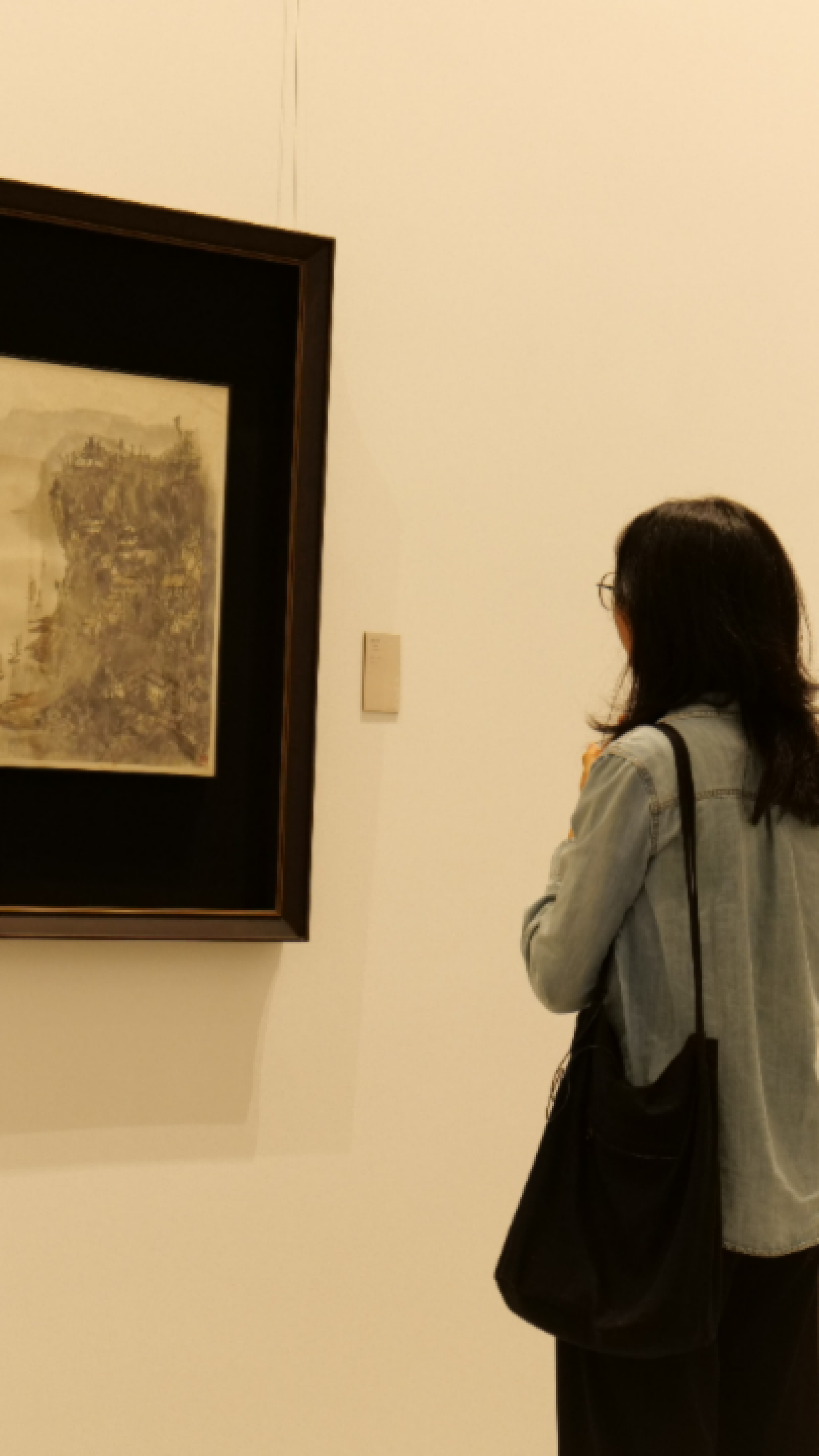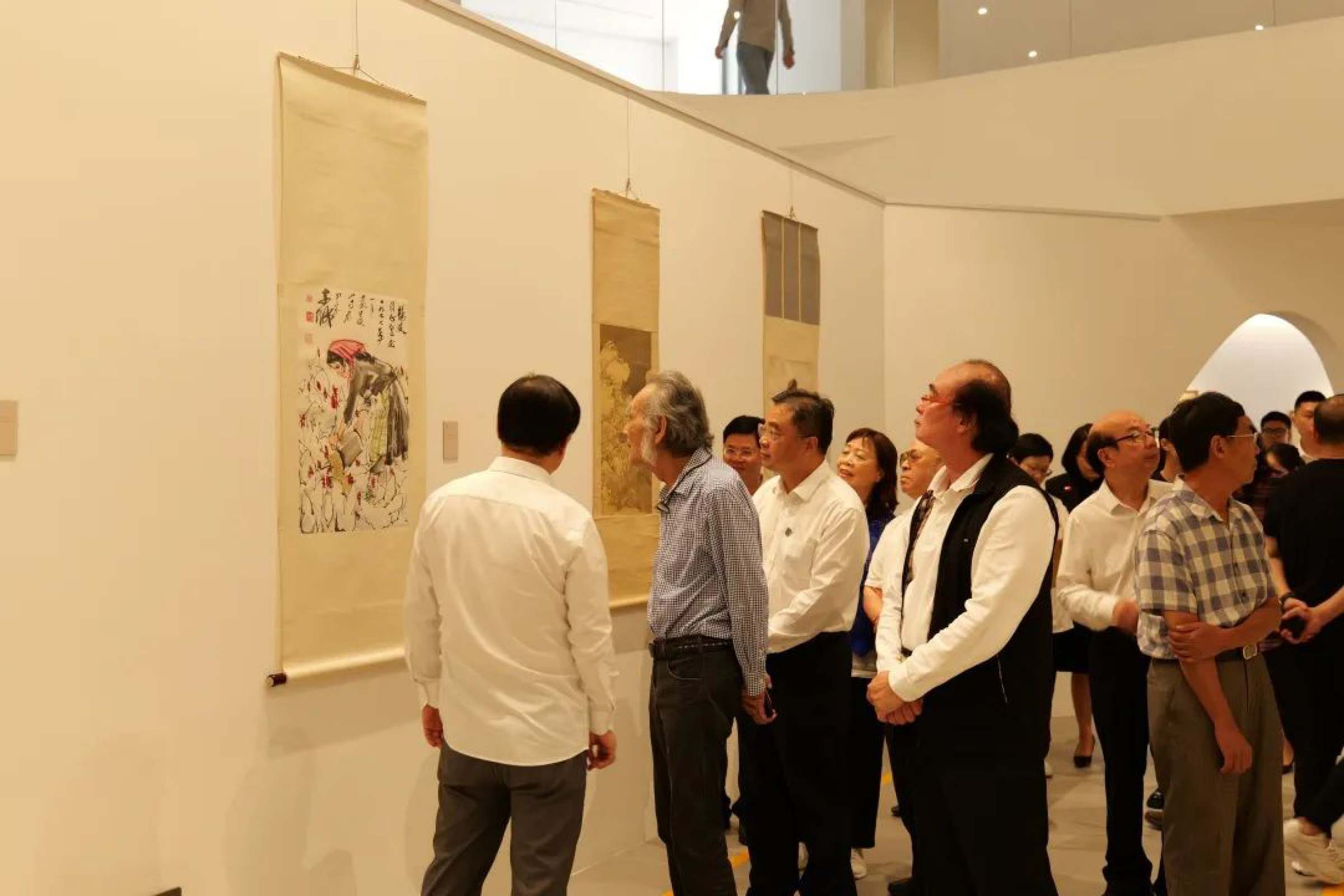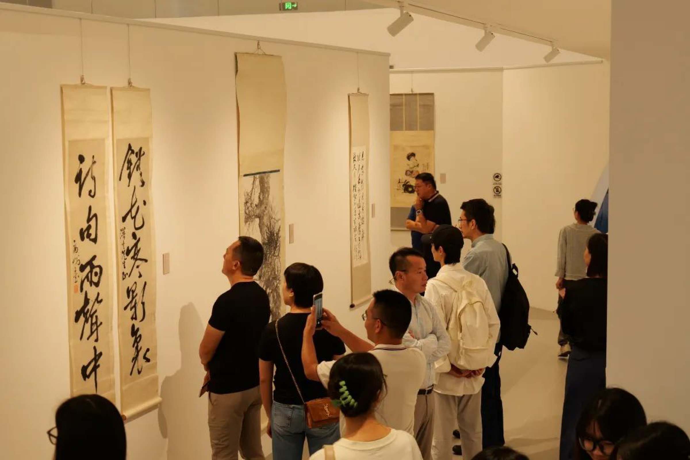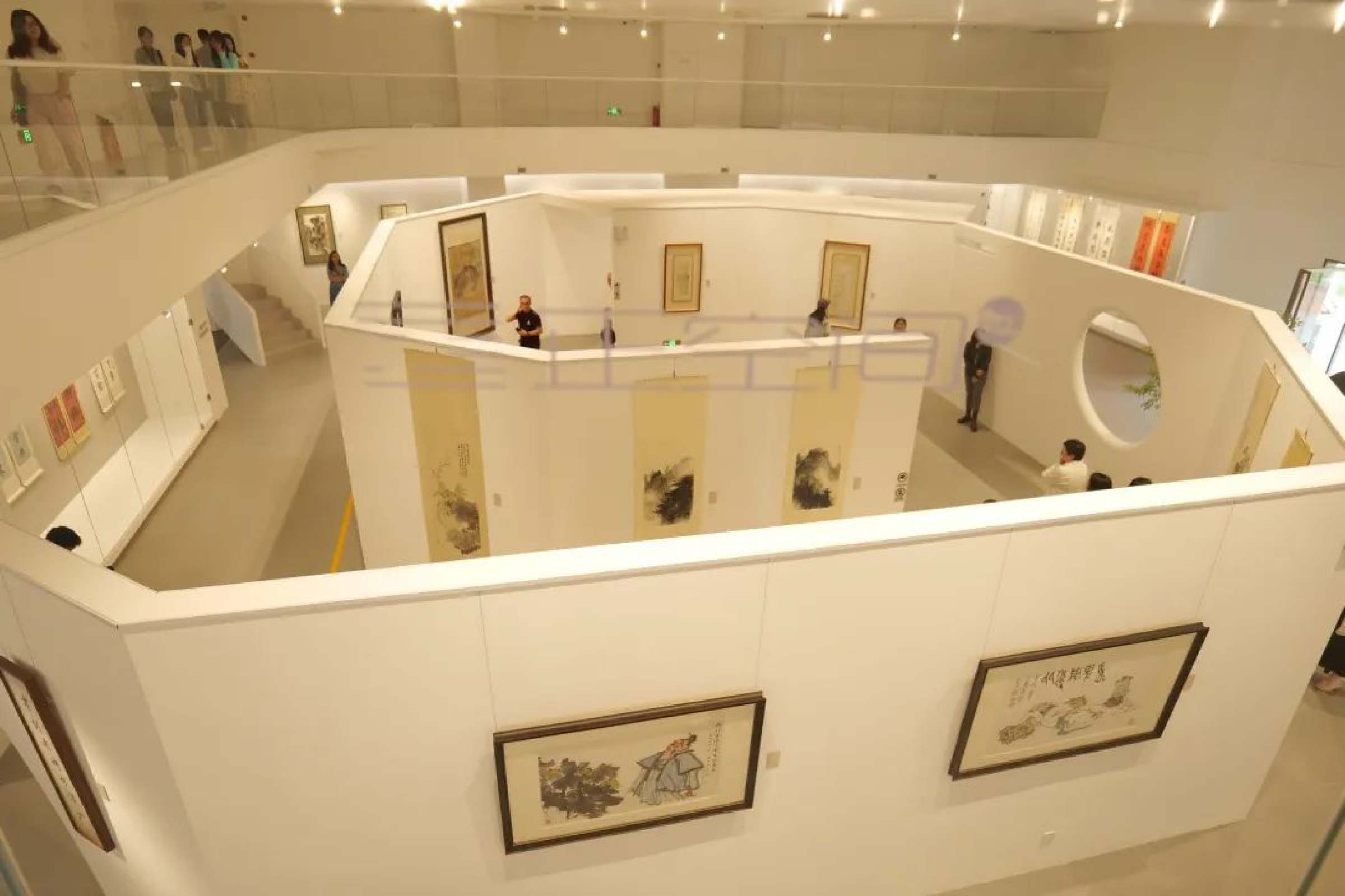 仪式结束后,师生自行进入展馆参观。一入展馆,整体素净的白色背景映入眼帘,曲直线配合的设计,给人以通透空灵之感。清爽的空间内错落有致地陈列着笔墨丹青,大师们的作品笔酣墨饱、行云流水。在场师生停驻在一幅幅作品前,或小声讨论,或沉浸欣赏。