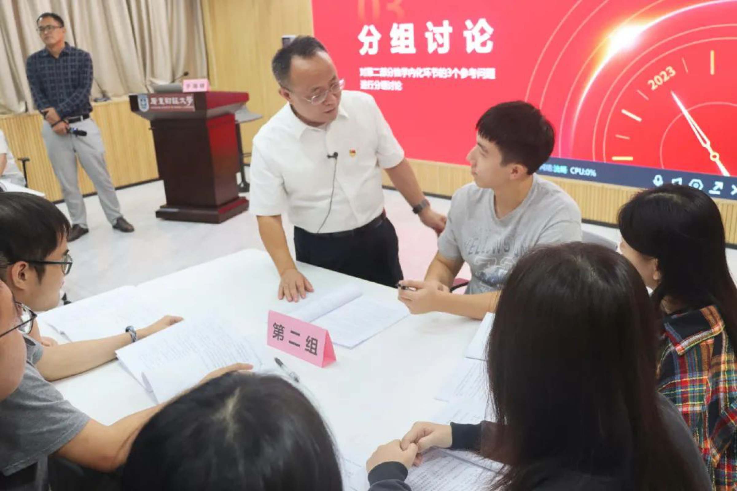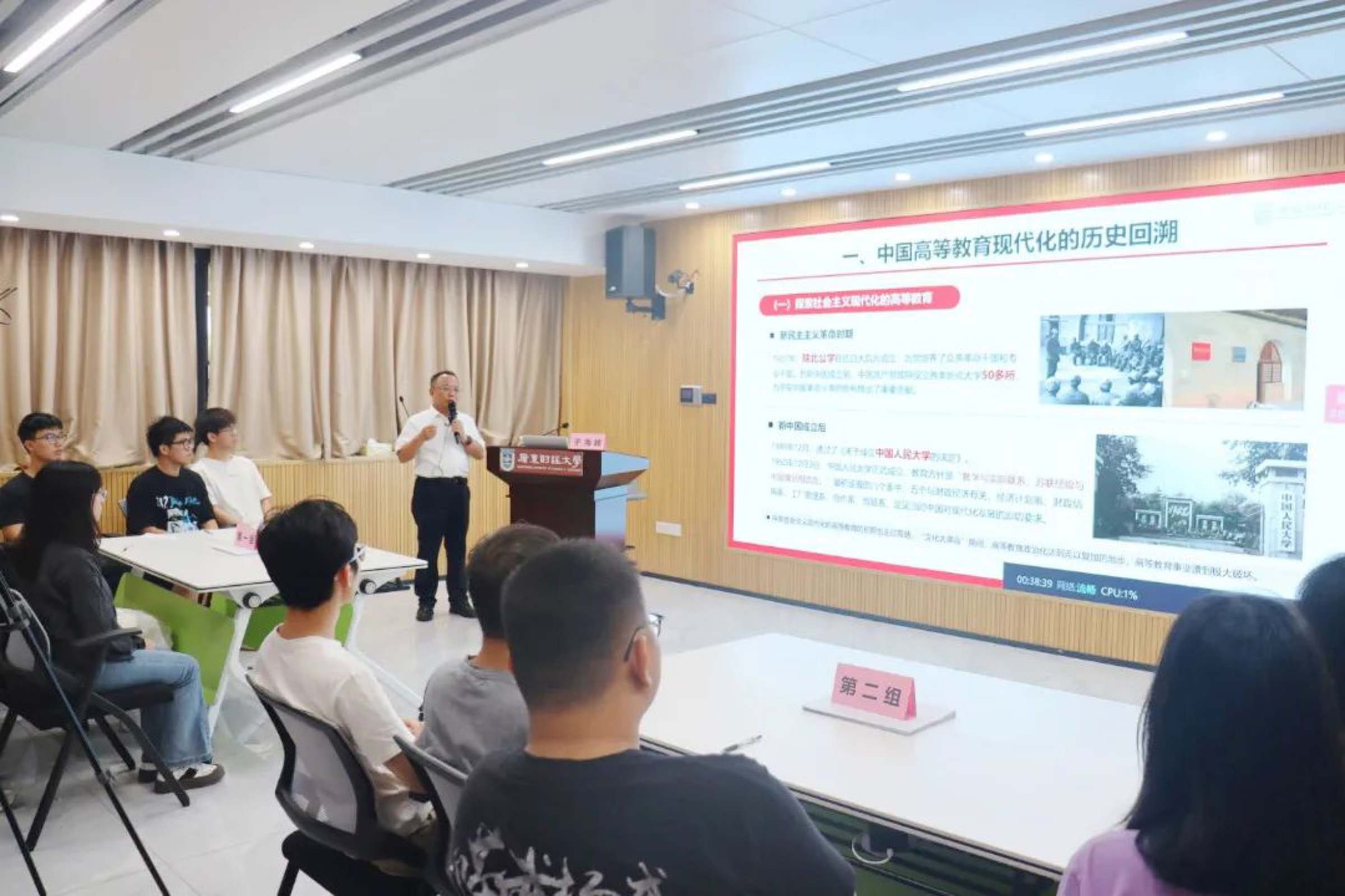 于海峰作课堂总结。他表示同学们对高等教育现代化进行了充分的课前学习和深入思考,能够将自身的成长成才融入中国式高等教育现代化的伟大实践中去,他希望大家发扬主人翁精神,共同为大湾区一流财经大学的建设贡献自己的力量。