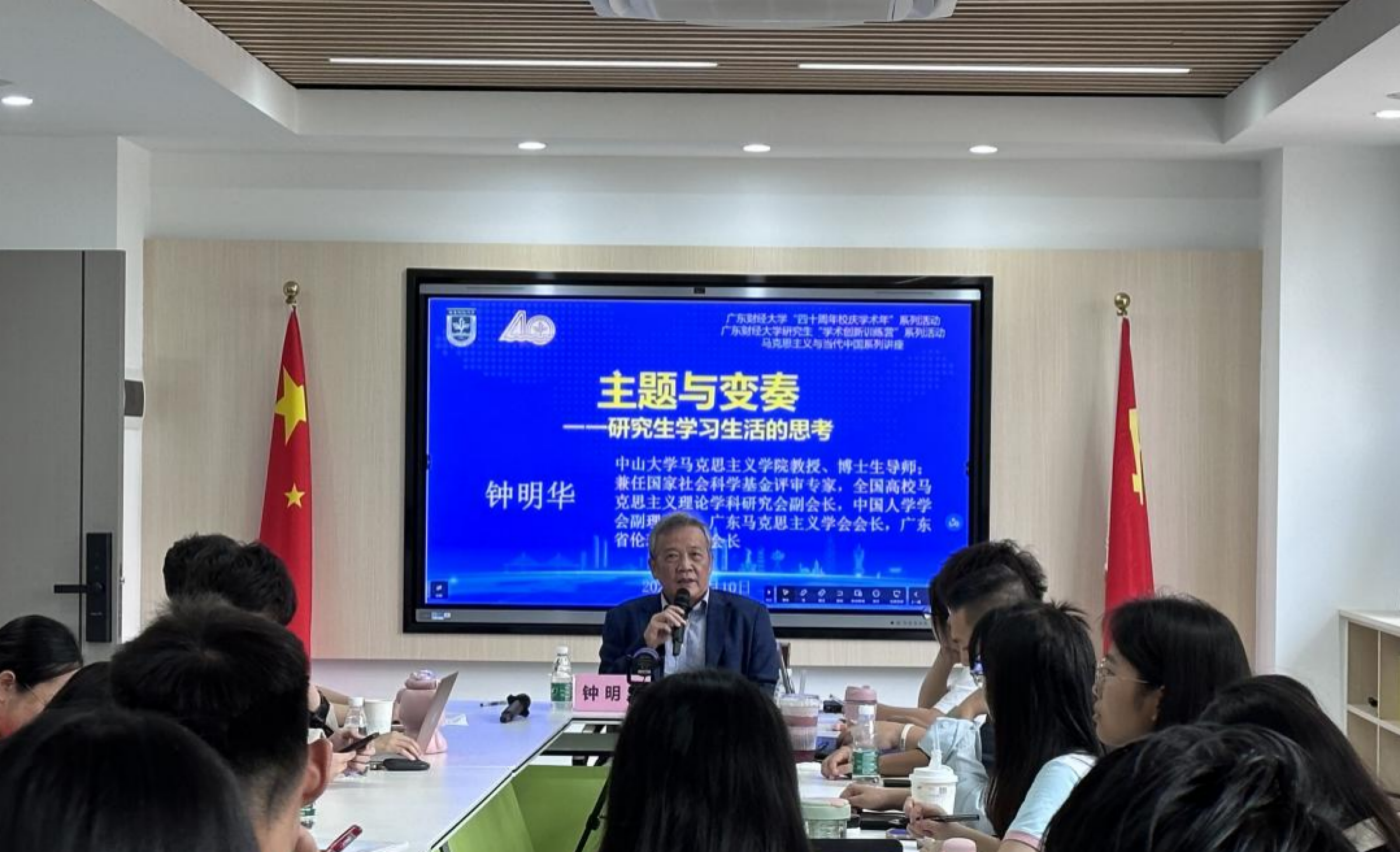 为促进研究生更好规划学业生涯,10月10日下午,马克思主义学院与研究生院在广州校区立德楼105青年研习馆,联合举办第32期“马克思主义与当代中国”系列讲座暨研究生“学术创新训练营”系列活动,由全国高校马克思主义理论学科研究会副会长、中山大学马克思主义学院原院长、博士生导师钟明华教授主讲题为“主题与变奏——研究生学习生活的思考”的学术讲座。本次讲座以线上线下同步进行的方式进行,由马克思主义学院副院长陶日贵教授主持,马克思主义学院师生和学校各学科专业研究生近100人参加本次讲座。