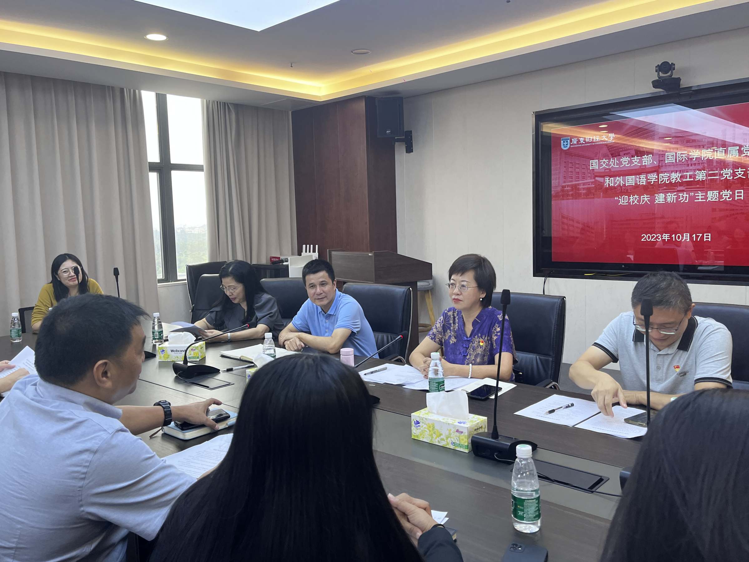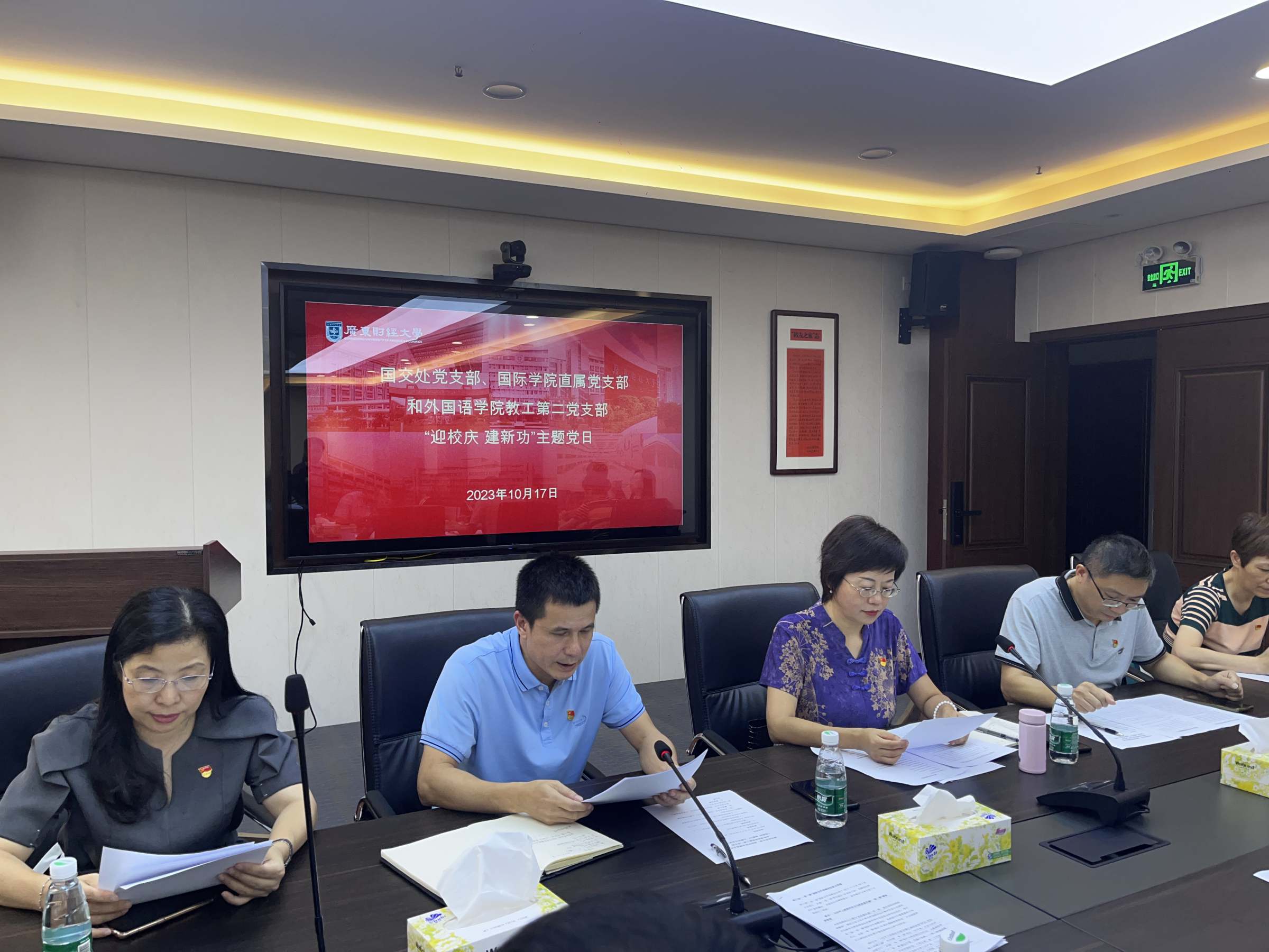 10月17日下午,国际学院直属党支部联合国交处党支部、外国语学院教工第二党支部在广州校区北二931多功能报告厅开展“迎校庆、建新功”主题党日活动。国际学院直属党支部、国交处党支部、外国语学院教工第二党支部全体党员参加,活动由国交处党支部书记王宇晖主持。