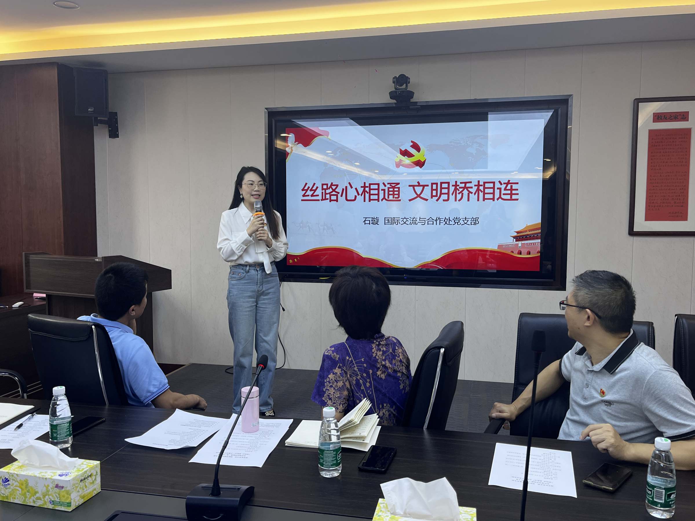 活动第一项由国交处党支部石璇老师讲授微党课。10月17日恰逢第三届“一带一路”高峰论坛开幕,石璇结合具体工作实际以“思路心相通、文明桥相连”为题讲授微党课,她从什么是“一带一路”切入,介绍了“一带一路”的丰硕成果,围绕我校留学生眼中的“一带一路”,讲述我校留学生的中国故事。她介绍了国际交流与合作处组织来华留学生开展了丰富多样的文化体验、教育培训等活动,促进不同文明交流互鉴,并向大家展示了我校留学生以微纪录片等形式,用多种语言讲述中国故事、传播中国声音,向世界展现可信、可爱、可敬中国形象的视频。