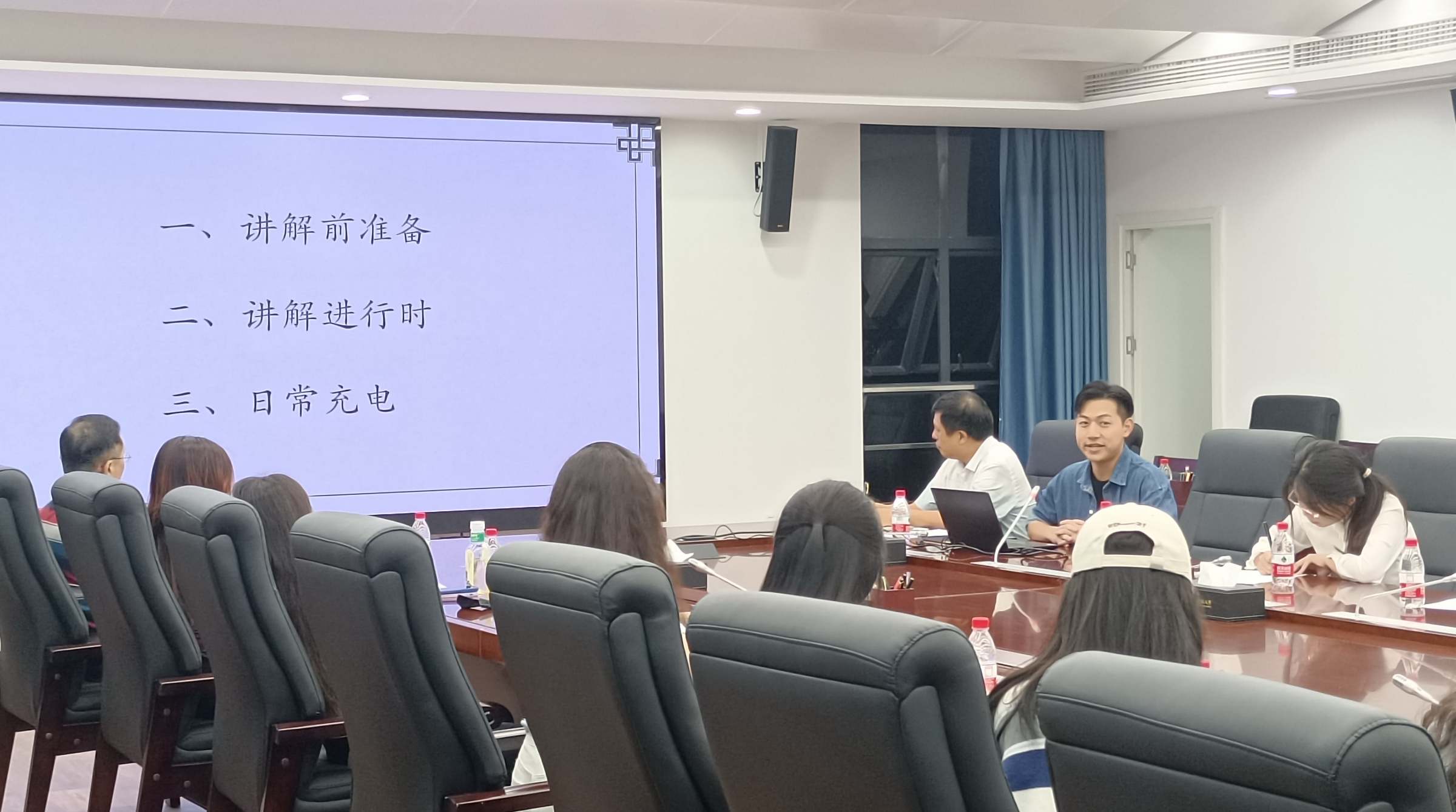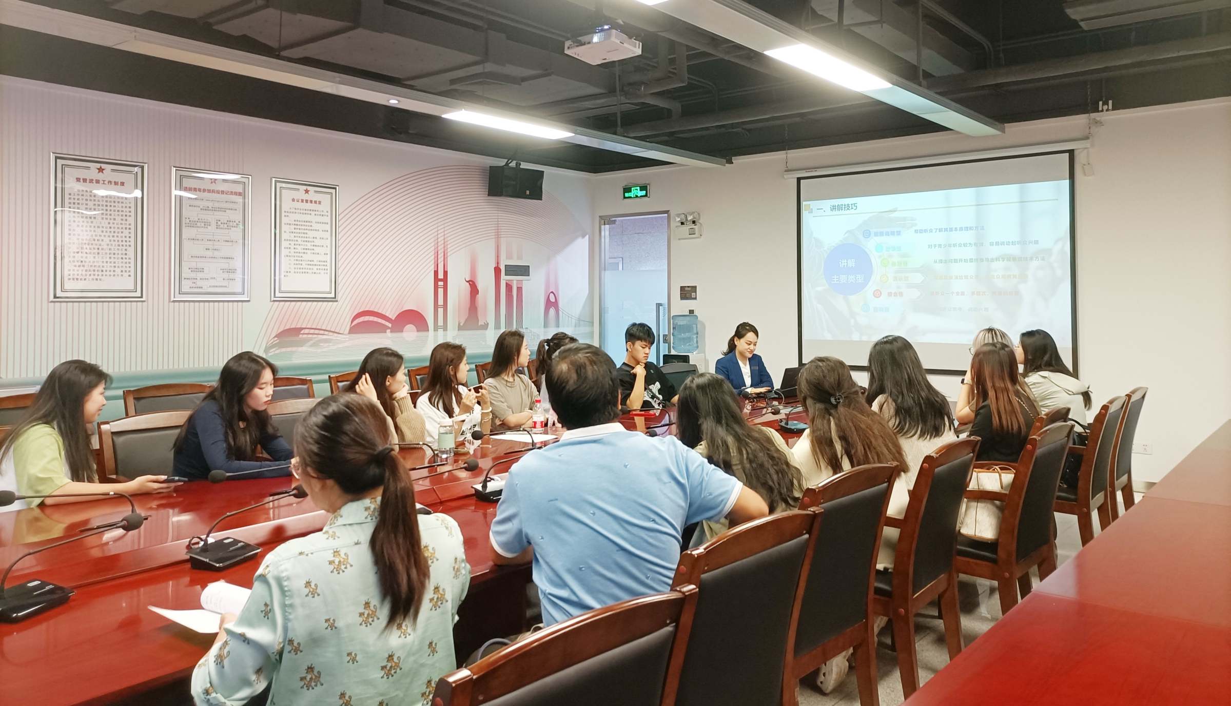 10下午,讲解团队师生前往广东外语外贸大学校史馆参观,听取该校校史馆讲解的现场讲解,并就如何做好校史讲解工作进行交流探讨。当天晚上进行了校史讲解员专业培训,广东省博物馆资深讲解员苏梓枫担任讲解导师。他从讲解内容的选择、讲解语言的运用、声音技巧与礼仪规范等方面,详细讲解了校史讲解的技巧和方法。全体讲解员实地参观了我校建设布展中的校史馆展厅,学习和感受我校校史馆设计的理念和布局。