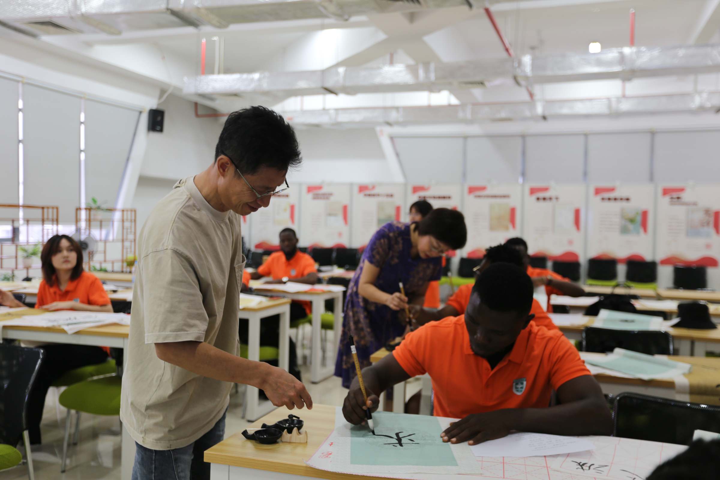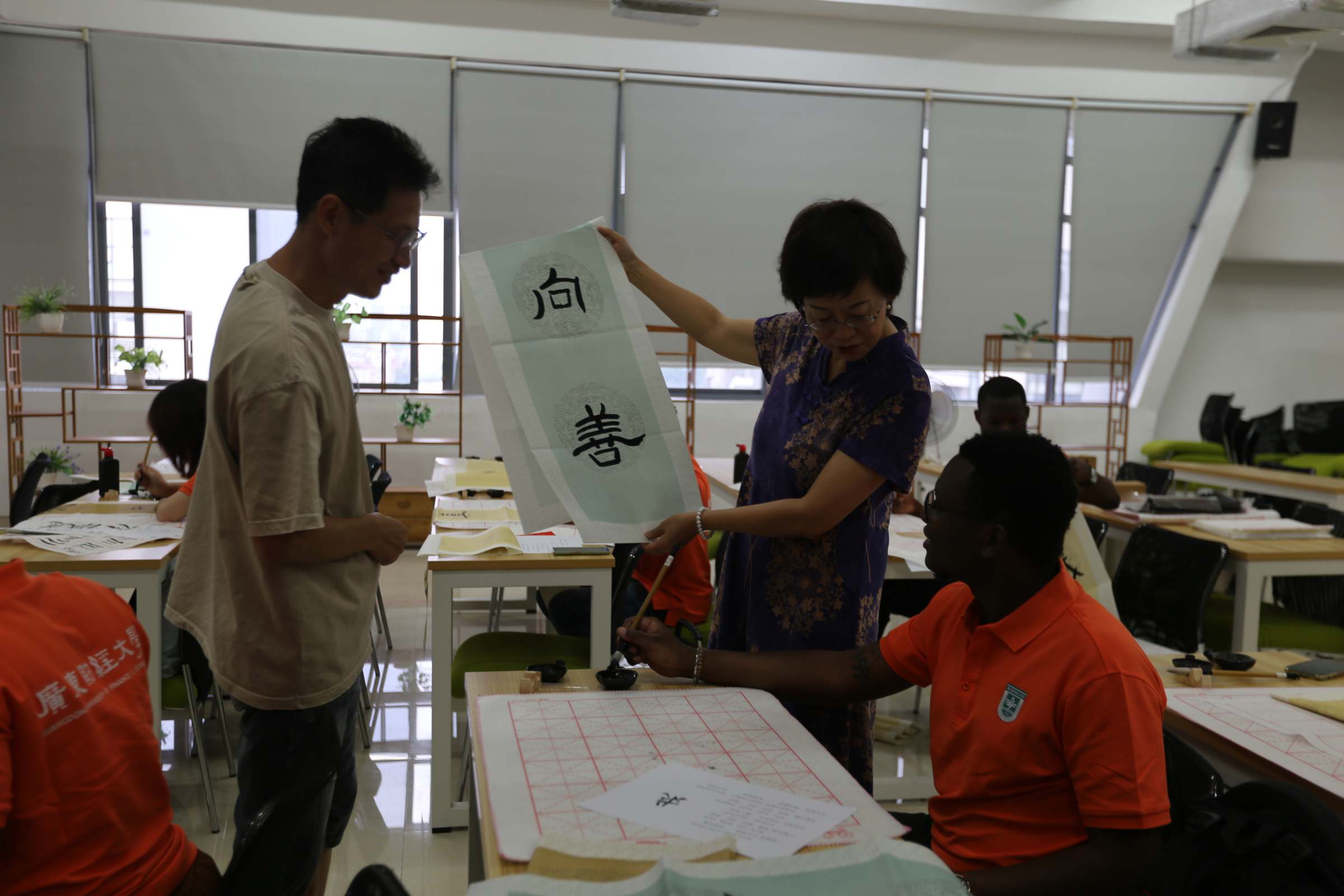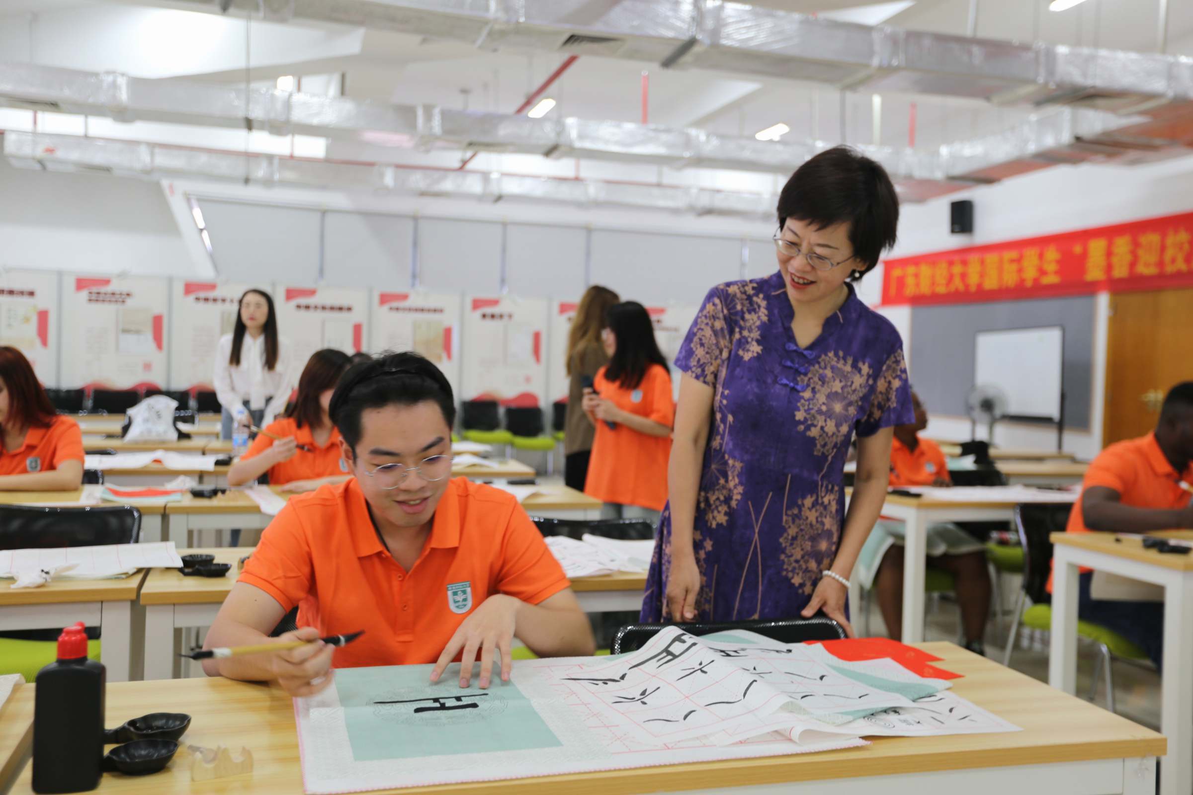 罗志强从写书法的坐姿、握笔的姿势、隶书字体的发展历史、书写特点和价值意义进行了详细讲解。通过教学“三”、“上”、“十”、“平”、“中”、“章”、“六”、“八”等字,让国际学生练习隶书横、竖、点、撇、捺等笔划,以及蚕头雁尾的书写方法,让国际学生在书写中感受书法的魅力和其极高的艺术价值。然后以广财精神“正心诚意、求真向善”几个字为重点,解释了每个字蕴含的深刻意义,并示范教学了每个字的笔划、书写顺序、下笔特点等。