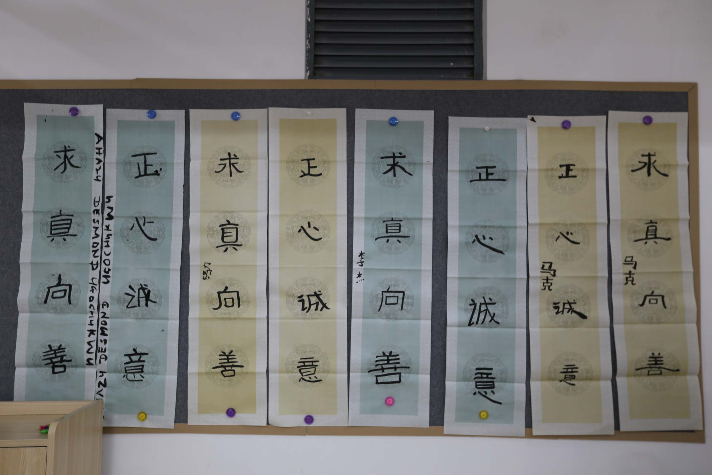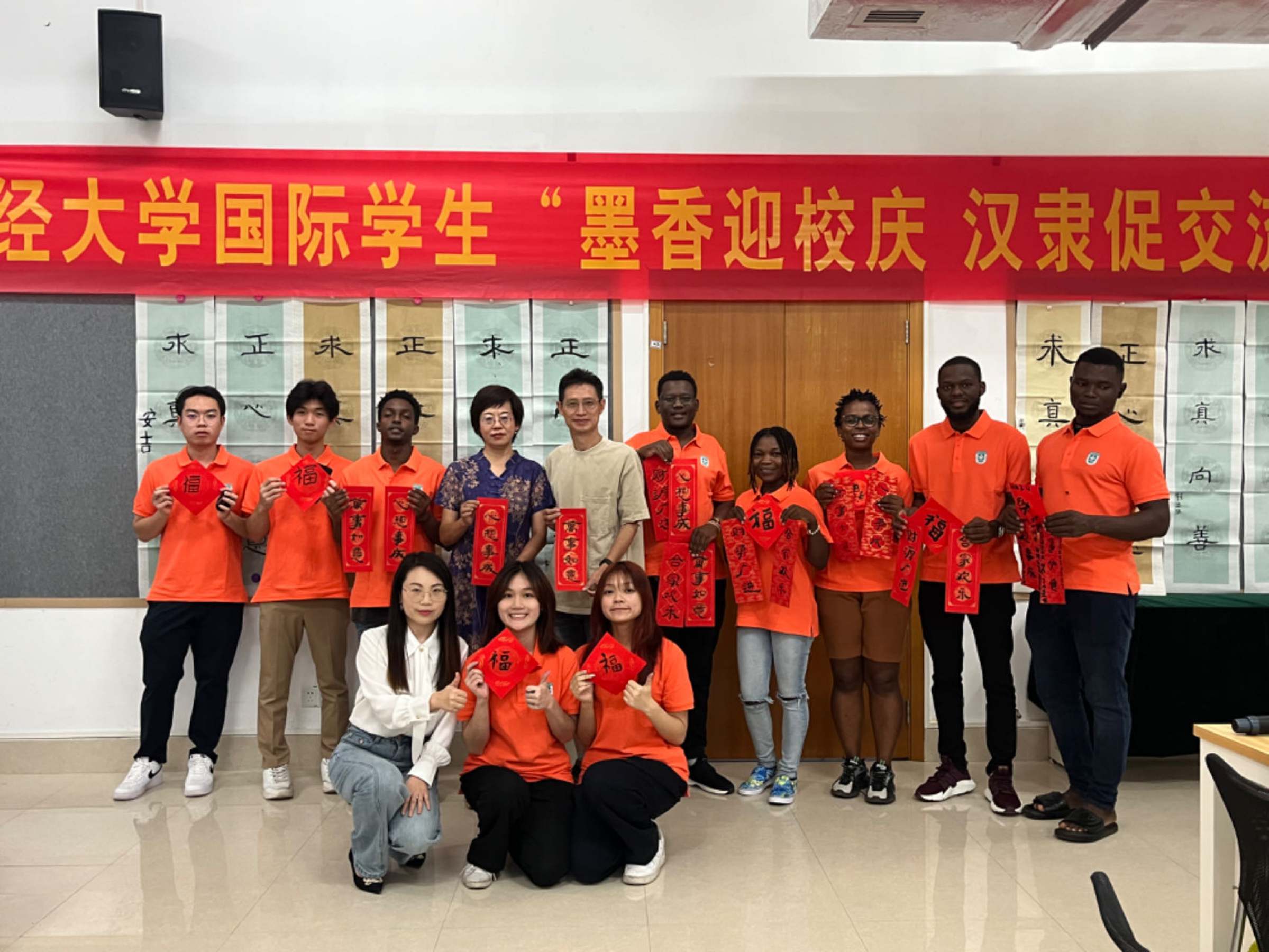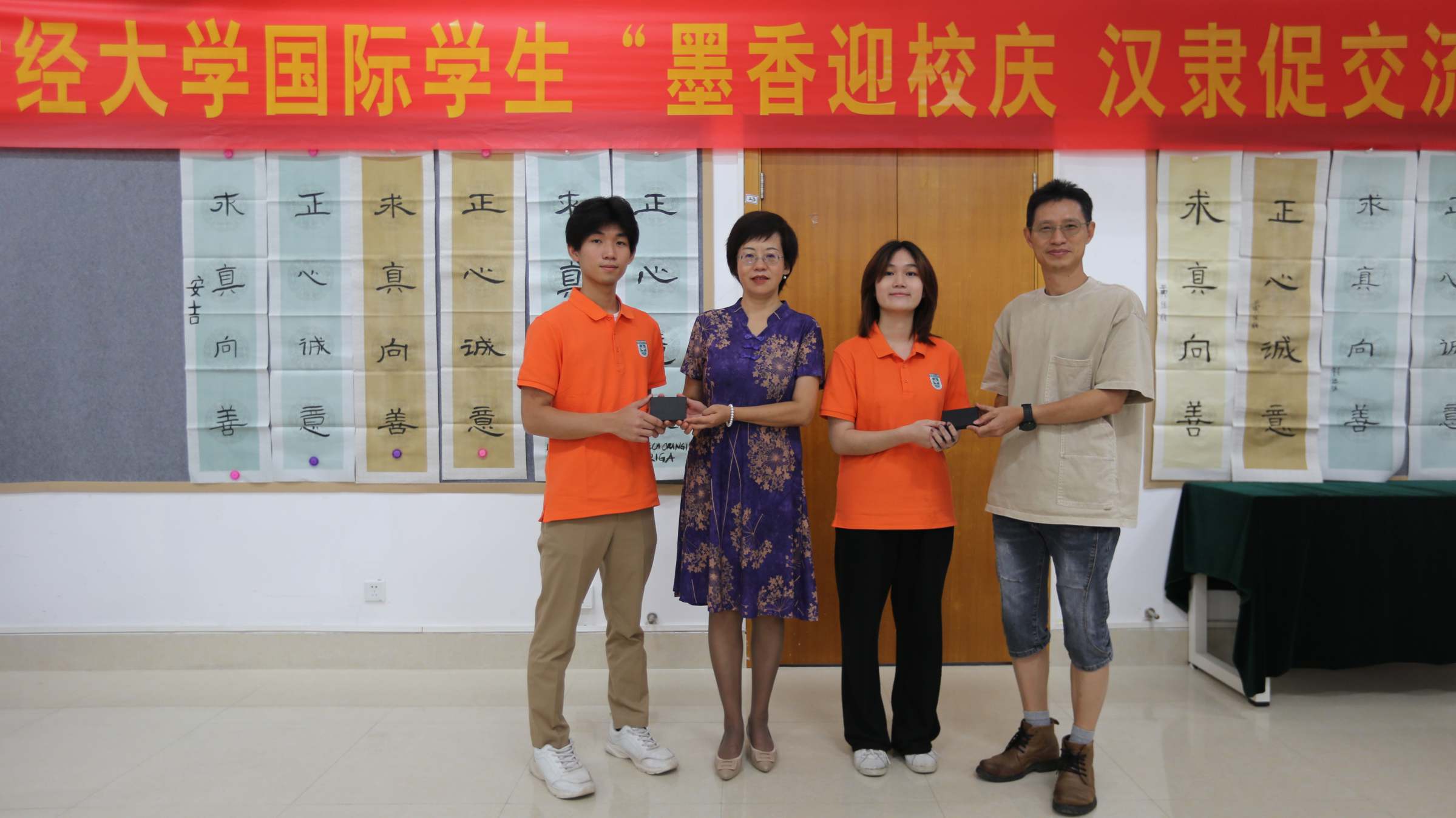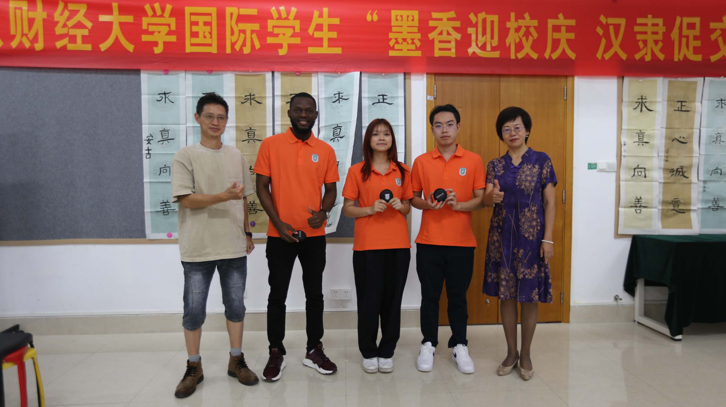 通过专业教学后,国际学生每人用一副四言对联书写广财精神的八个大字,写完后由书法老师进行评审。最终,来自肯尼亚的学生Lamech Orangi Mariga获得一等奖,Tanyaporn Visitcharoen(黄佳丽,泰国籍)和Jing Kiongjing Chieng(钱进强,马来西亚籍)获得二等奖,Miminthorn Nangngam(陈娟月,泰国籍)、Keeta Ratanasachol(李杰,泰国籍)、Thomas Oduro Dwumah(努力,加纳籍)获得三等奖。最后国际学生纷纷写下对联,为学校40周年校庆送上最真挚的祝福。
