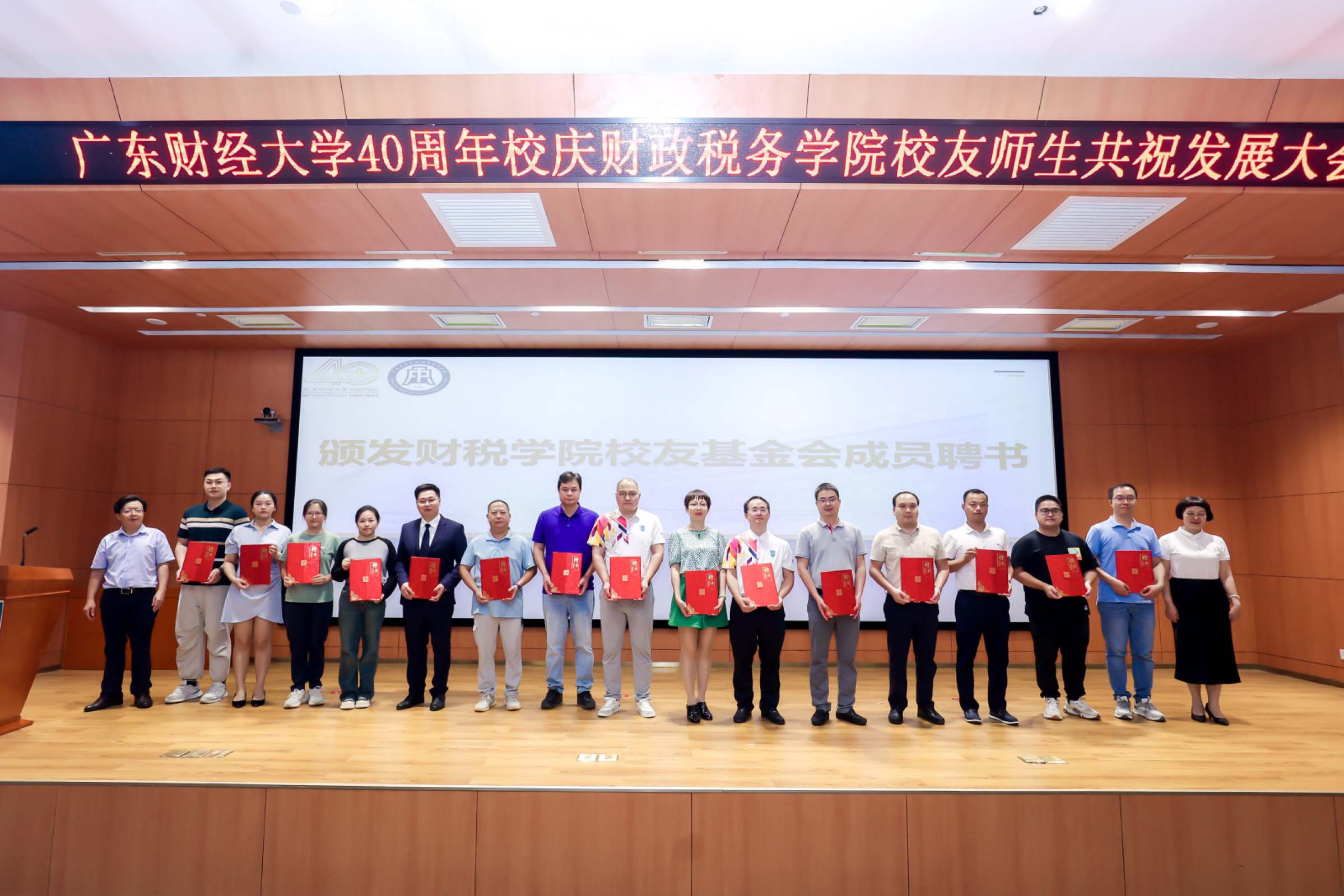 10月28日下午, 建校40周年财政税务学院校友师生共祝发展大会在正心堂举行。 校长于海峰,原税务系(财税学院)退休老领导王学礼、吴祥水、谢访春,原税务系教师朱危安、张新,退休老教师谭楚玲、邓桂环、谢百娥、伍春梅,知名校友清远市人大常委会党组副书记、副主任刘汉球,国家税务总局广东省税务局党委委员、总会计师林敬忠、总审计师陈少明,国家税务总局佛山市税务局督办曾军,国家税务总局深圳市南山区税务局党委书记、局长、督办蔡伟群,全国十大杰出青年卫士卢伟雄,深圳市厚德书院创始人黄小羽,宝盛国际ICC创新中心董事长陈伟,财政税务学院领导班子、校友、在校师生代表共400多人参加了大会。大会由校友李悦媛、黄博宇主持。