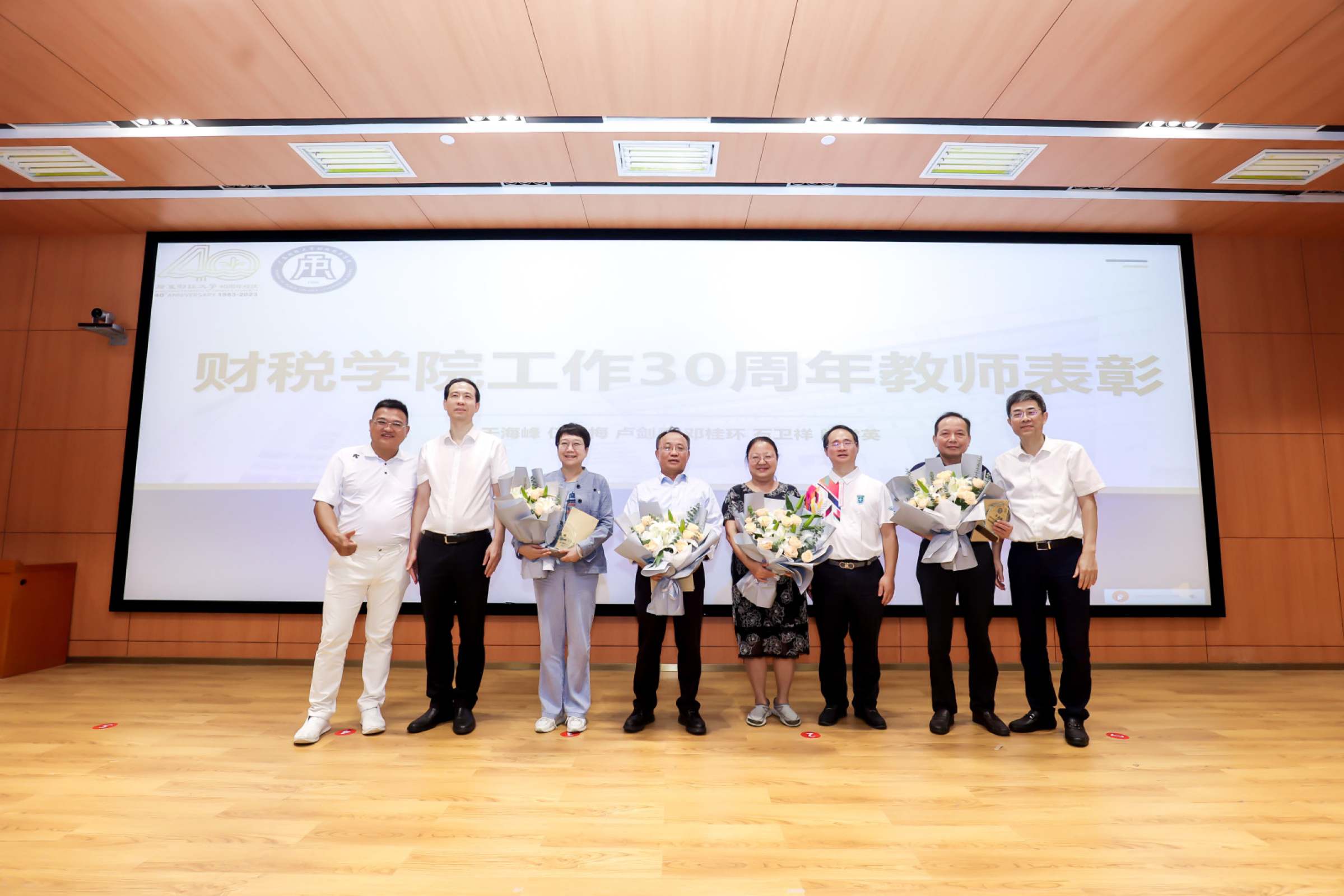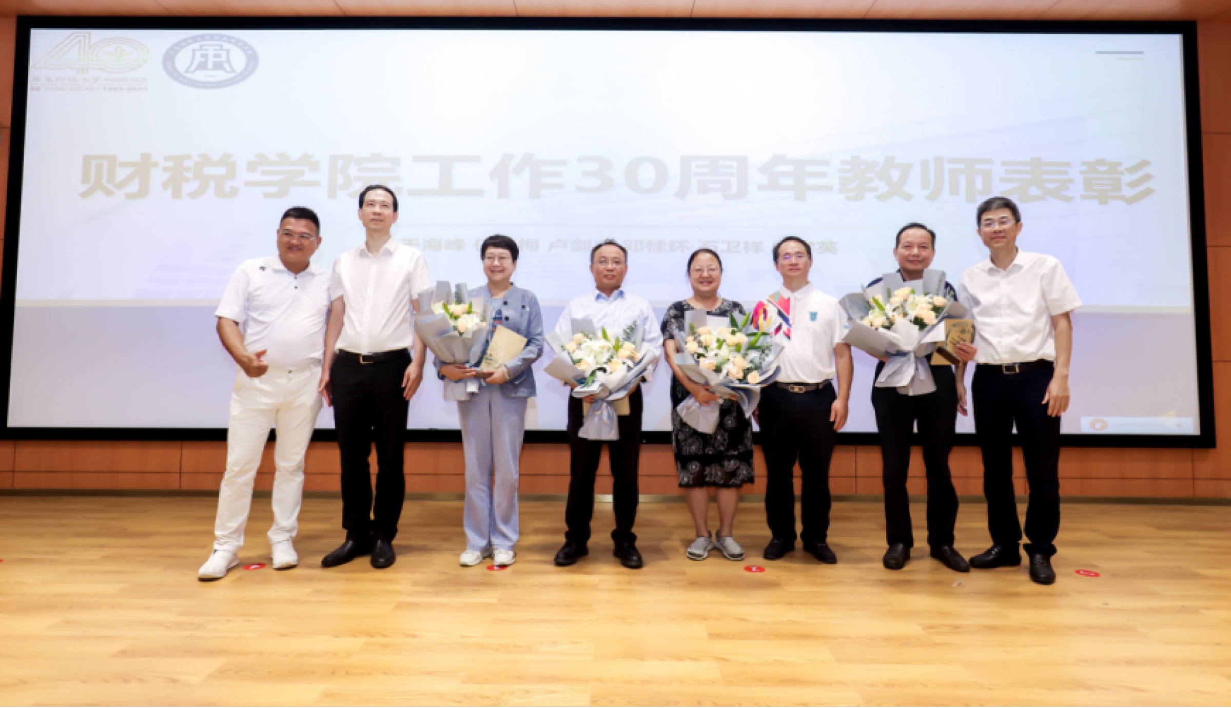财税校友基金会对在财税学院从教30周年的优秀教师进行表彰,他们是于海峰、卢剑灵、邓桂环、伍春梅、石卫祥、闫学英,校友代表林敬忠、黄小羽、陈少明、赖国华上台,为到场的四位老师送上奖牌、慰问金和鲜花。