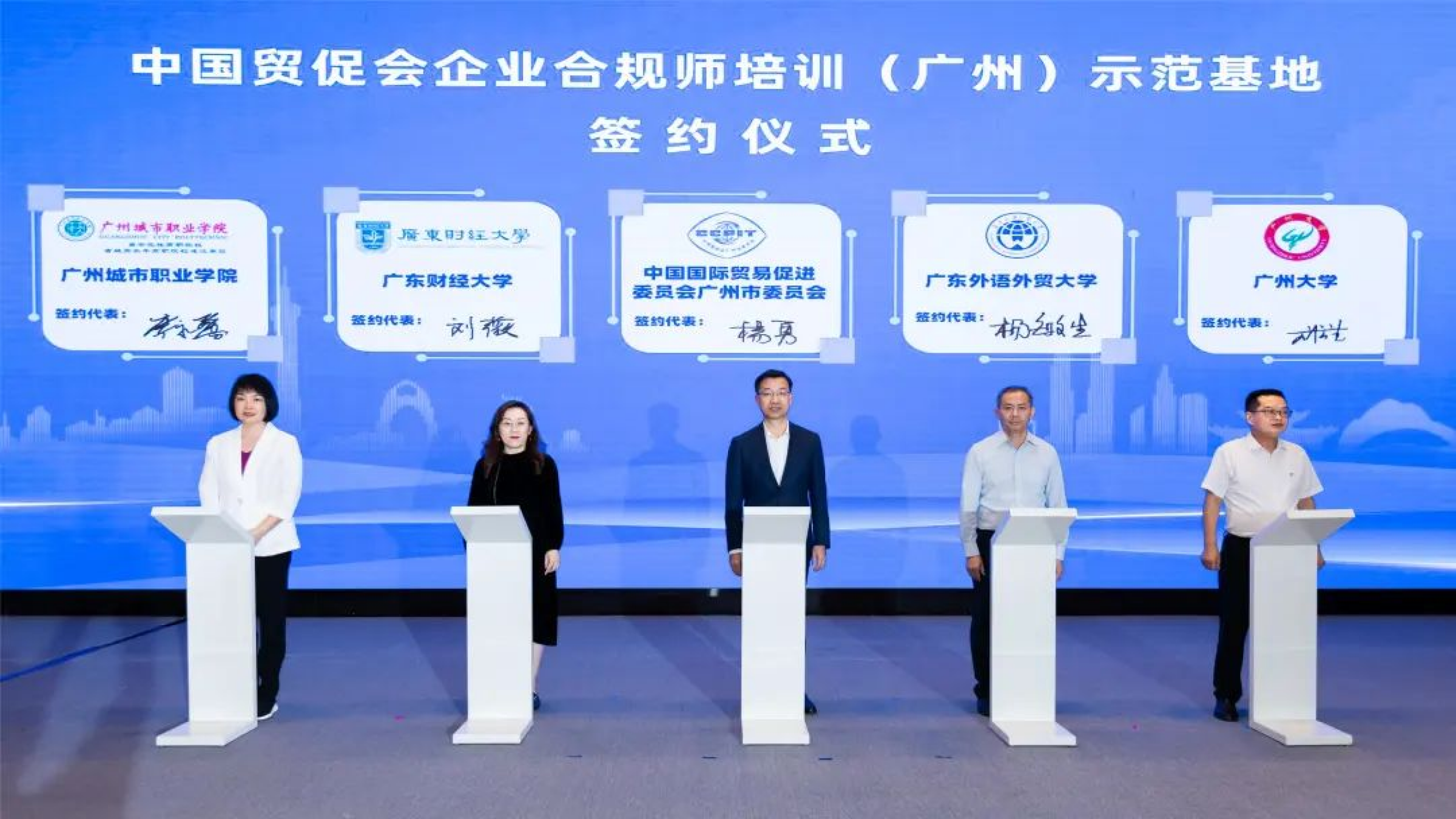 会上,法学院副院长刘薇现场签订了中国贸促会企业合规师培训(广州)示范基地共建合作协议。