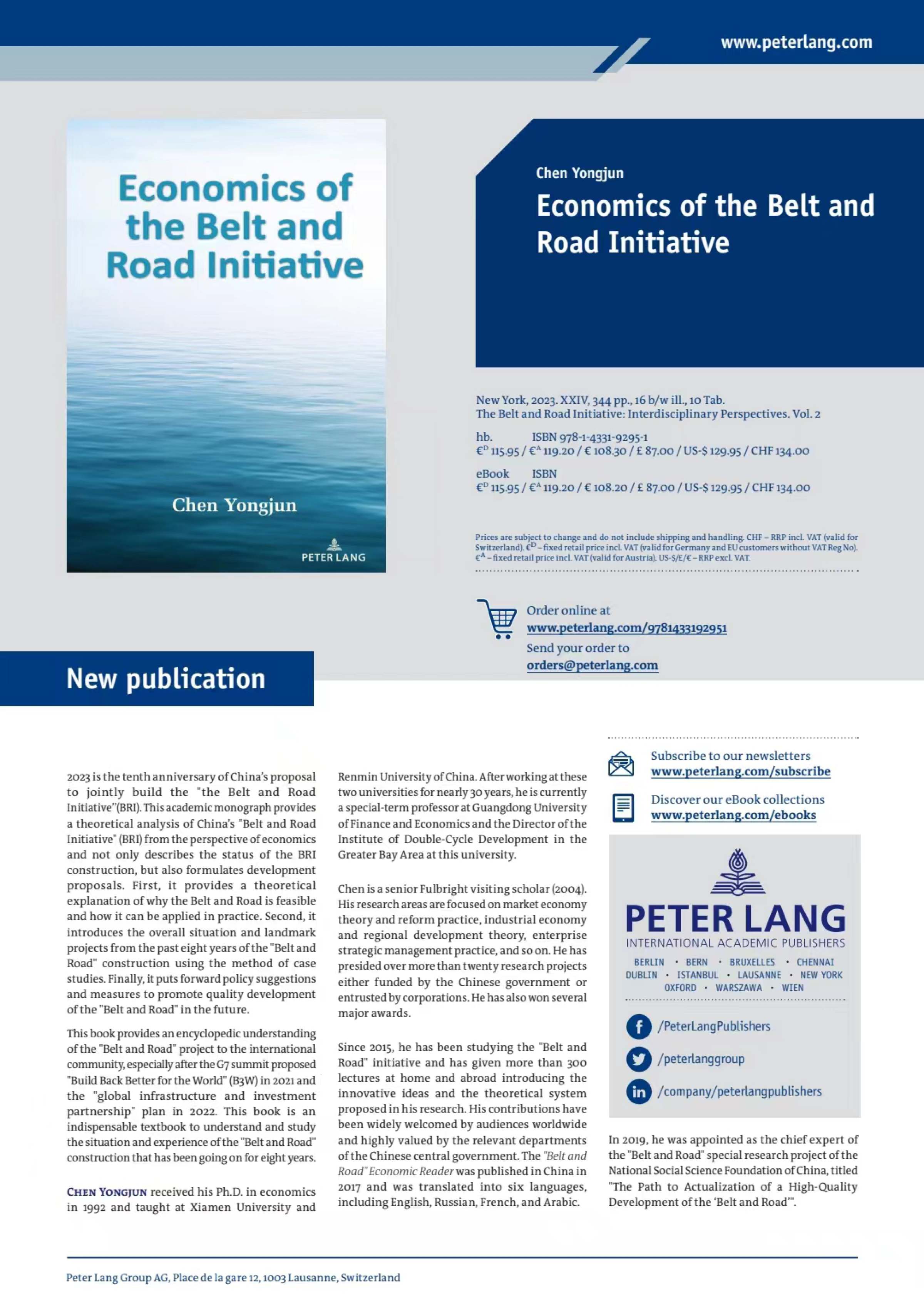 《“一带一路”经济学》围绕“一带一路”为什么“能”?怎么才能“行”?如此的问题“导向”,以经济学的独特研究视角,对共建“一带一路”高质量发展的理论体系构建和实现路径设计进行了比较全面和深入的研究,从理论、政策和具体路径等方面进行了比较深入详细的讨论分析,向国际社会介绍了做好共建“一带一路”作业的“答案”。该书于2023年9月由美国Peter Lang出版公司英文出版,向全世界发行。