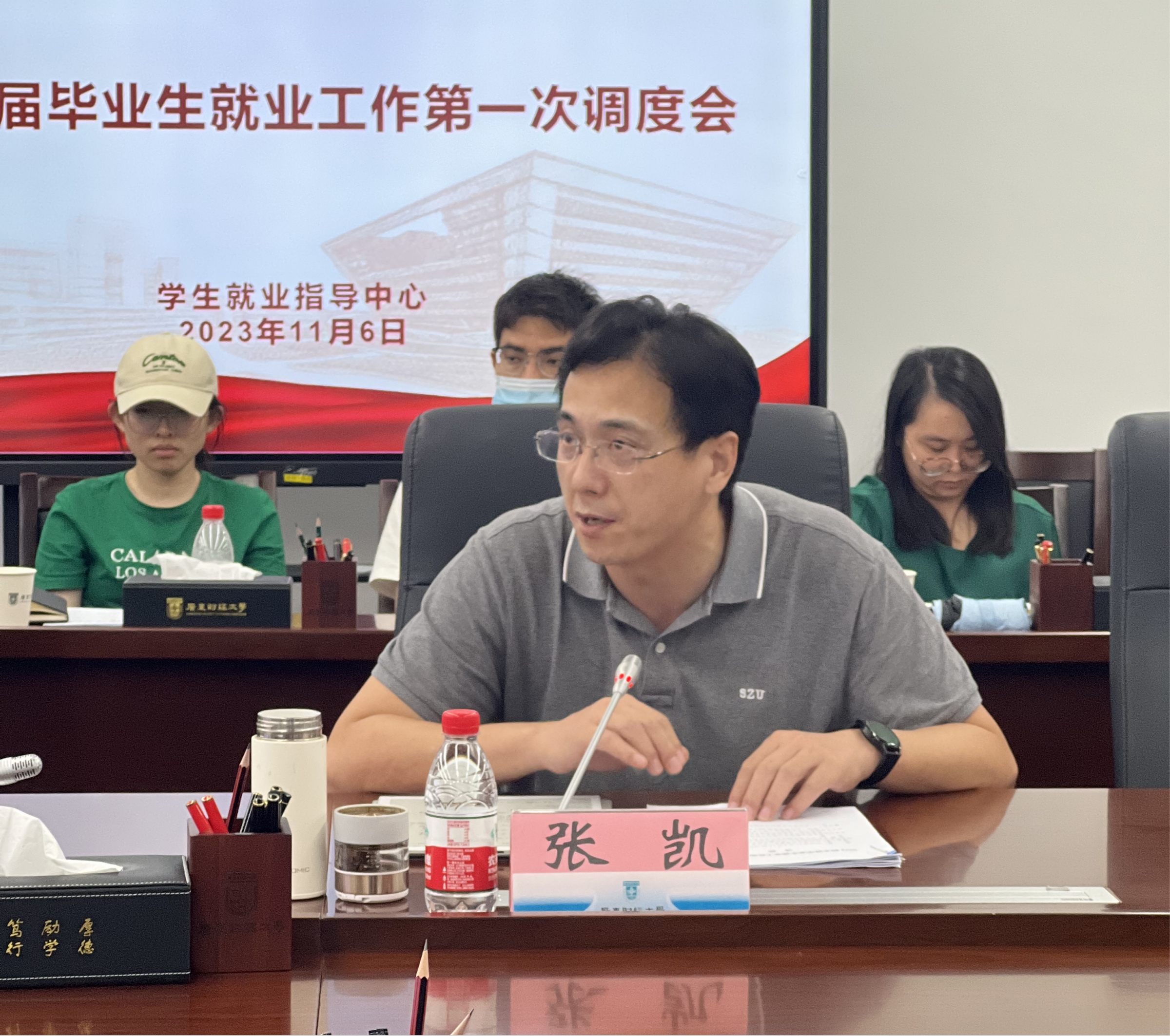 张凯肯定了学生就业指导中心和各学院为就业工作付出的努力和作出的贡献。他指出,高校毕业生就业工作本质上是育人工作,毕业生就业状况是检验学校人才培养质量的重要标尺,是招生就业人才培养互动机制中的重要一环。当前,我校毕业生就业工作任务依然艰巨繁重,就业工作压力大,要结合实际,精准施策,奋力推进毕业生就业工作。一要精准拓岗,挖潜优质就业资源。主动“走出去”,持续深入开展“访企拓岗促就业”专项行动;积极“请进来”,发挥好校园招聘促就业主渠道作用。二要精准指导,充分发挥学生“一站式”社区功能,开展针对性个性化求职指导,做实做细就业指导服务,营造良好就业氛围。三要精准帮扶,重点关注就业困难群体,对于就业焦虑和慢就业学生,做好“强信心”“暖人心”的就业帮扶。