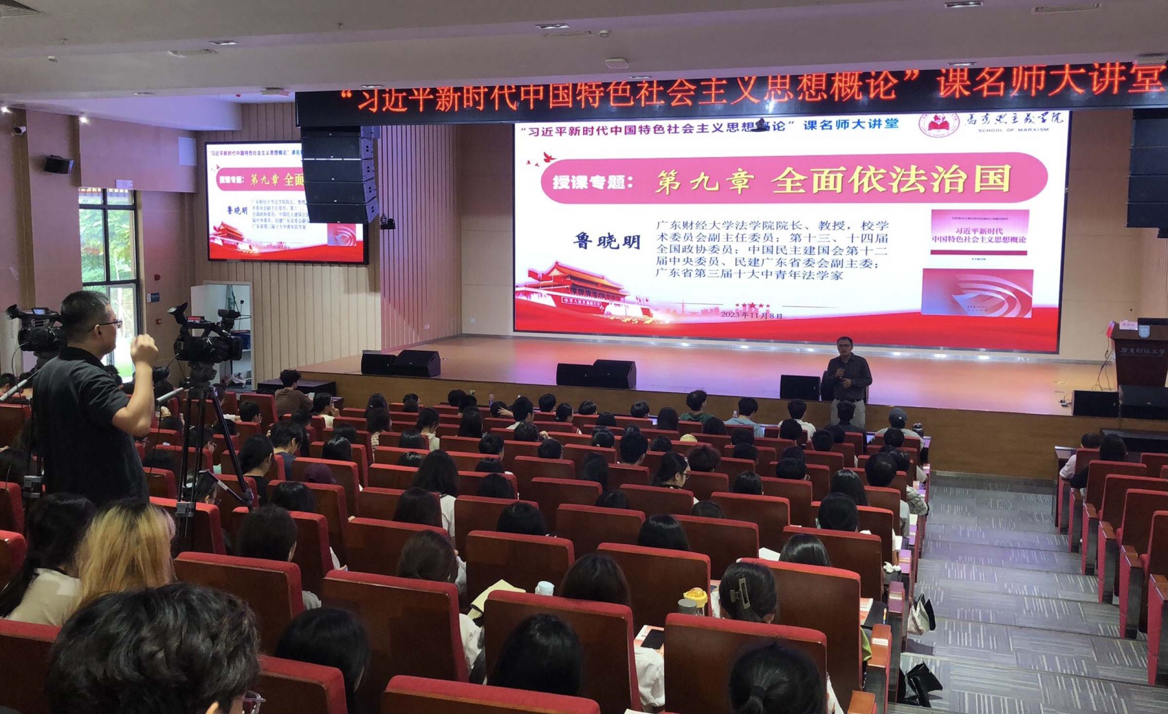 11月8日上午,在佛山校区同心楼报告厅,《习近平新时代中国特色社会主义思想概论》课名师大讲堂邀请法学院院长鲁晓明教授为2022级同学专题讲授“全面依法治国”。243名同学在现场大课堂上课,其他同时段上课的广州校区同学以观看现场直播方式参与学习。大讲堂由马克思主义学院副院长孙晓晖教授主持,学院党委书记张小洁及现场班级的带班老师郑健雄、仇小敏参加。